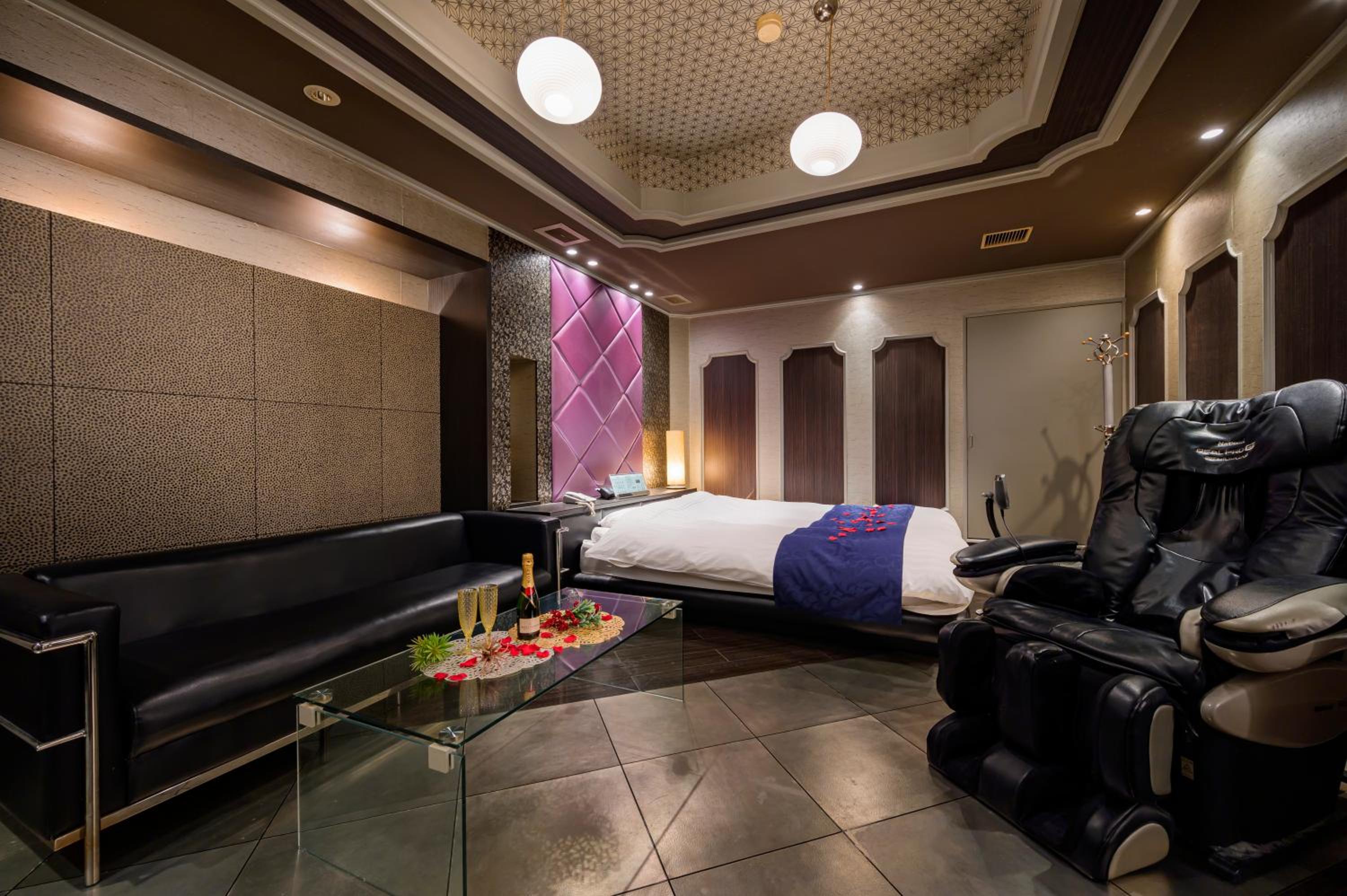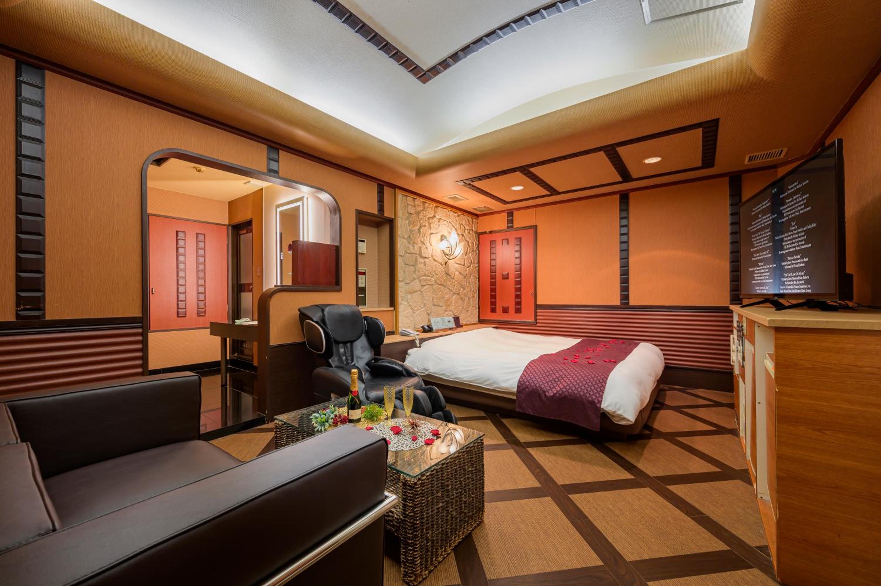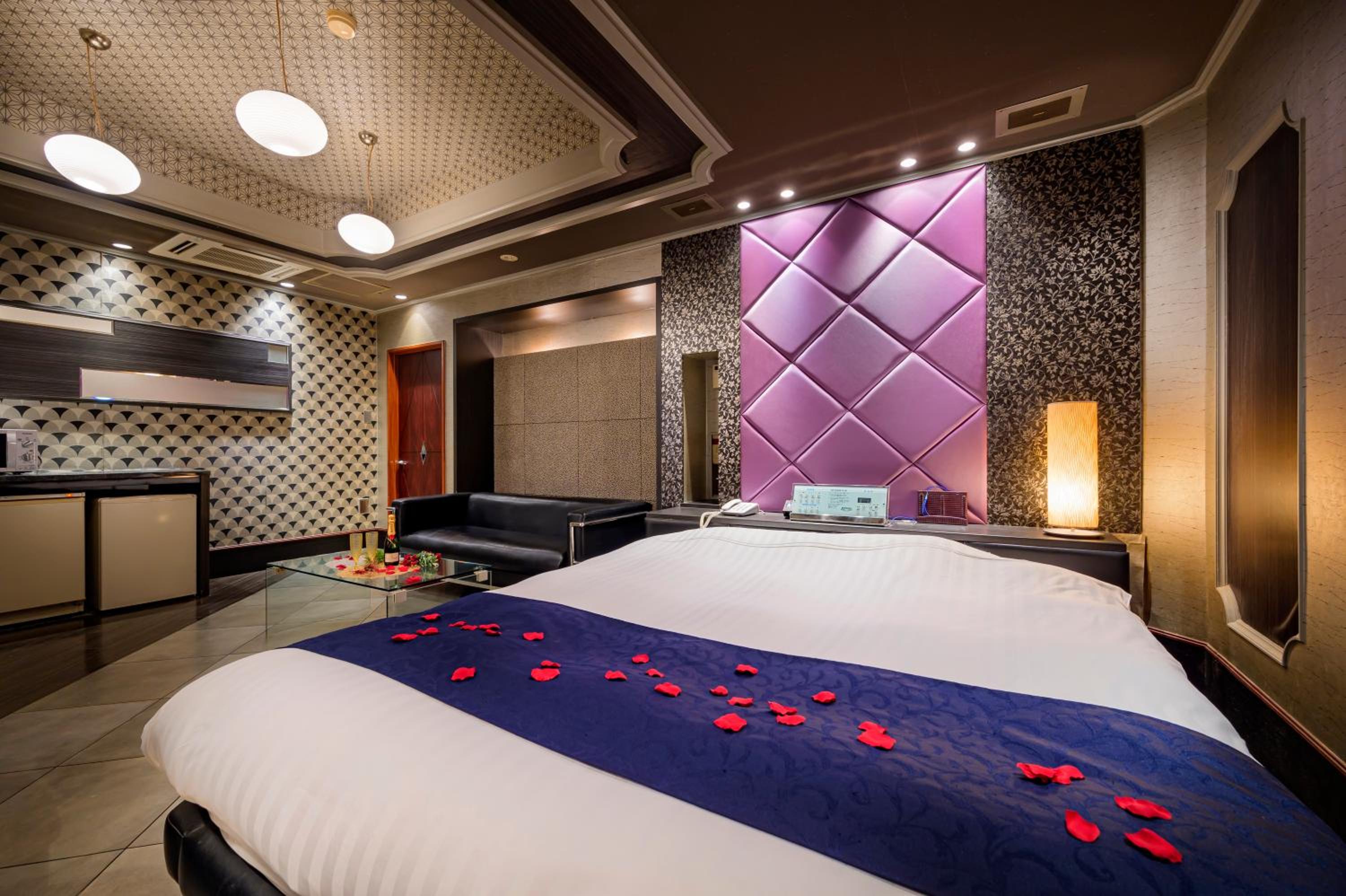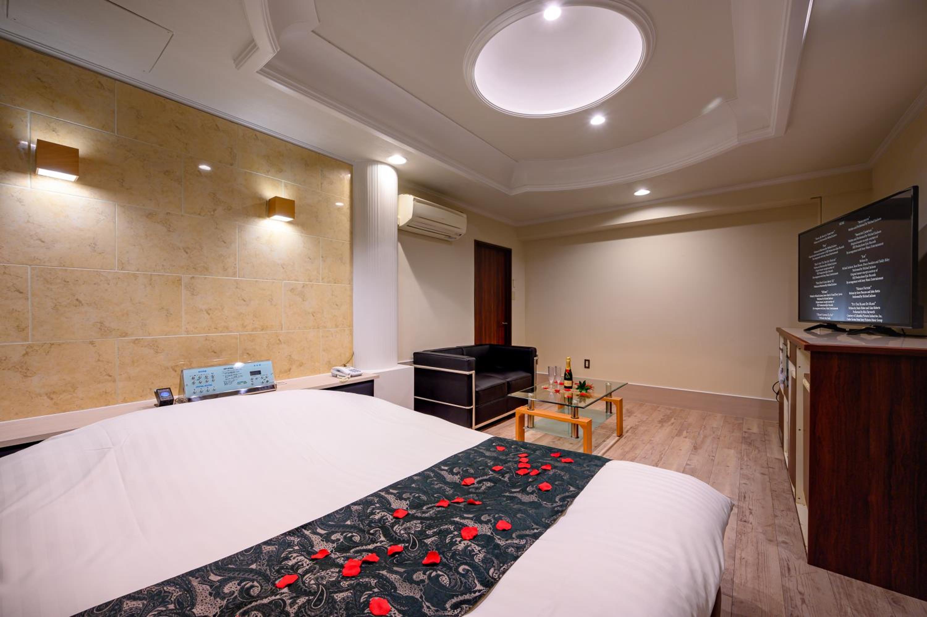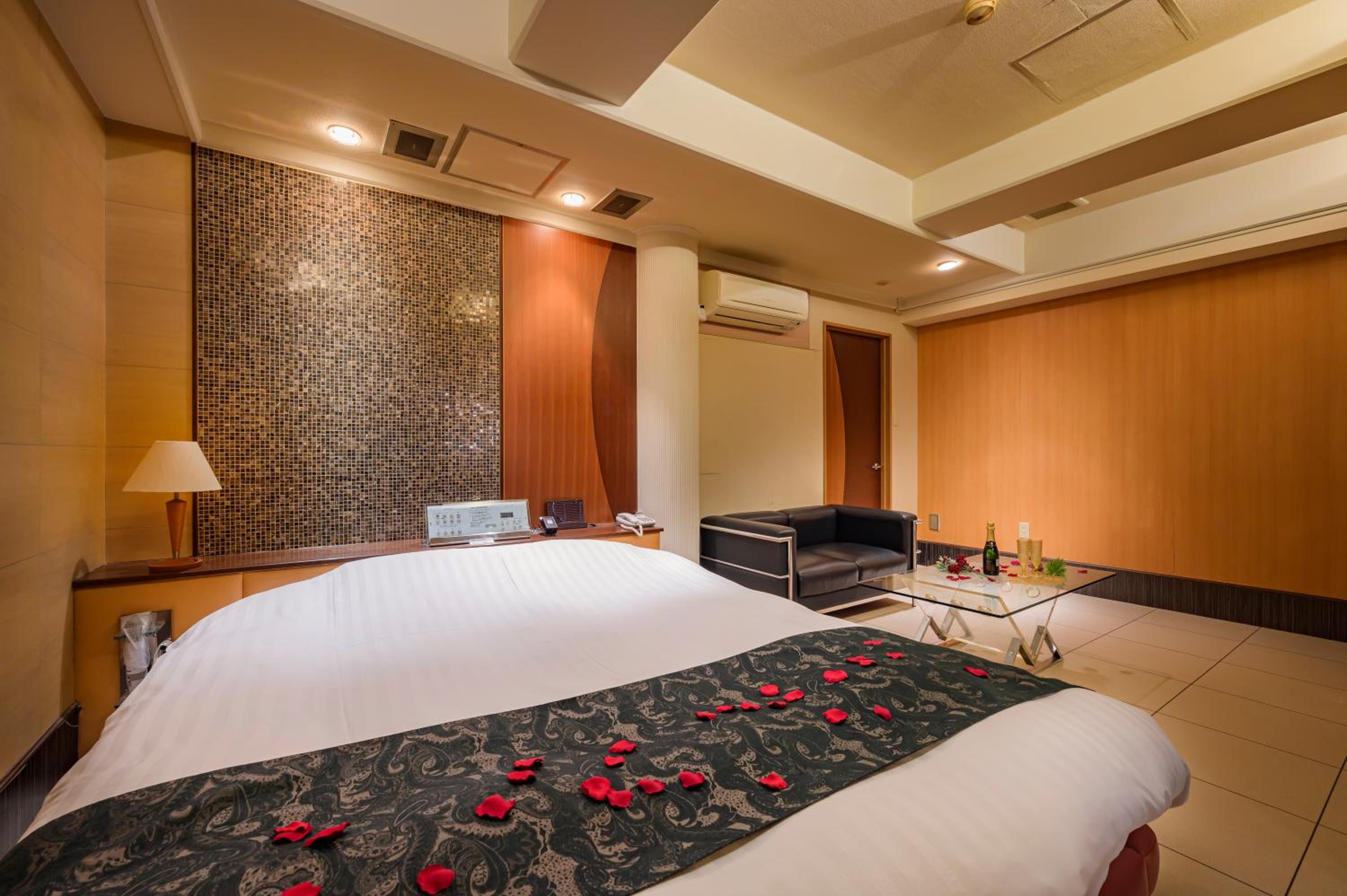 Each guest room at this love hotel is thoughtfully equipped with modern comforts such as air conditioning, a flat-screen TV, Blu-ray player, and a private bathroom with premium toiletries ensuring a comfortable and relaxing experience.