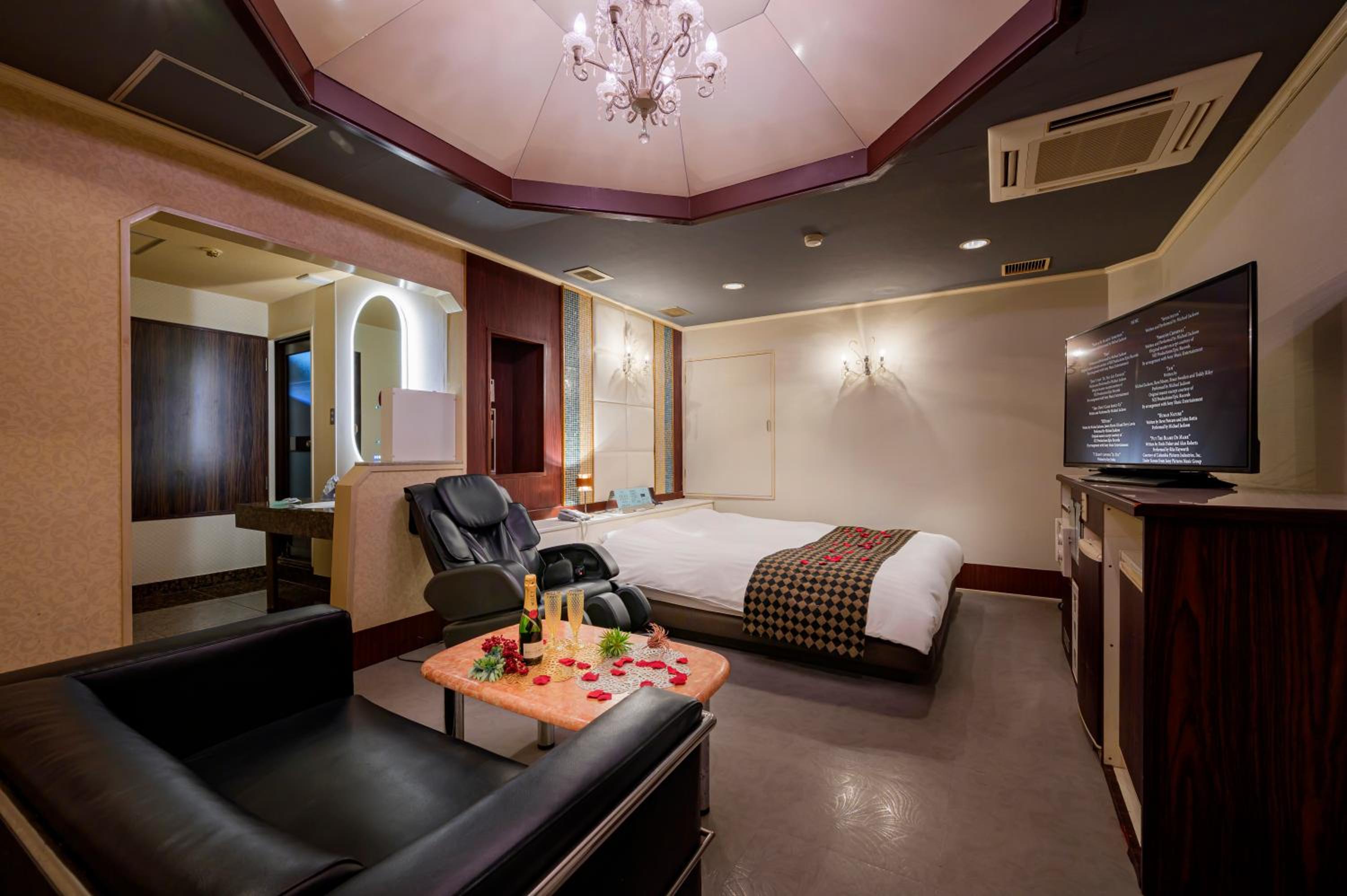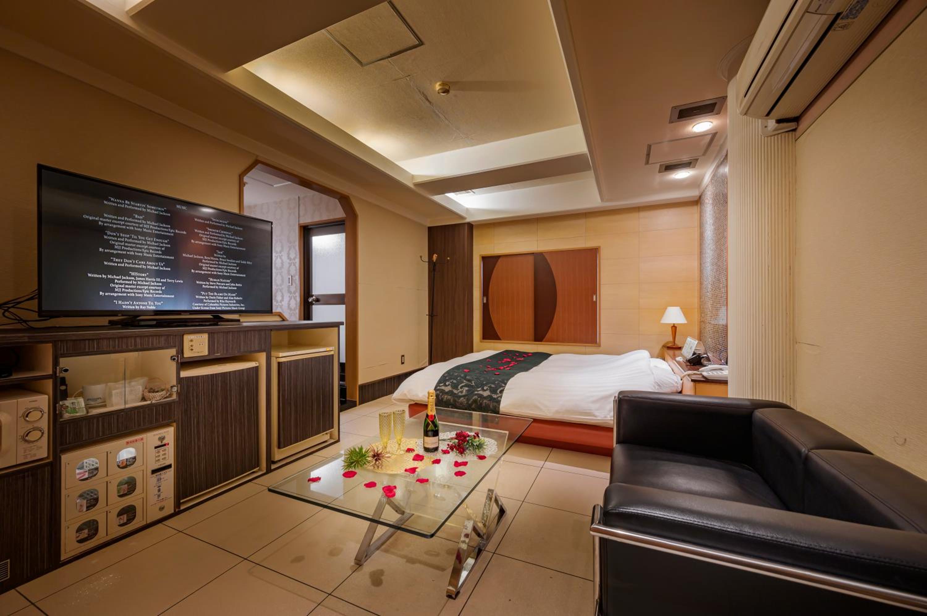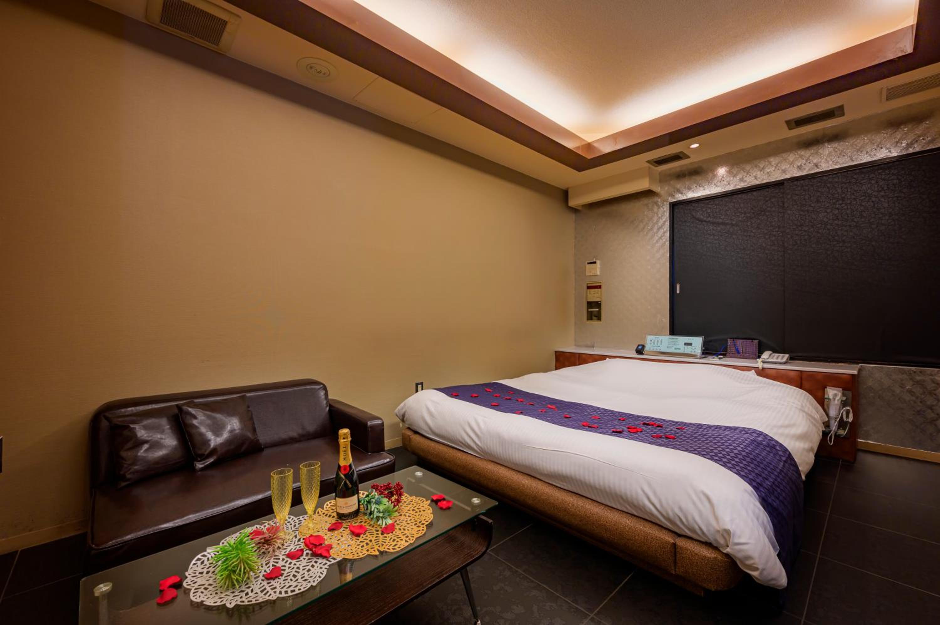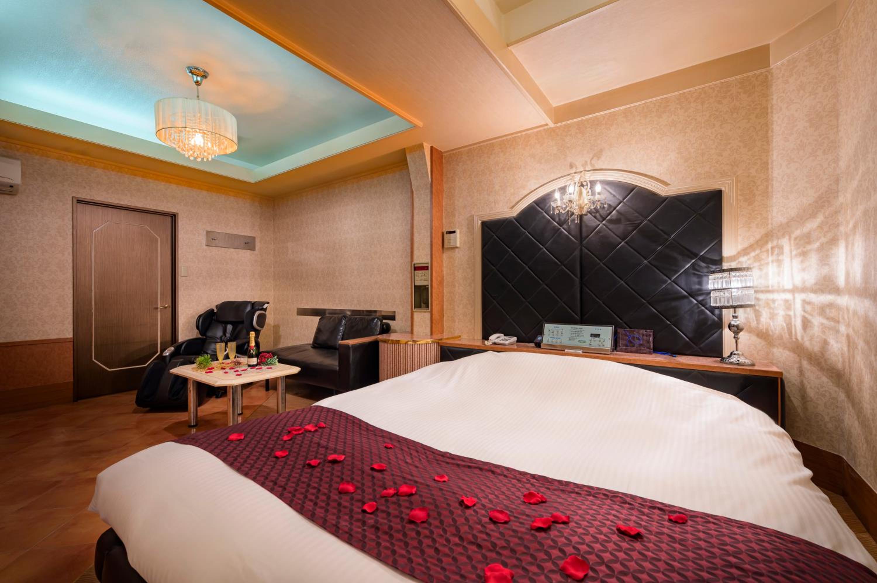 Each guest room at this love hotel is thoughtfully equipped with modern comforts such as air conditioning, a flat-screen TV, Blu-ray player, and a private bathroom with premium toiletries ensuring a comfortable and relaxing experience.