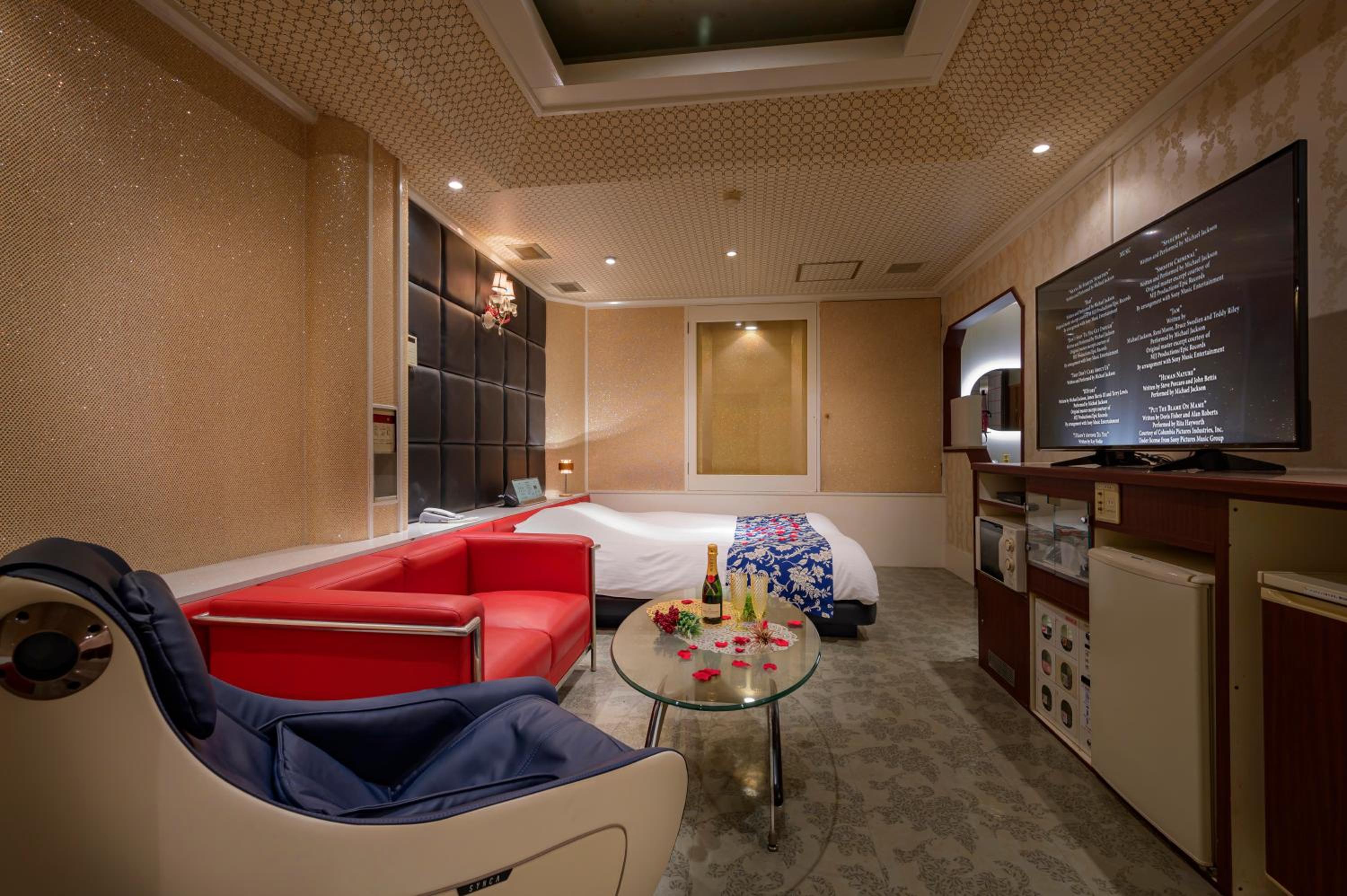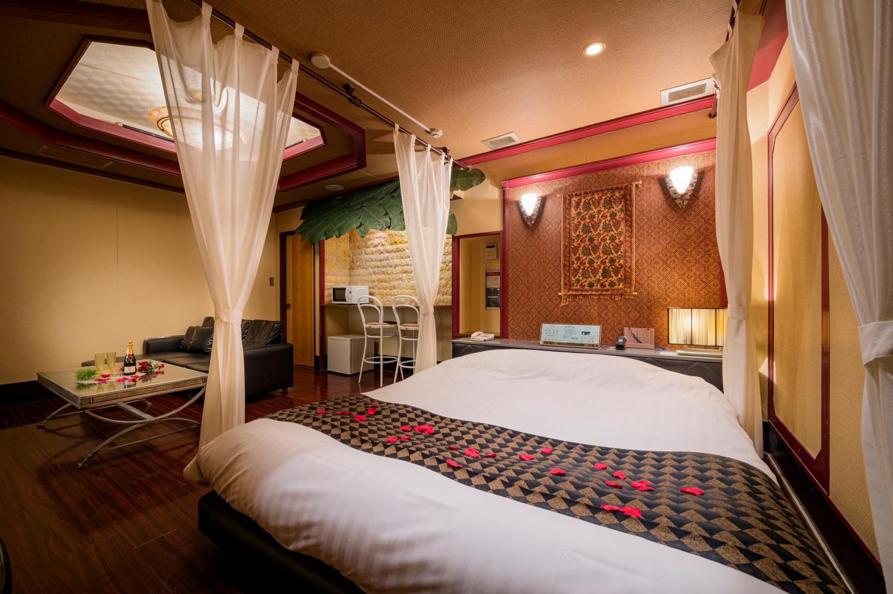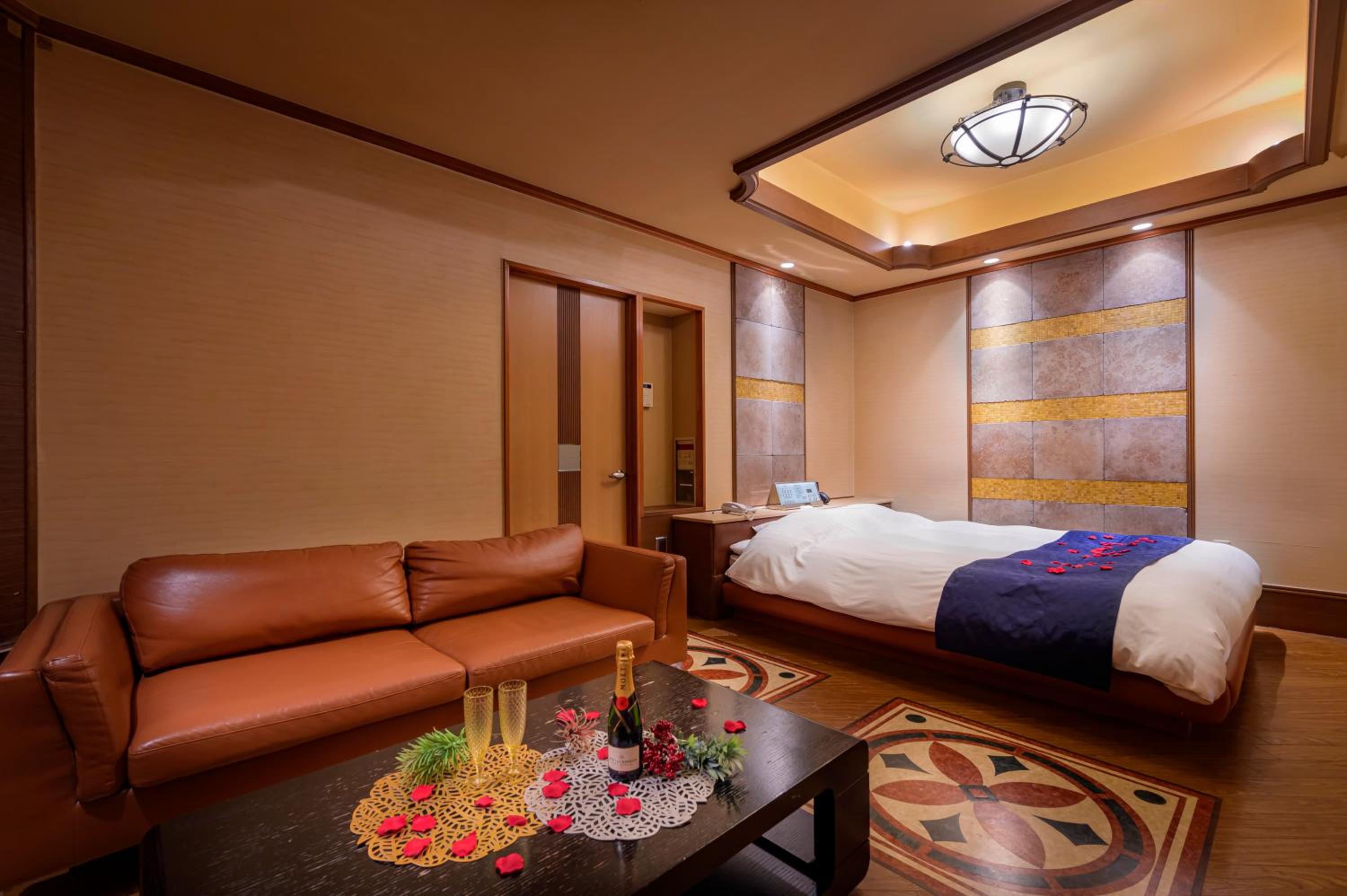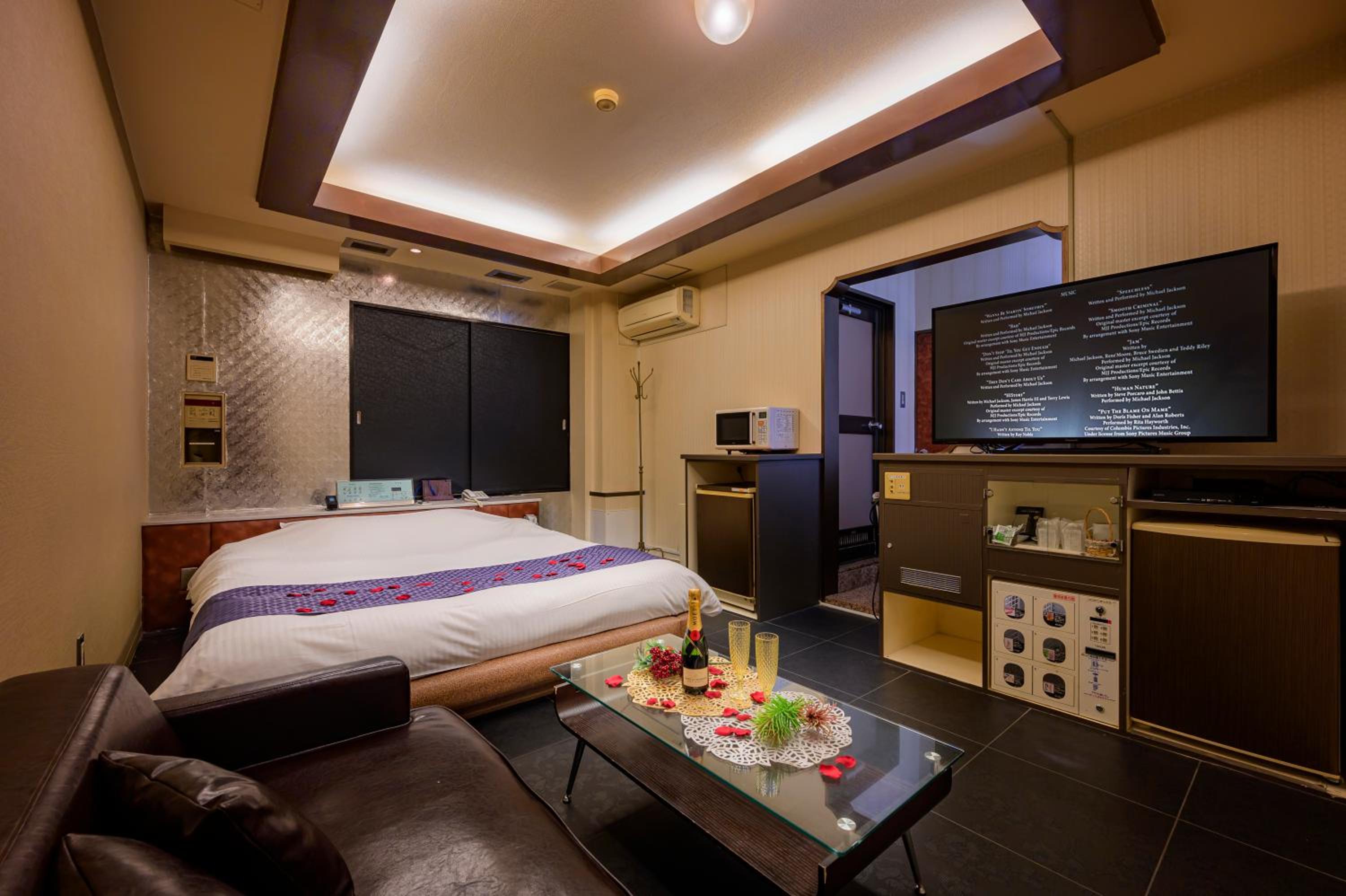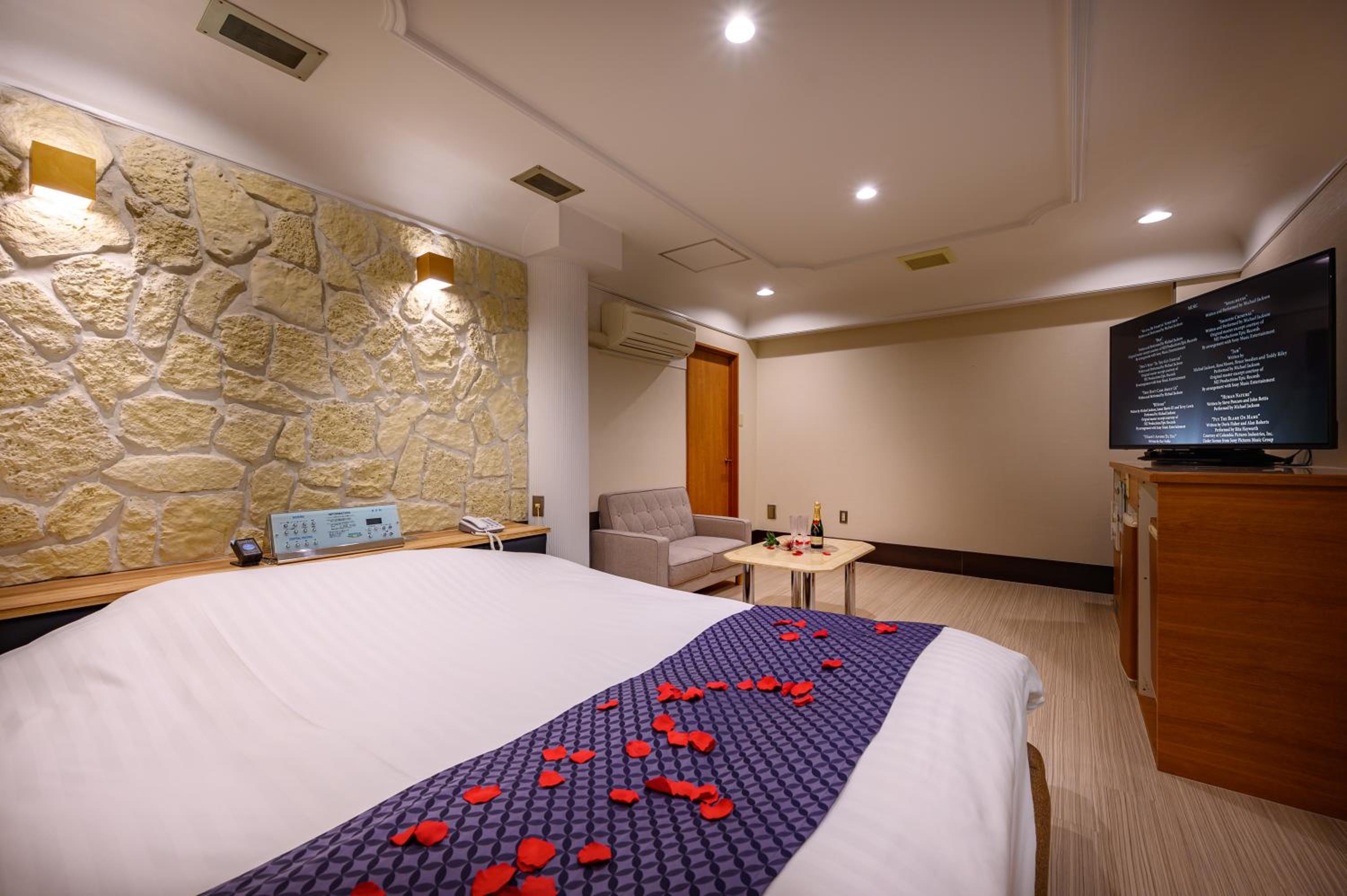 Each guest room at this love hotel is thoughtfully equipped with modern comforts such as air conditioning, a flat-screen TV, Blu-ray player, and a private bathroom with premium toiletries ensuring a comfortable and relaxing experience.