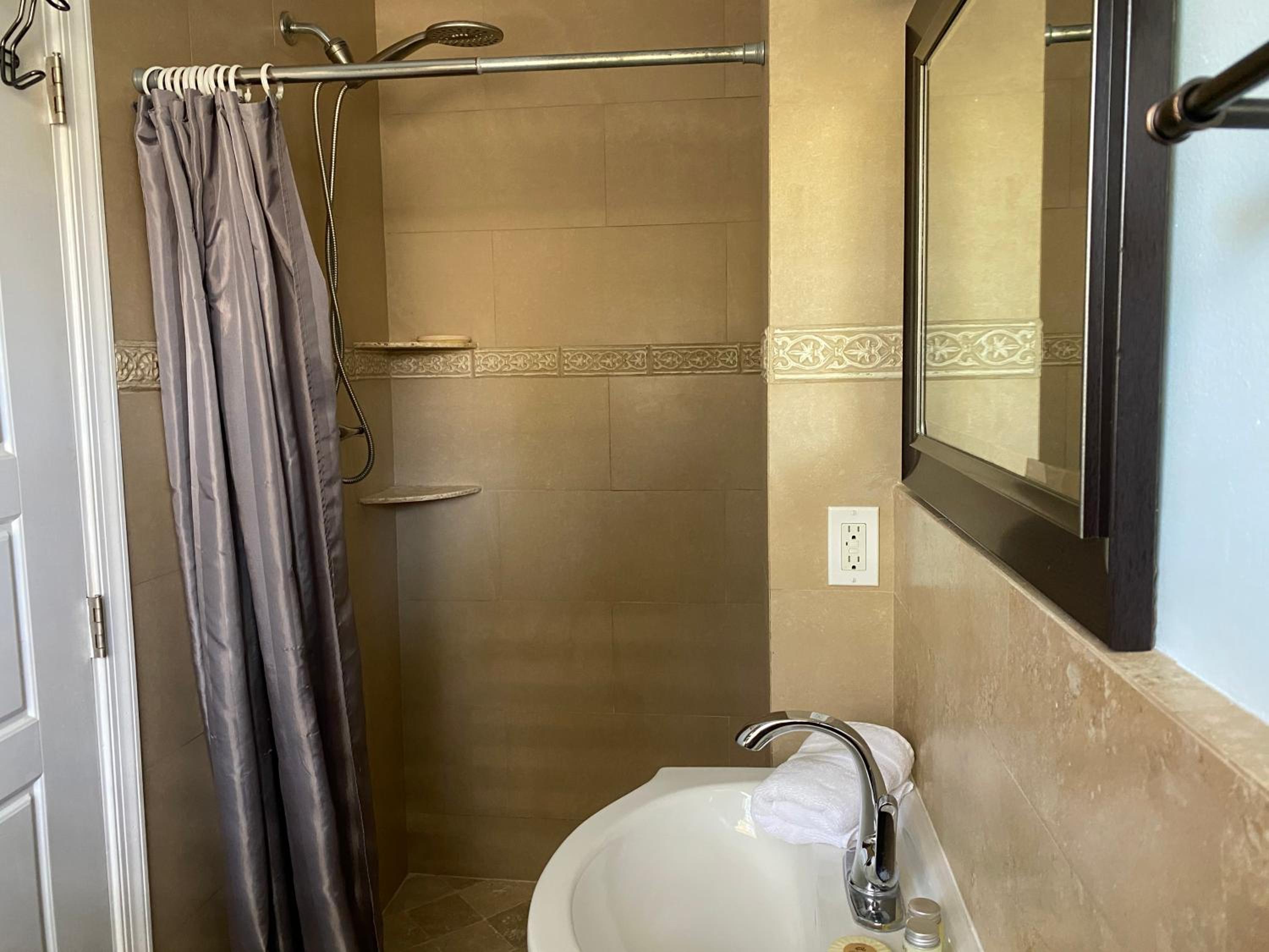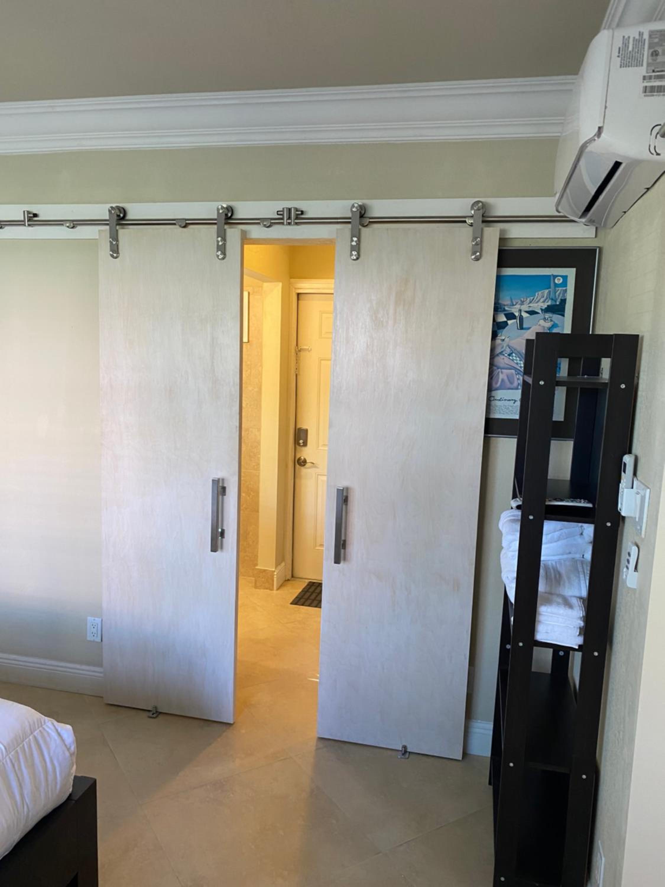 This property has the same issue that we often find, no countertop space or hanging space in the bathroom. I realize this is a handicap equipped unit, but nevertheless, it would be nice to have some sort of shelf or countertop in the bathroom to put your toiletries on while you’re getting ready in there. I think that could’ve been accomplished without hindering access. Additionally, I am not a fan of the barn doors. It seems that they always have a malfunction and they also do not block out light or sound at all.