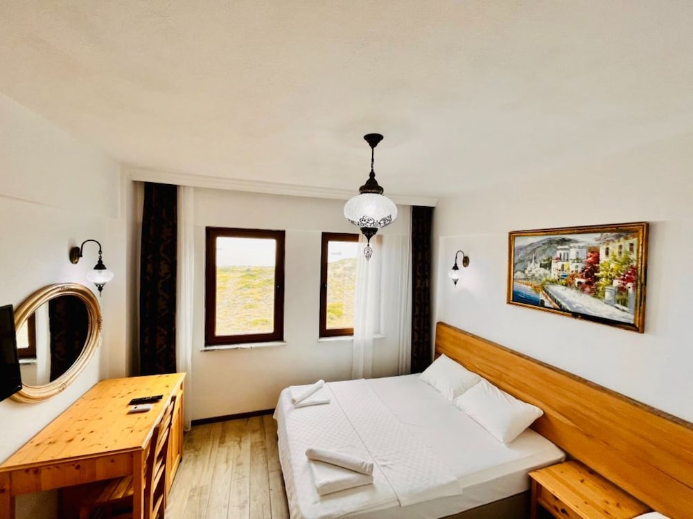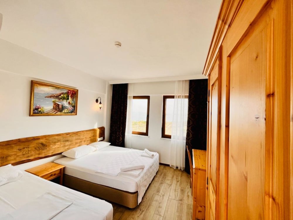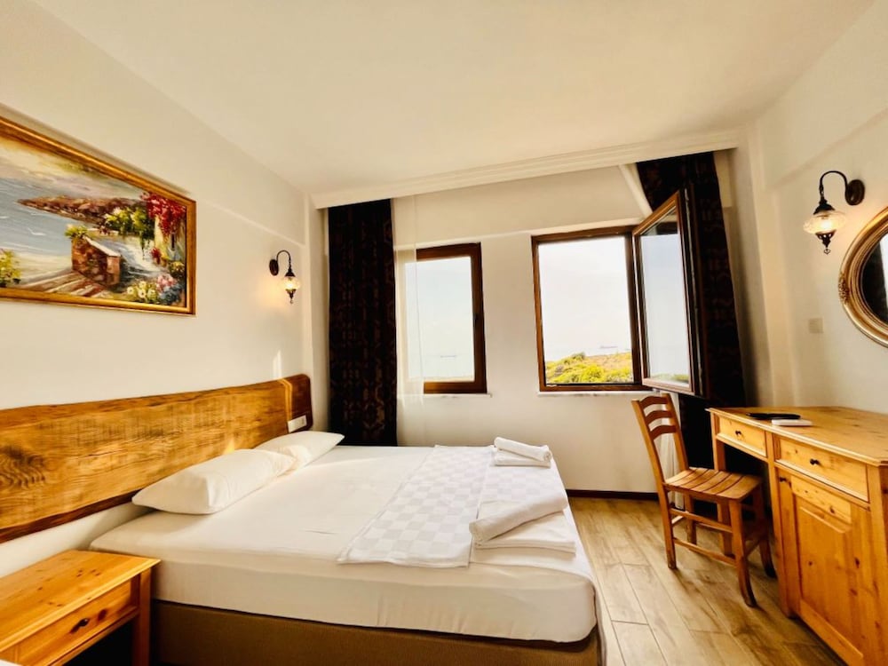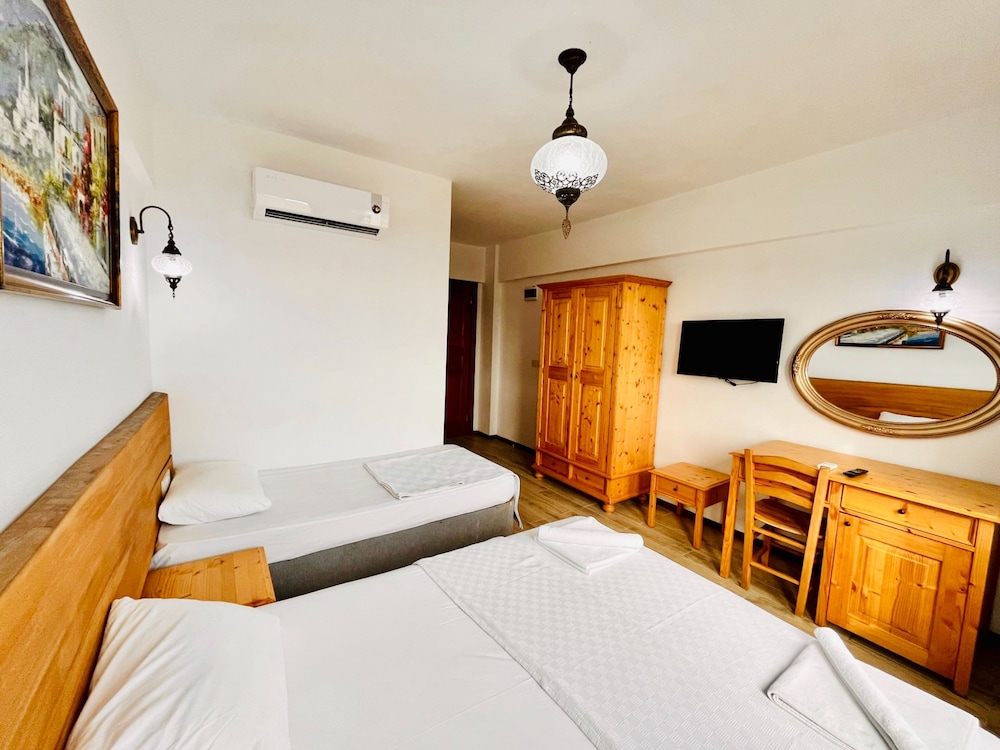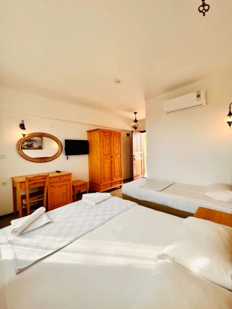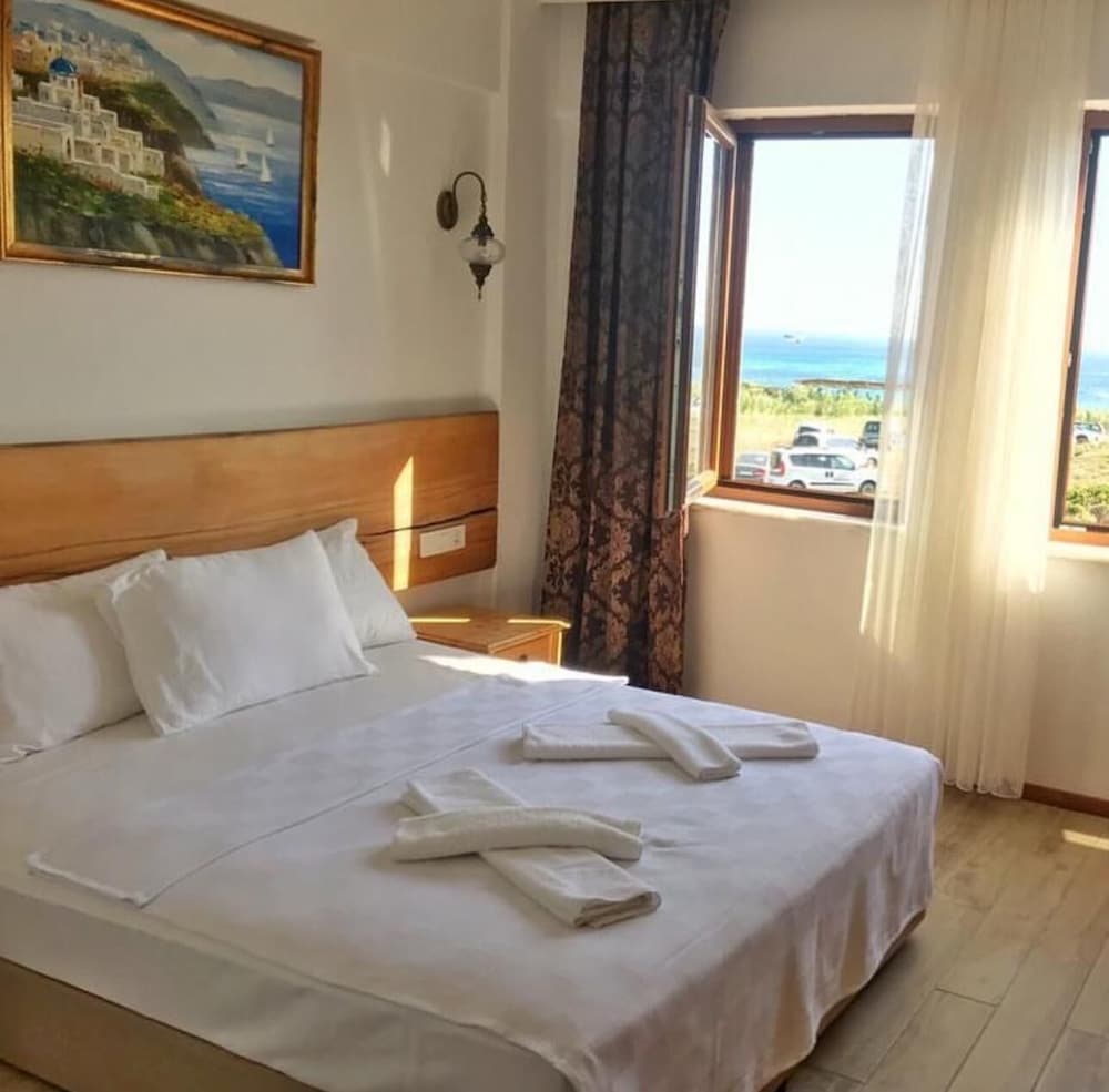 3 gece 4 gun konaklama ilk girisde guzel bi karsilama guler yuz nezaket odaya yerlesmeden ellerim dolu oldugu odenmee alinmaya calisilmasi sanki kacicakmis gibi muamele hos degil.Odaya ilk giris de beyaz yatak ve yastik ortuleri tozdu.Odalar da mini dolap yok.Îcme suyu cay soda nescafe yok.Adayaa ozgu kahvalti turu yok.Sac ve kurulanma avlulari sert kumasdan secilmis.Otelin iiyi tarafi calisanlari guler yuzlu iyi niyetli ve otelin denize 100 mt mesafede olmasi.Beklentiniz yuksek olmasin.!!!Hayal kirikligi yasamayin.