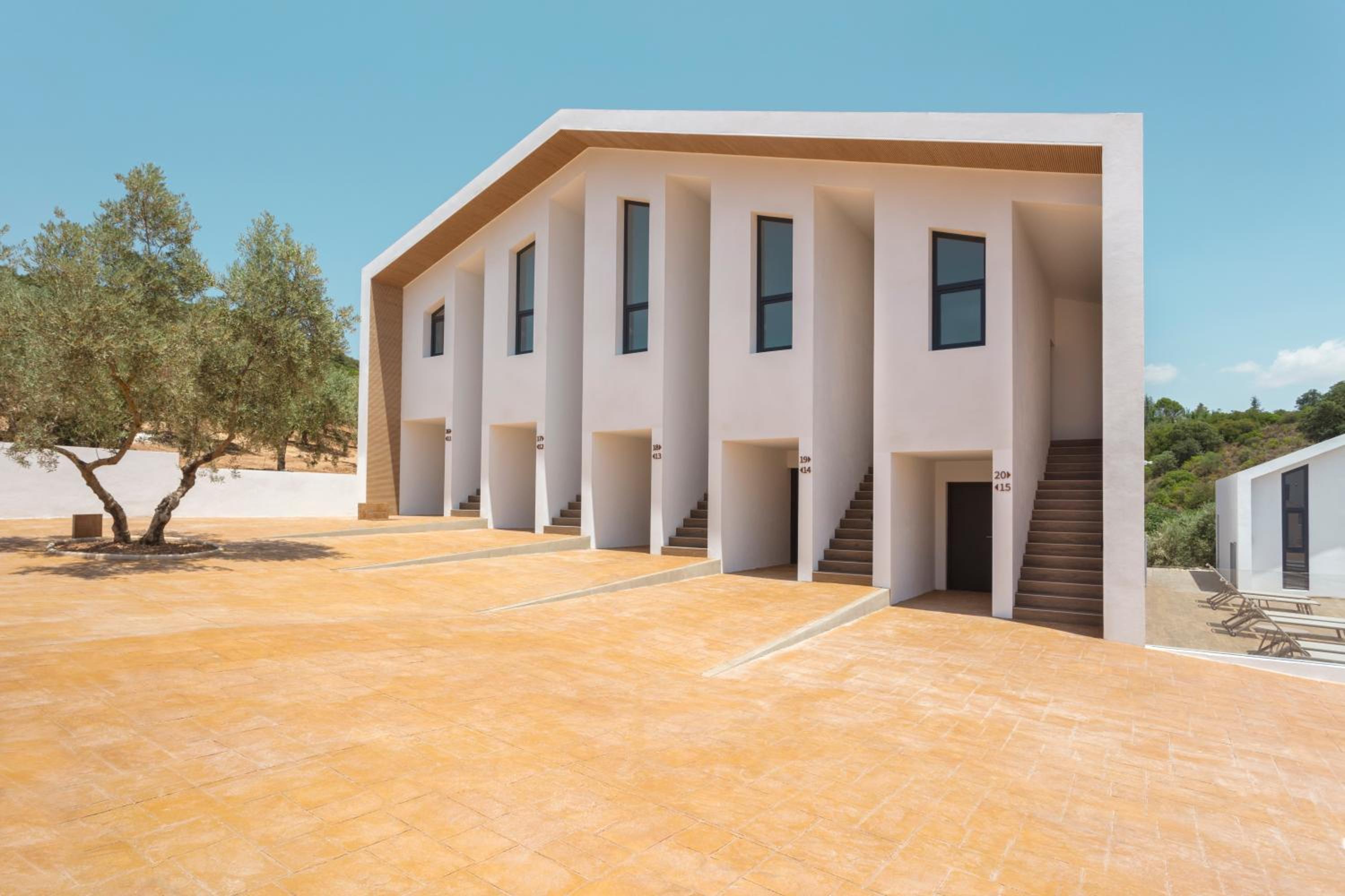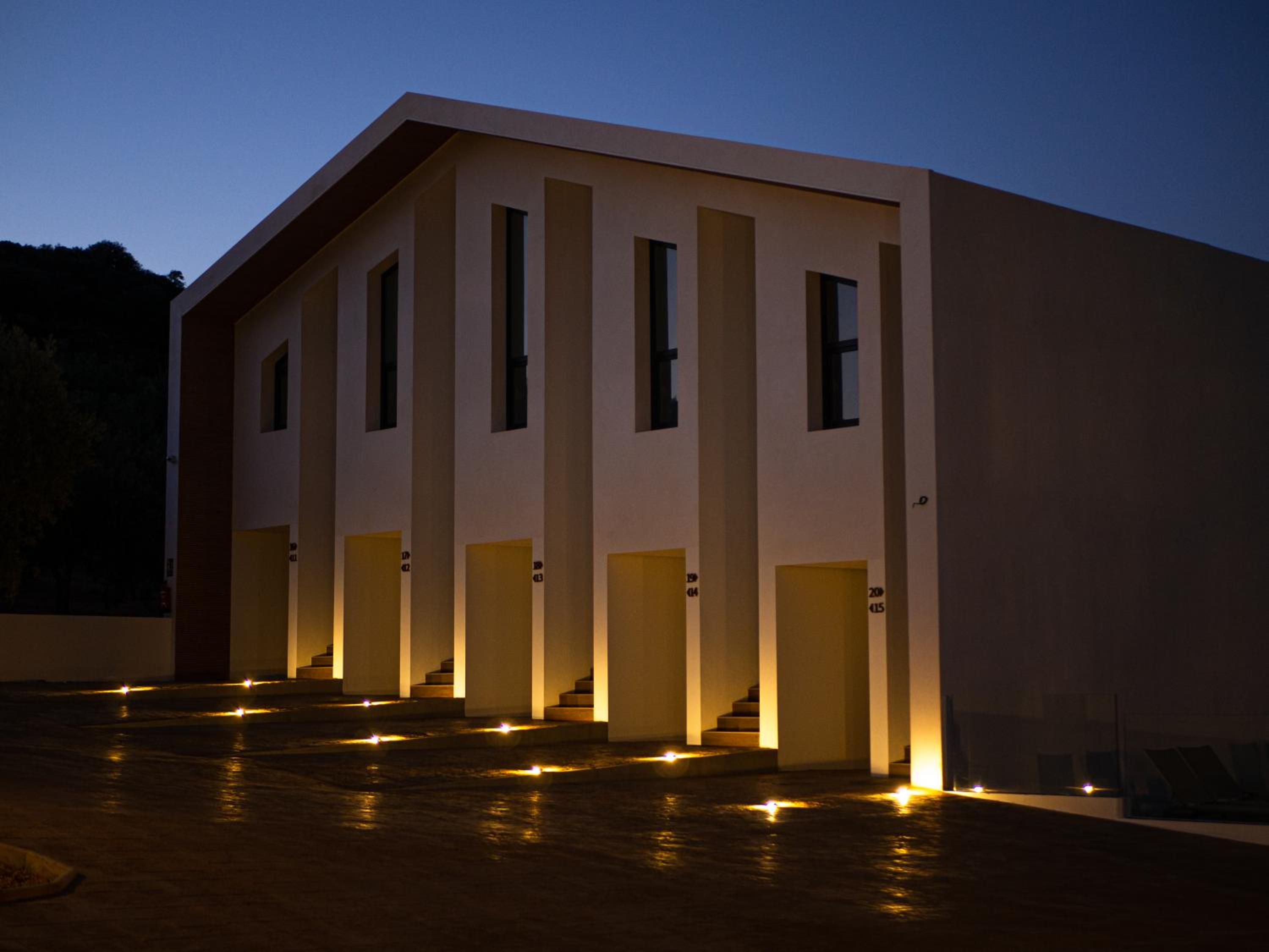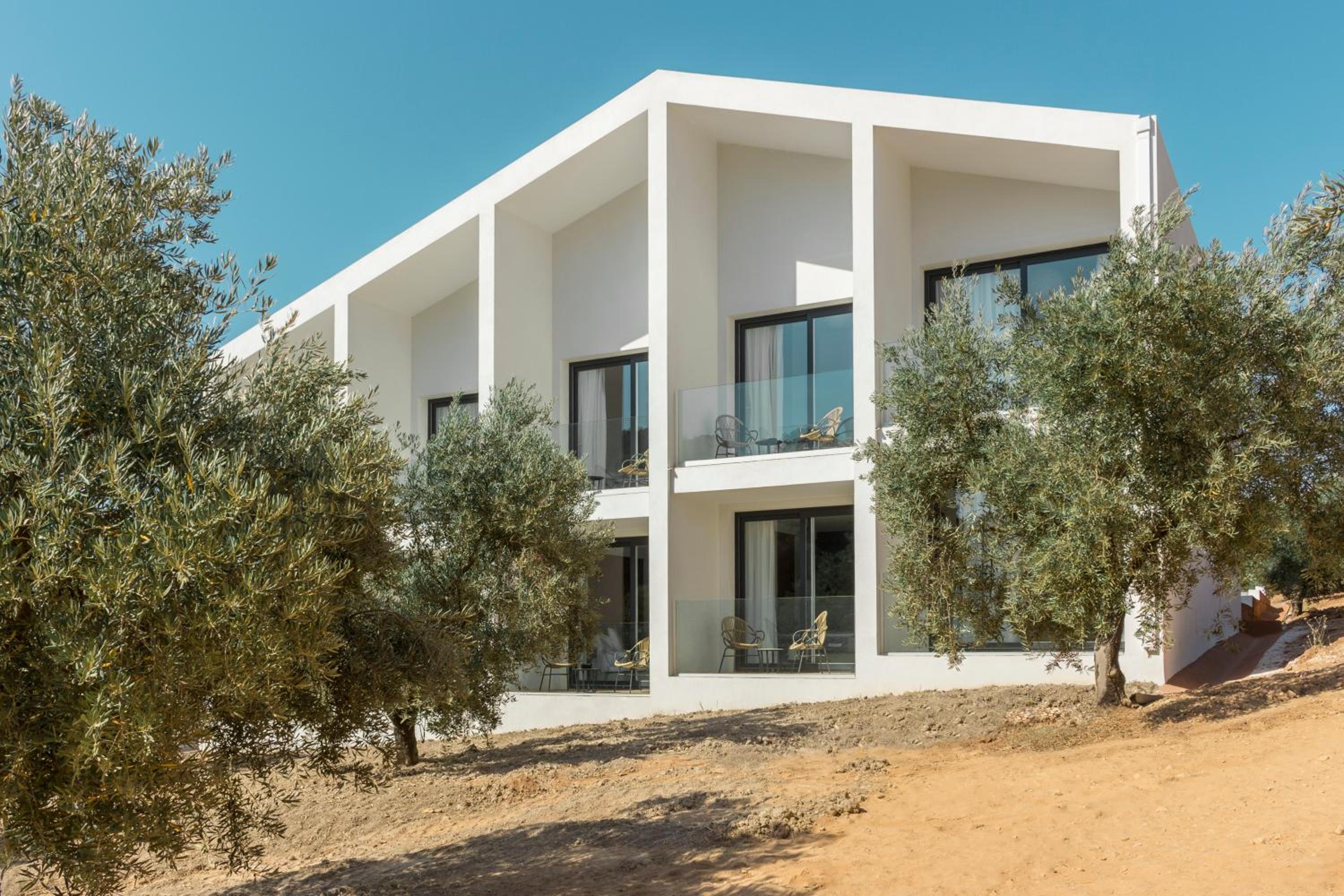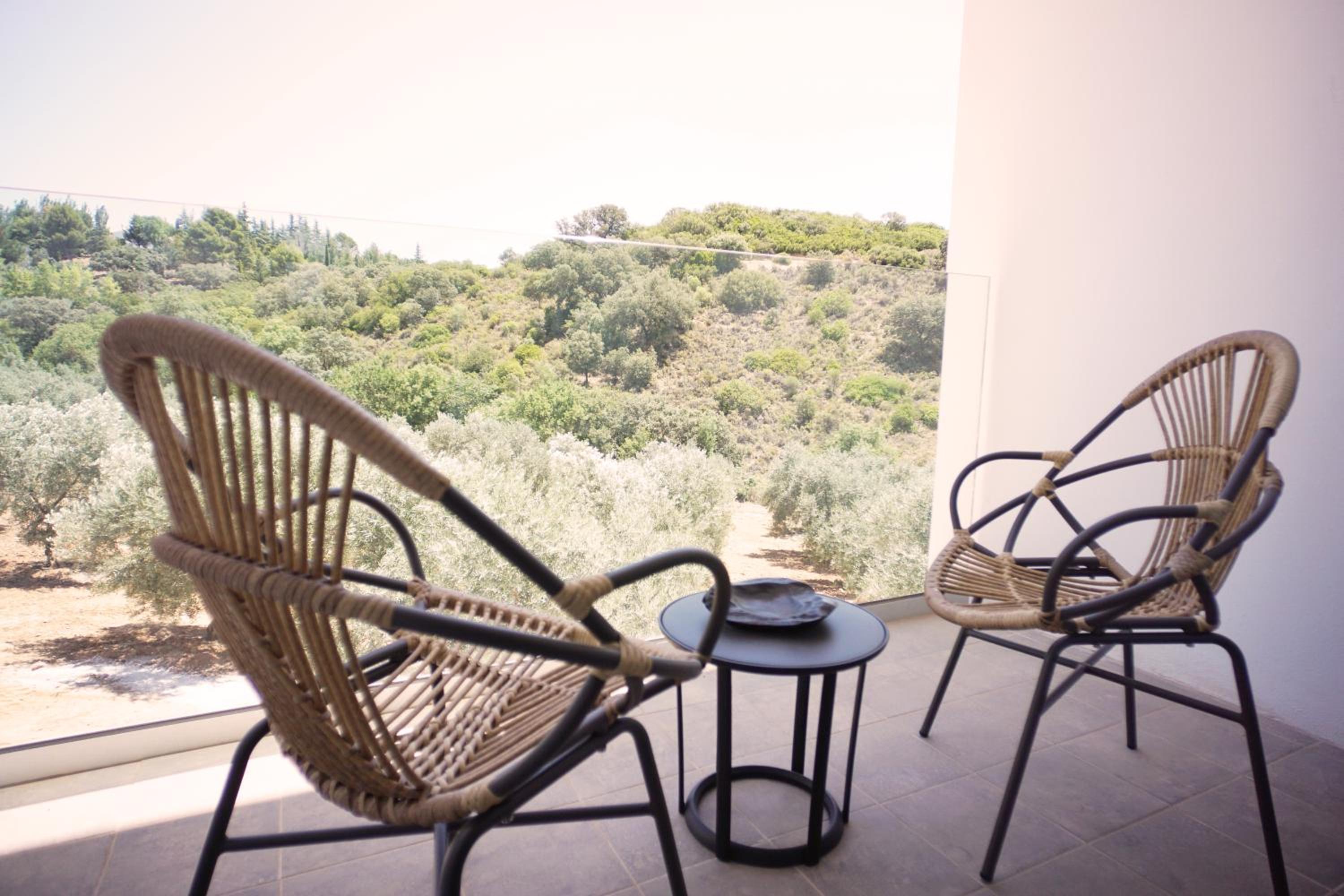 Direkter Blick aus dem Erdgeschosszimmer in das Olivenhain (Glasbrüstung am Balkon), absolute Ruhe bei deaktivierter Klimaanlage/ Heizung/ Kühlschrank.