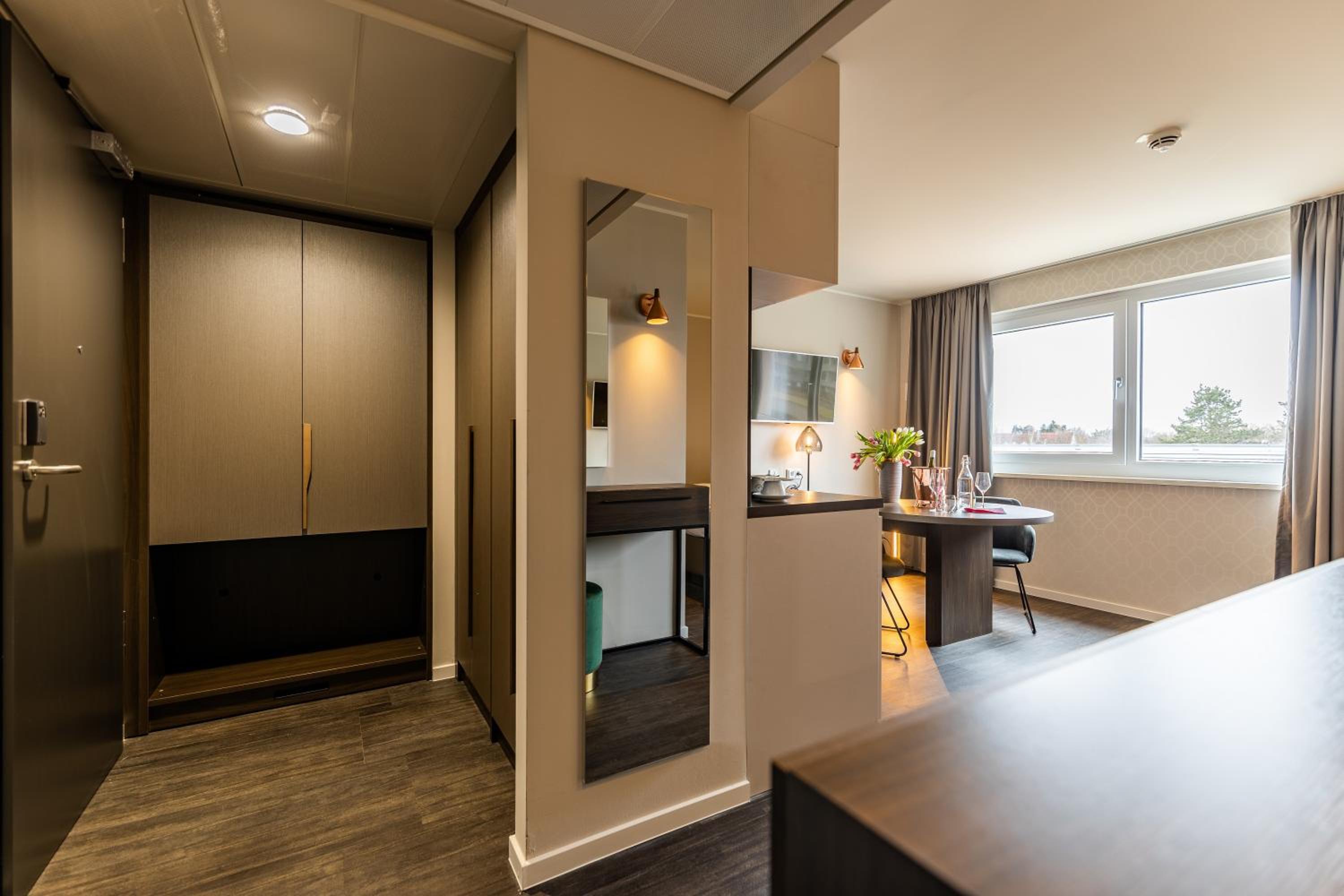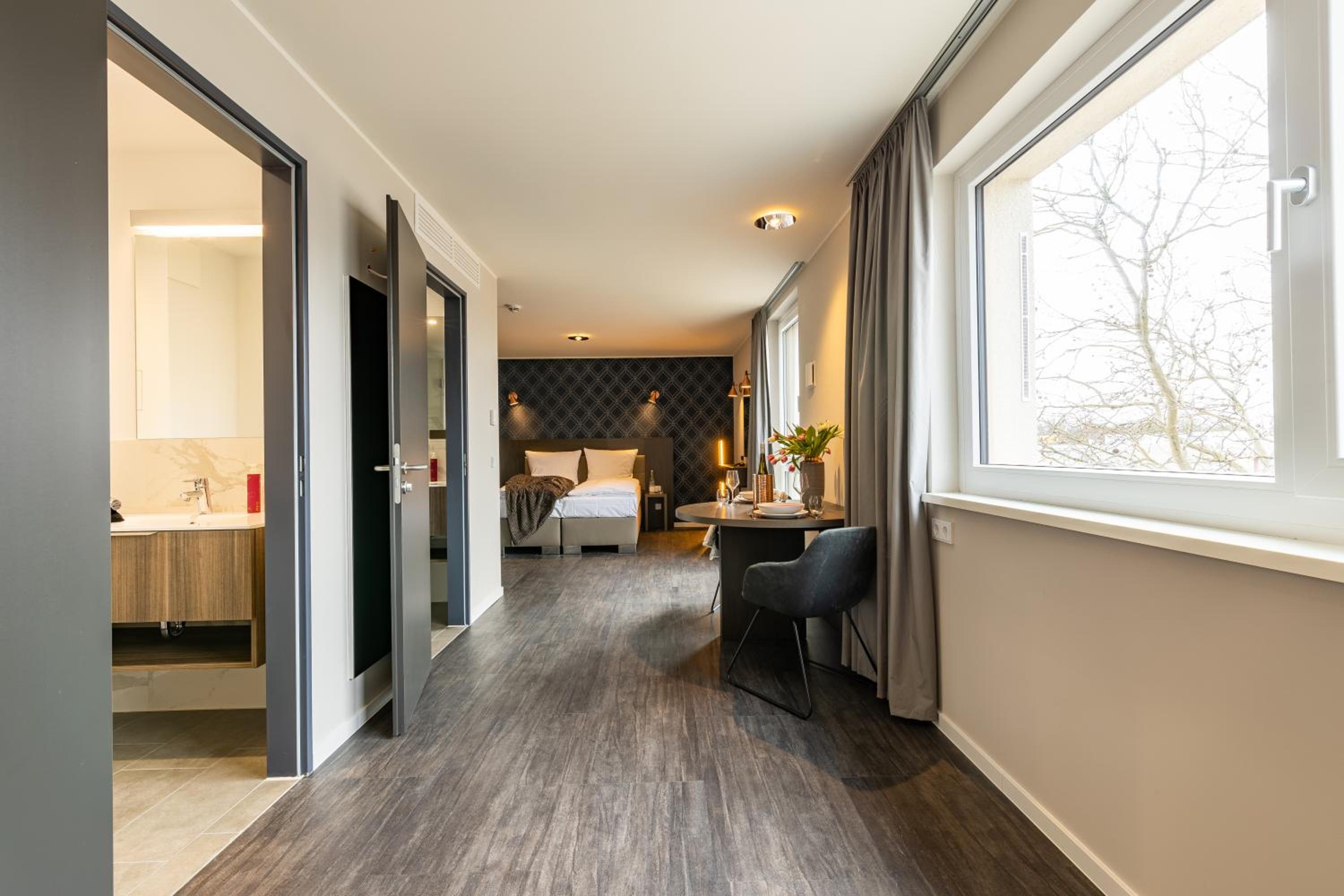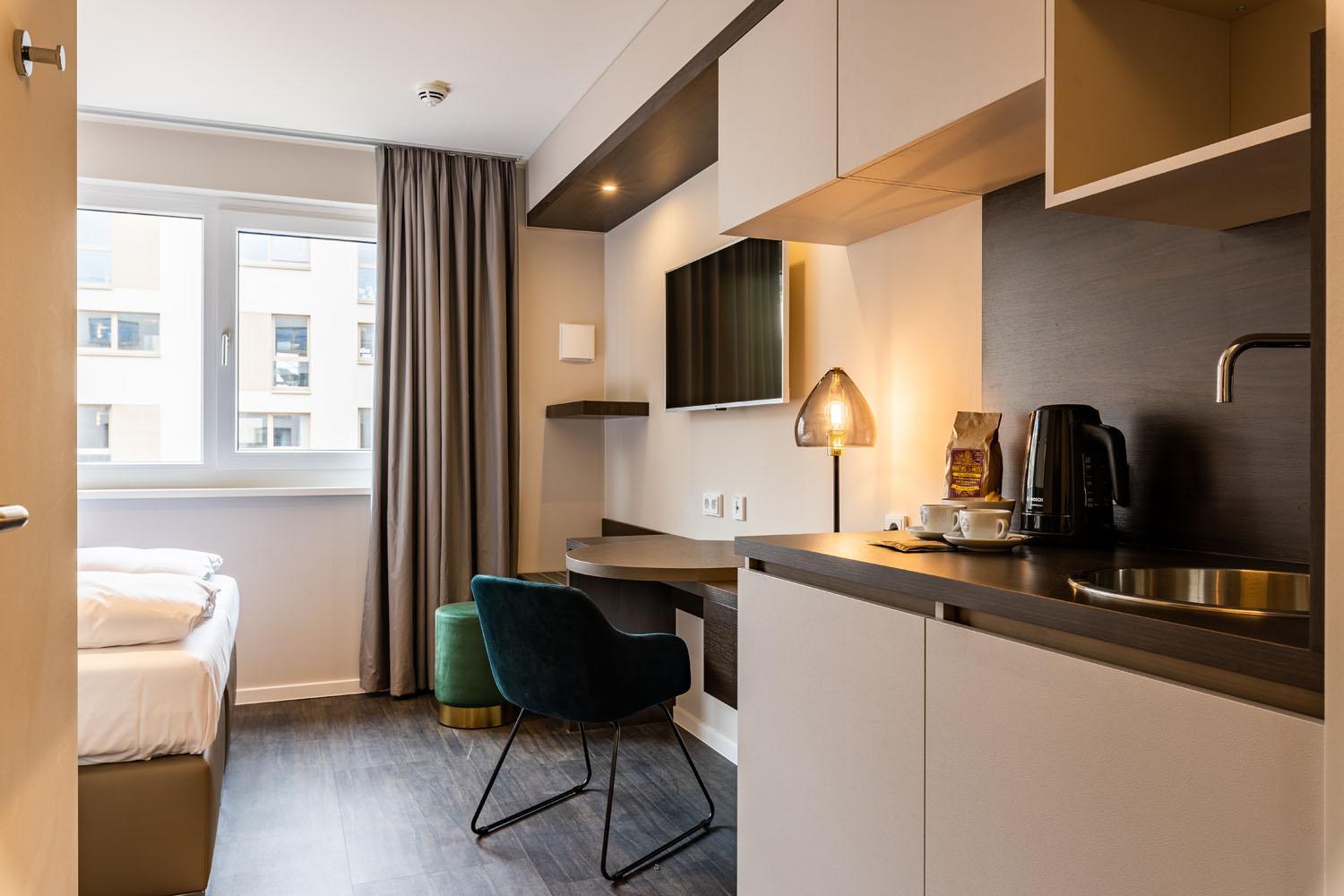 Ein schönes Hotel, allerdings haben wir uns wenig in den öffentlichen Räumen aufgehalten. Unser Zimmer war toll, allerdings haben wir vor Ort auch noch eine Kategorie abgegrast, wir waren also in einer mittleren Kategorie (29 m2 statt 19 m²). Da wir das Hotel als Unterkunft während unseres einwöchigen Umzuges genutzt haben, hatten wir einiges an Gepäck dabei, was wir verstauen mussten. So hatten wir im Zimmer neben der Koch Ecke auch einen Tisch, viele Schränke und erheblich mehr Platz. Die Betten waren komfortabel und das Badezimmer ausreichend groß. Alles in allem haben wir uns dort wohl gefühlt und würden das Hotel und diese Zimmer Kategorie auch jederzeit weiterempfehlen. Das Hotel selber liegt nah an einer Autobahn, der Messe und einer S-Bahn-Station. In der Nähe gibt es einen Rewe, dm, Lidl und einen fantastischen Bäcker. Ebenfalls nicht weit befindet sich das einzige Autokino von München.