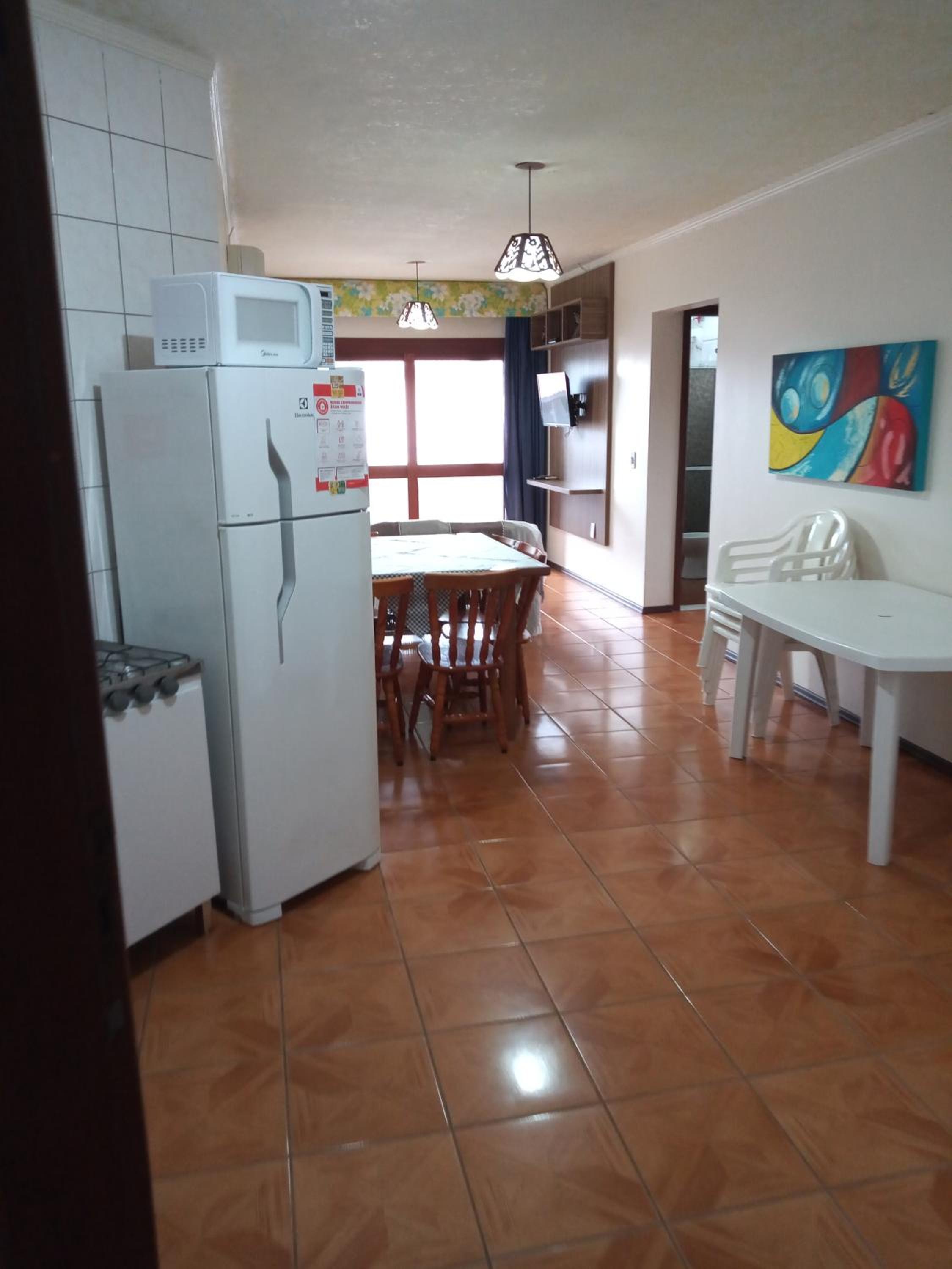 Gostamos do quarto grande que tem sala integrada com cozinha/copa/sacada externa com churrasqueira, vista limitada do mar.