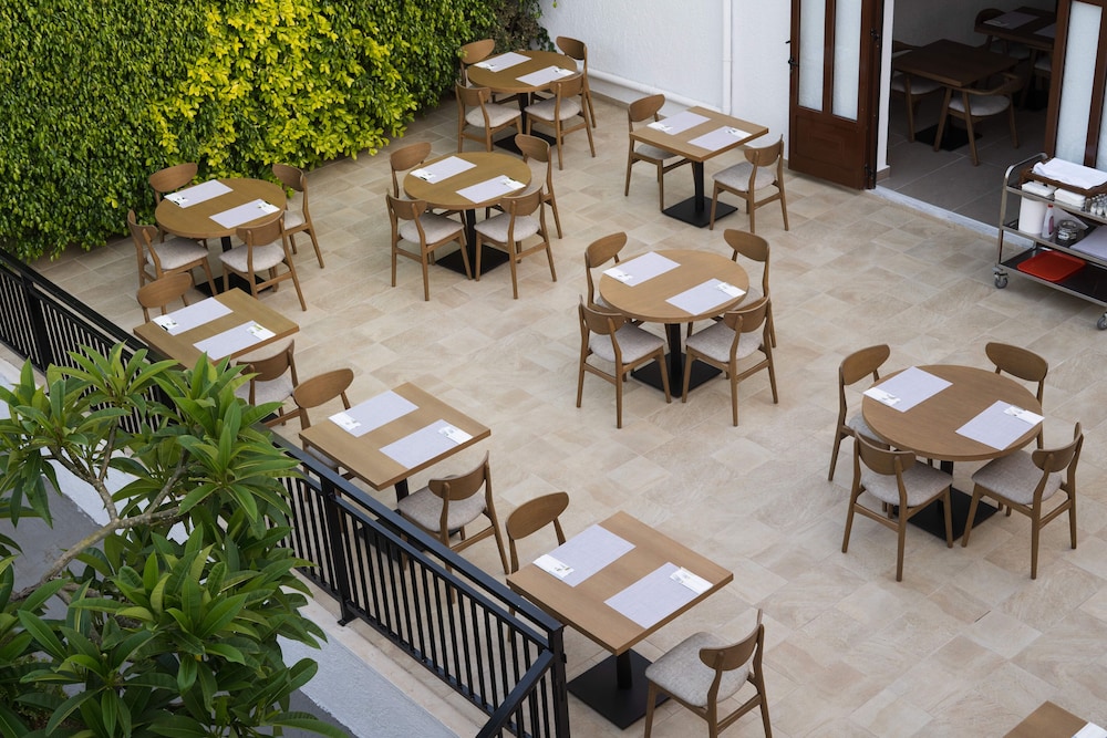 This hotel is located in the heart of Malia, all shops and restaurants are close. The pool area is well maintained, filled with fruit trees and enough sunbeds for everyone. Pool bar offers nice food and drinks, ice cream, coffee etc. Friendly service. Overall there is a cosy feeling almost throughout the family owned hotel. Breakfast waiters were the only two persons at the hotel who did not seem to enjoy their job. No smile, no good morning and very slow filling of the empty dishes. The owner showed up some mornings and then all dishes became full quickly.
