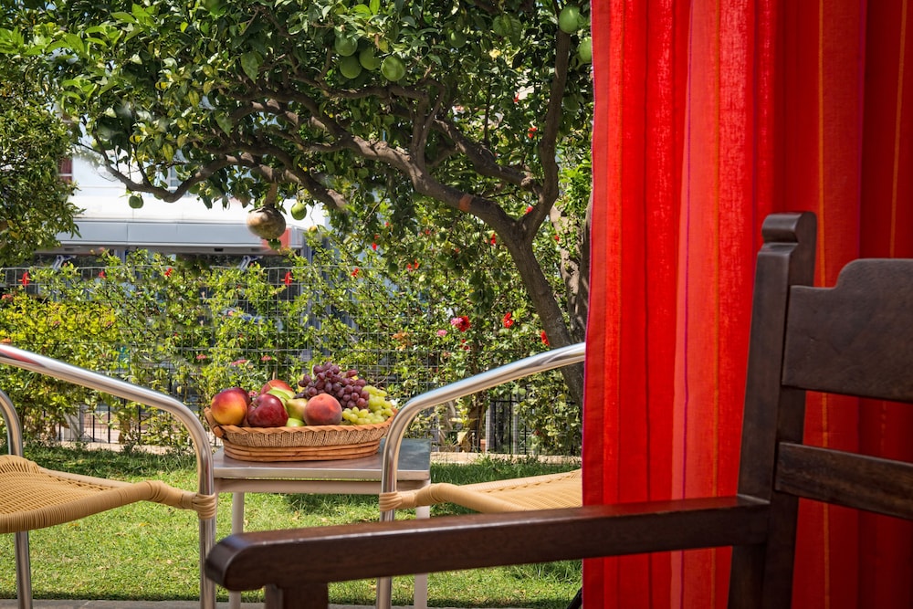A beautiful hotel, very nice and clean room, breakfast and dinner with a great choice of food, different each day, a large swimming pool in the middle of a fruit garden, with a bar serving food and various drinks, umbrellas, beds and towels free of charge, a lot of shops and restaurants near the hotel. Bus station for access to the airport and other towns at 100 meters from the hotel. Beach at 10 minutes walk from the hotel. Very good prices and last but not least very friendly staff welcoming you with a smile, always ready to help you.