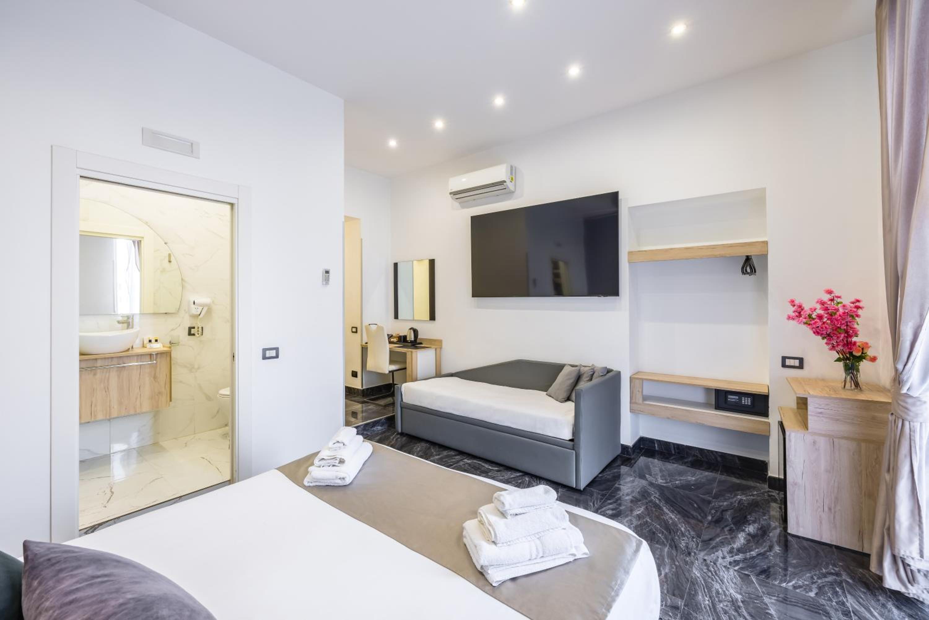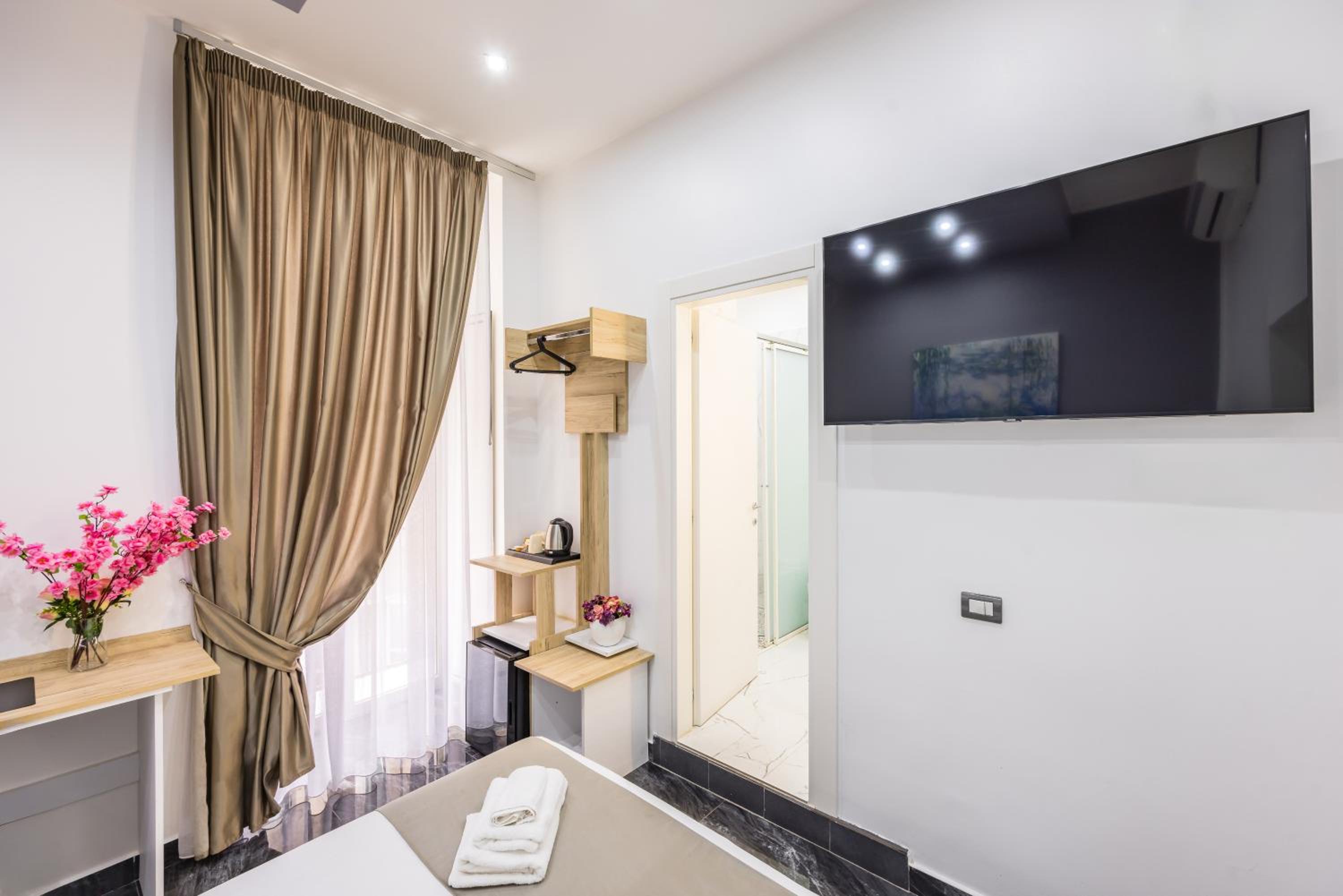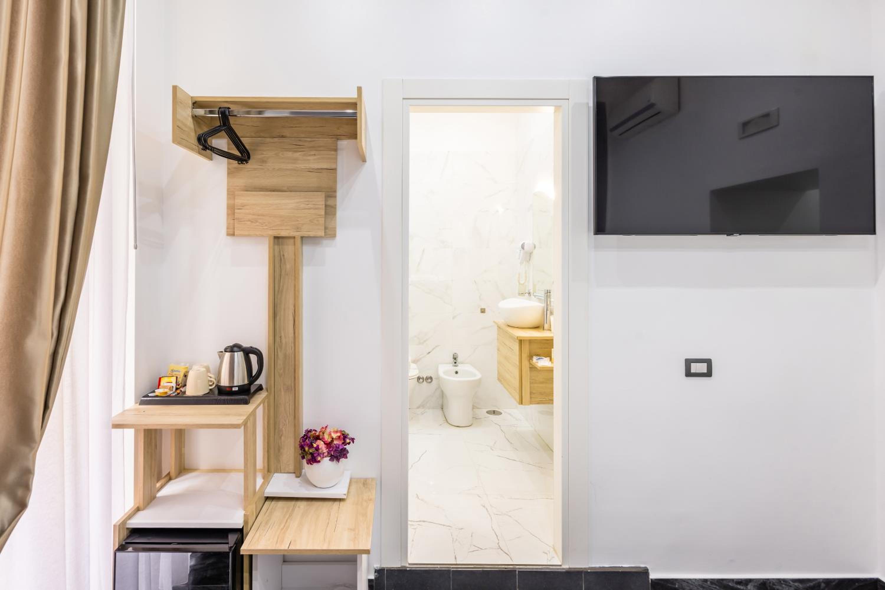 Each air-conditioned room at Bella Napoli Suites is equipped with essential amenities including a desk, wardrobe, and a flat-screen TV, ensuring a relaxing and enjoyable stay for all guests.