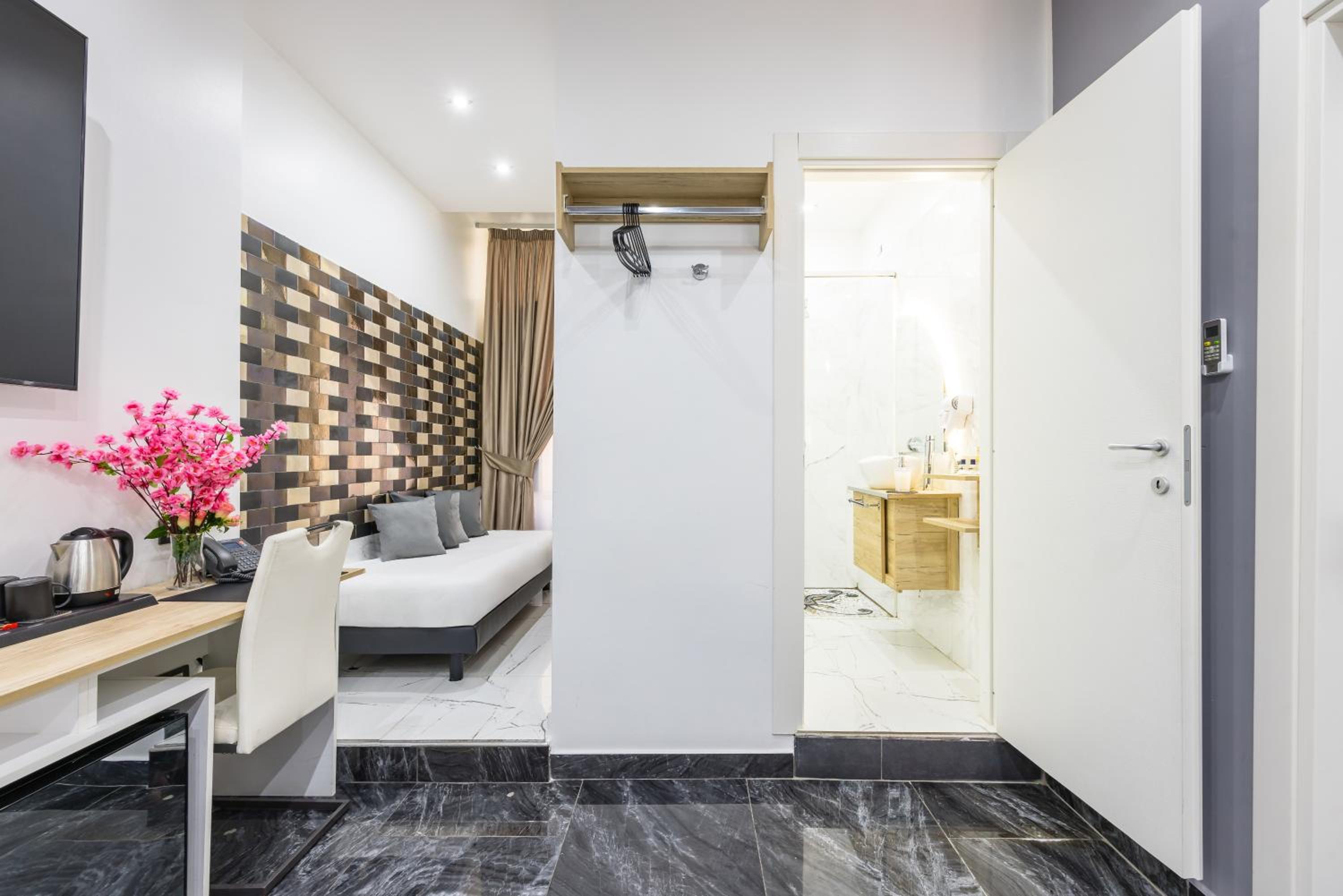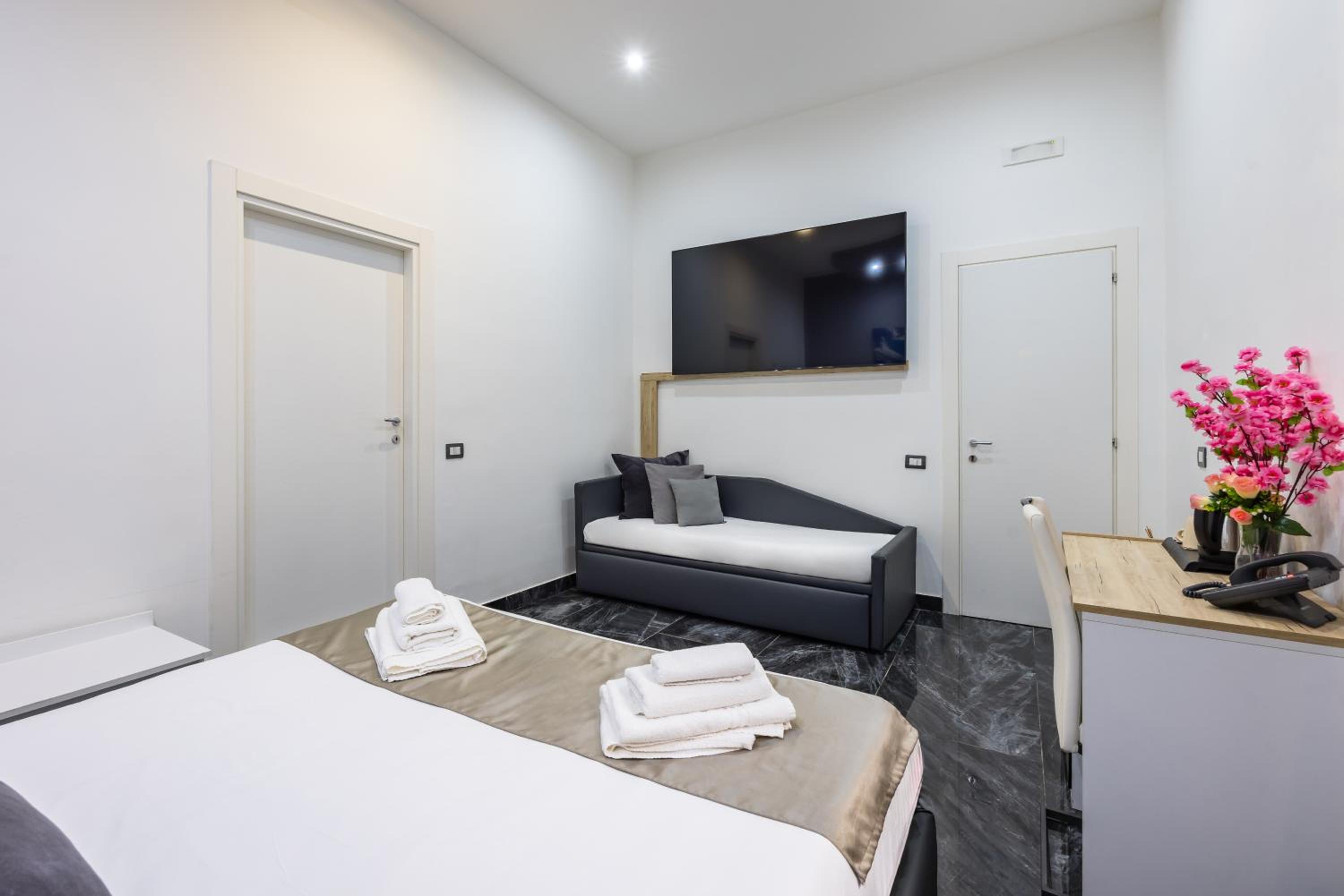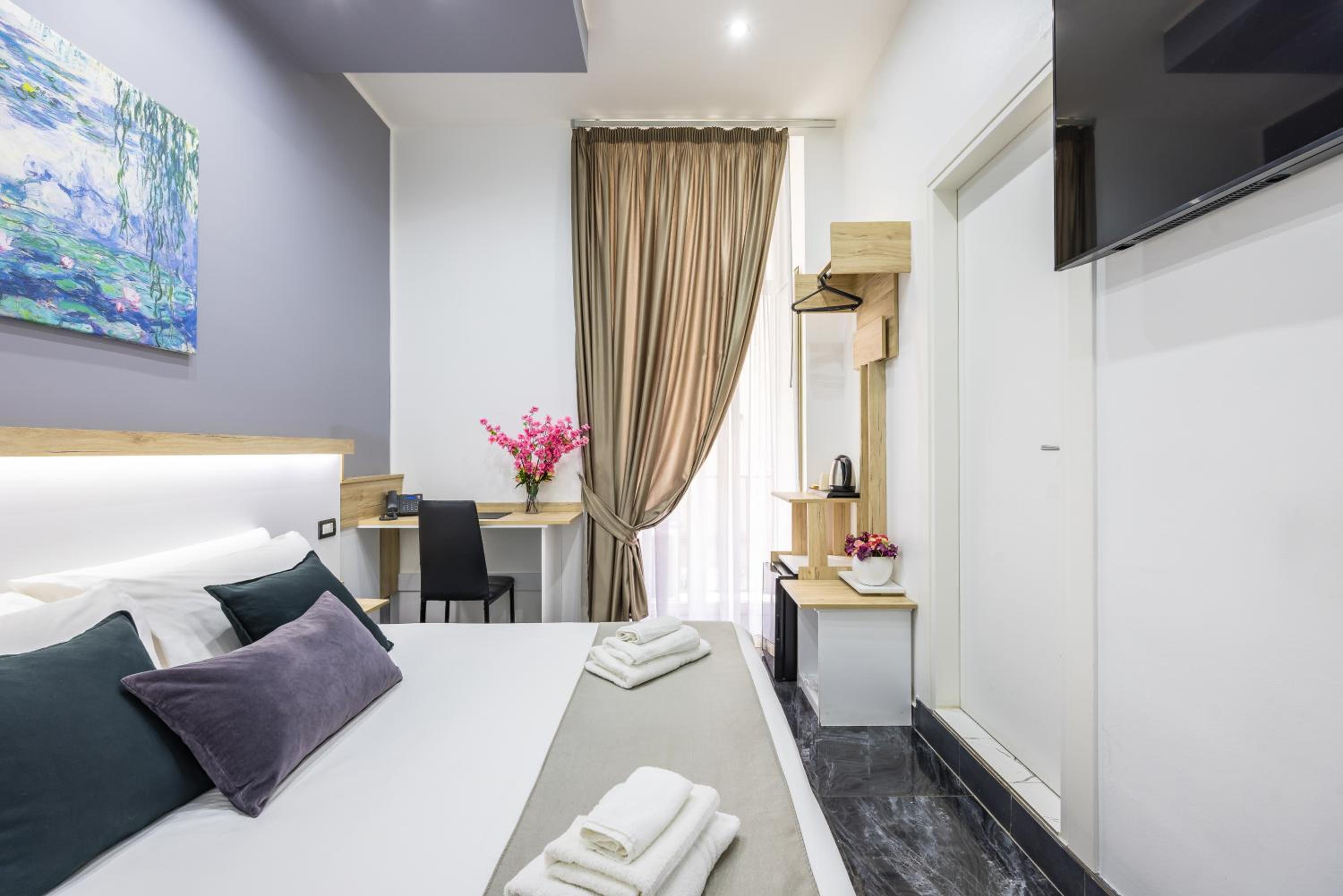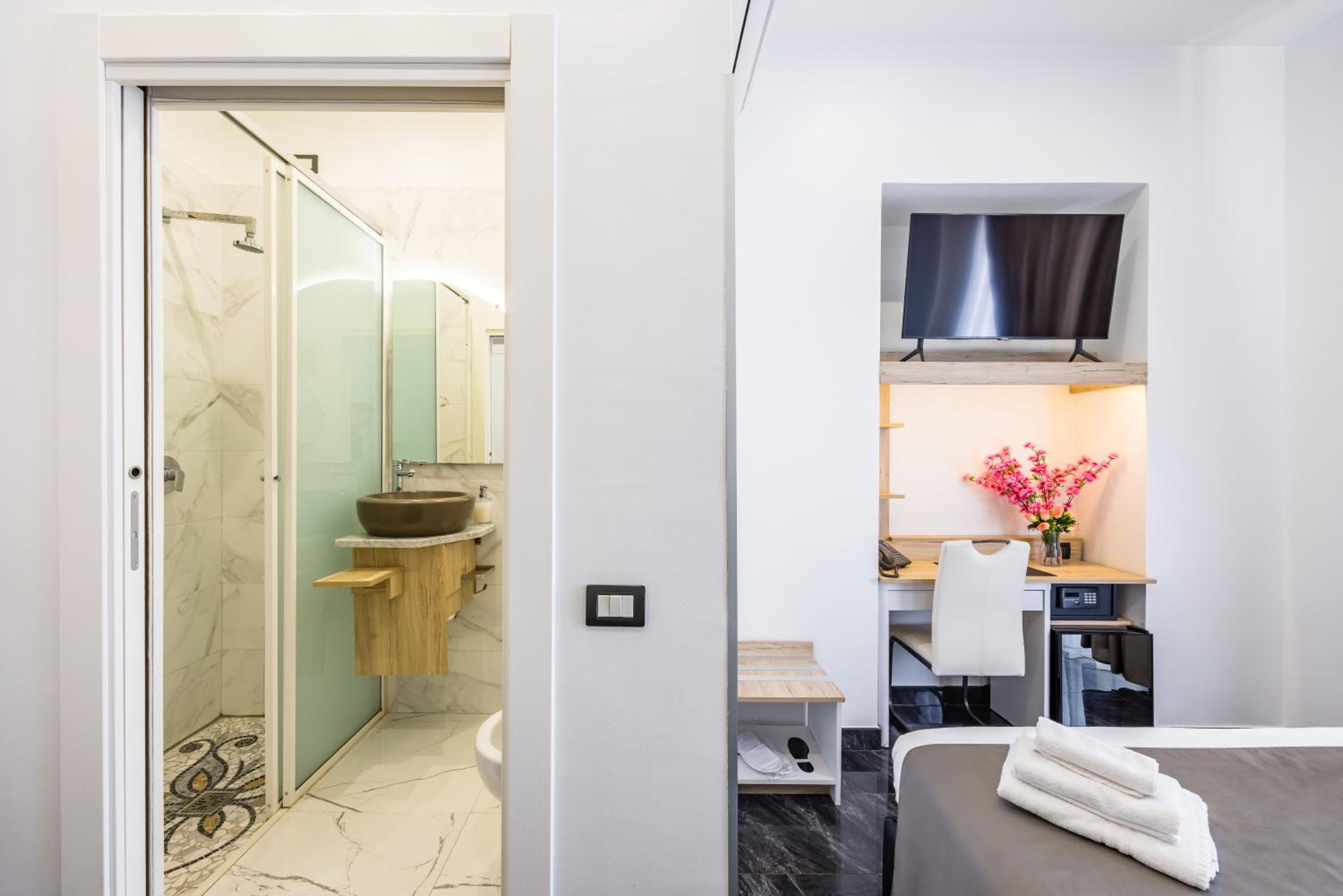 Each air-conditioned room at Bella Napoli Suites is equipped with essential amenities including a desk, wardrobe, and a flat-screen TV, ensuring a relaxing and enjoyable stay for all guests.