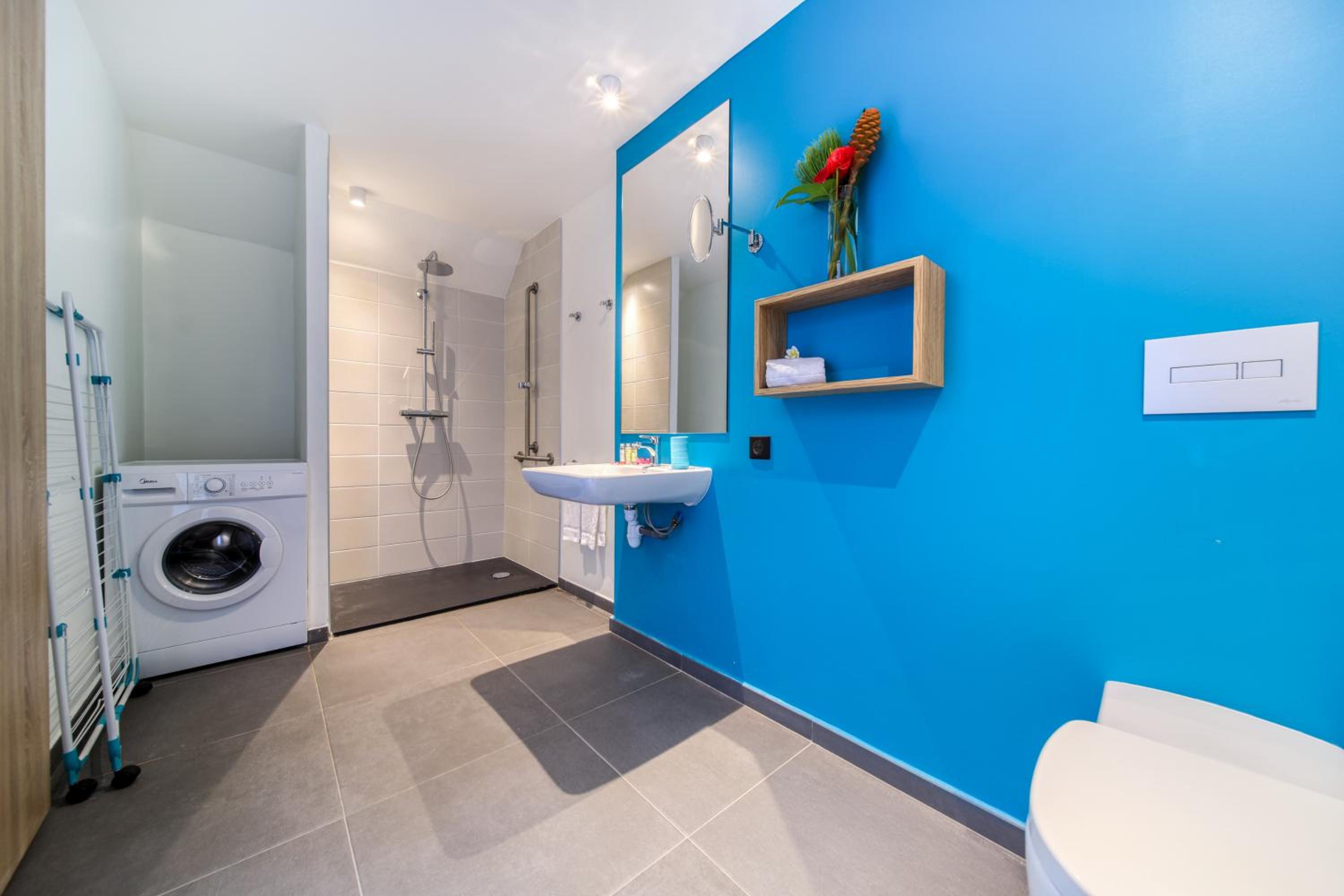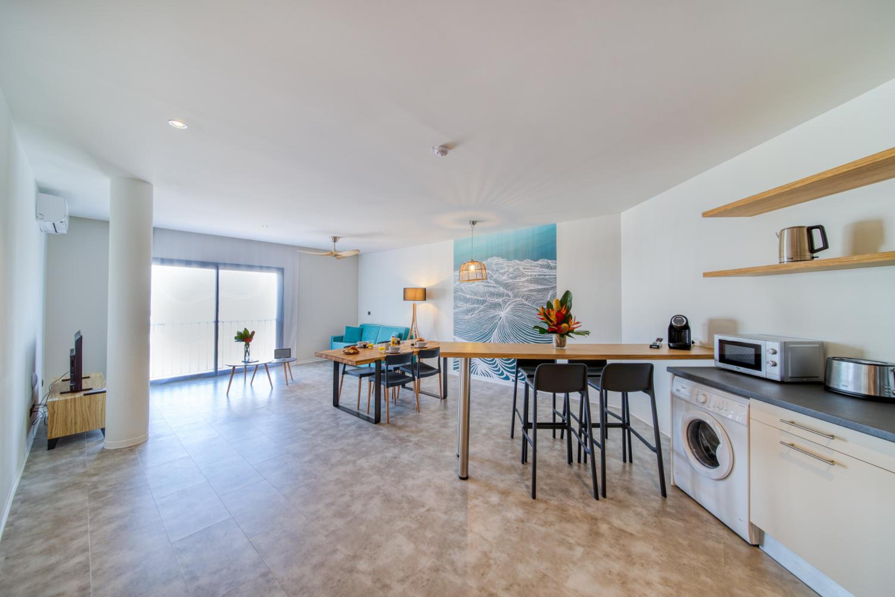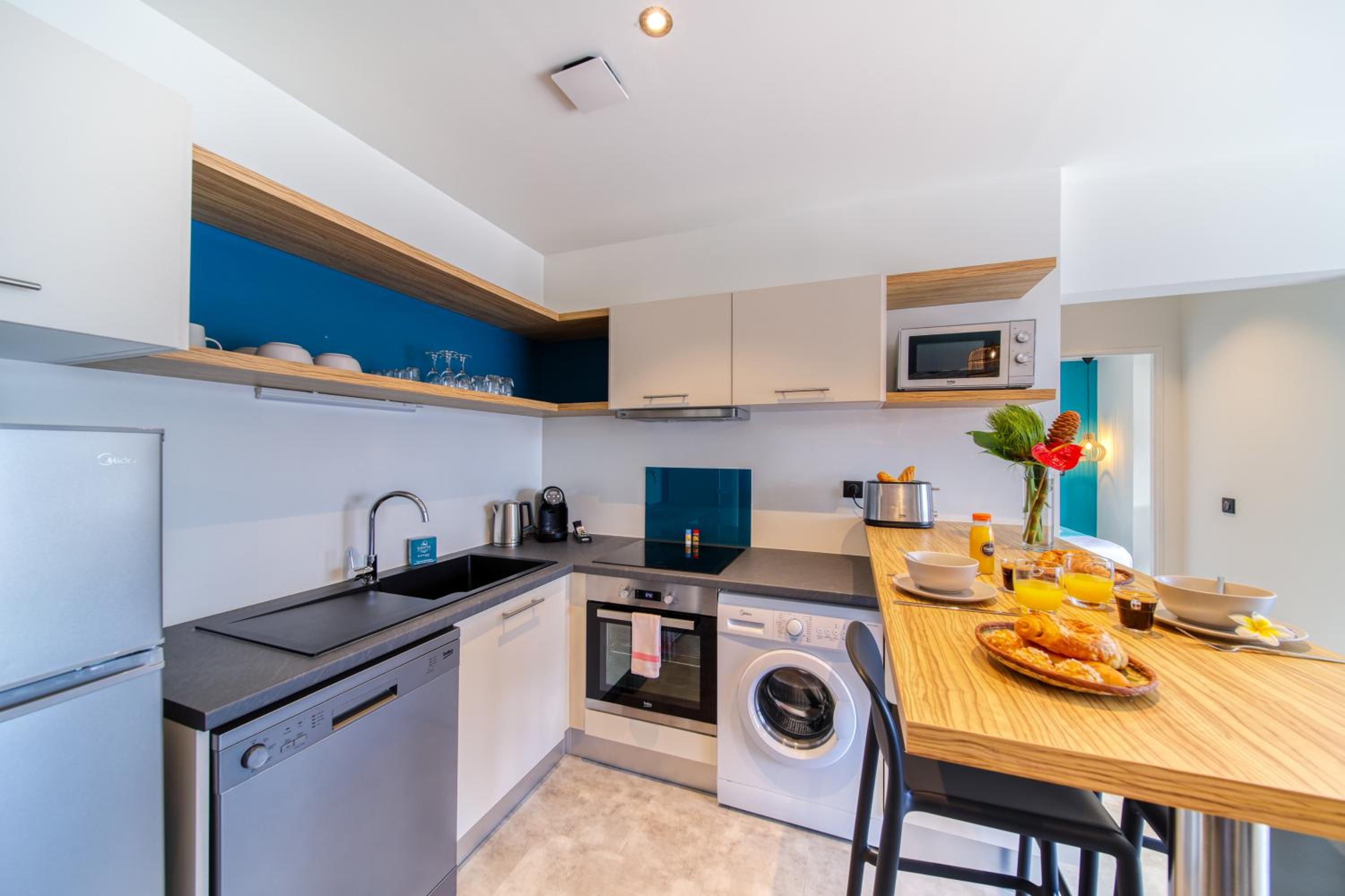 Each unit at our aparthotel features a fully equipped kitchen with modern appliances such as a microwave, fridge, oven, and coffee machine. Relax in the comfortable seating area with a flat-screen TV and take advantage of the convenience of a washing machine in your unit.