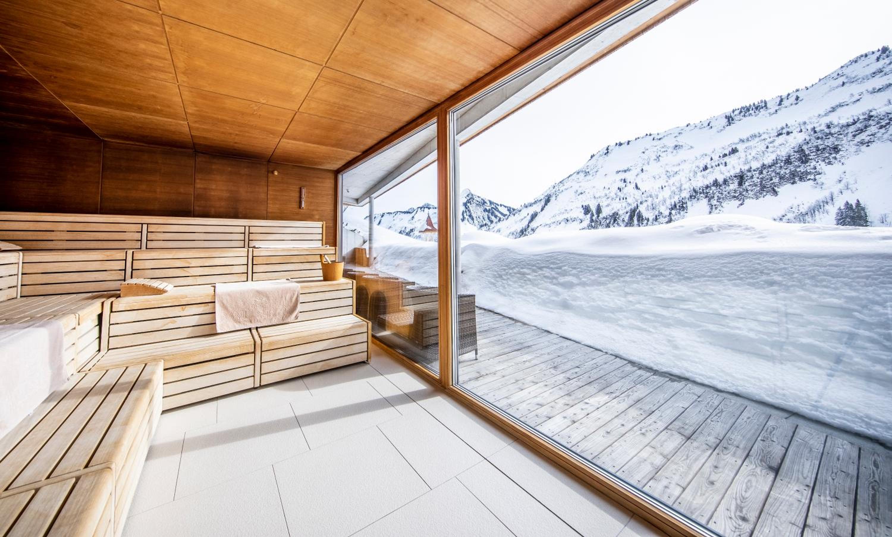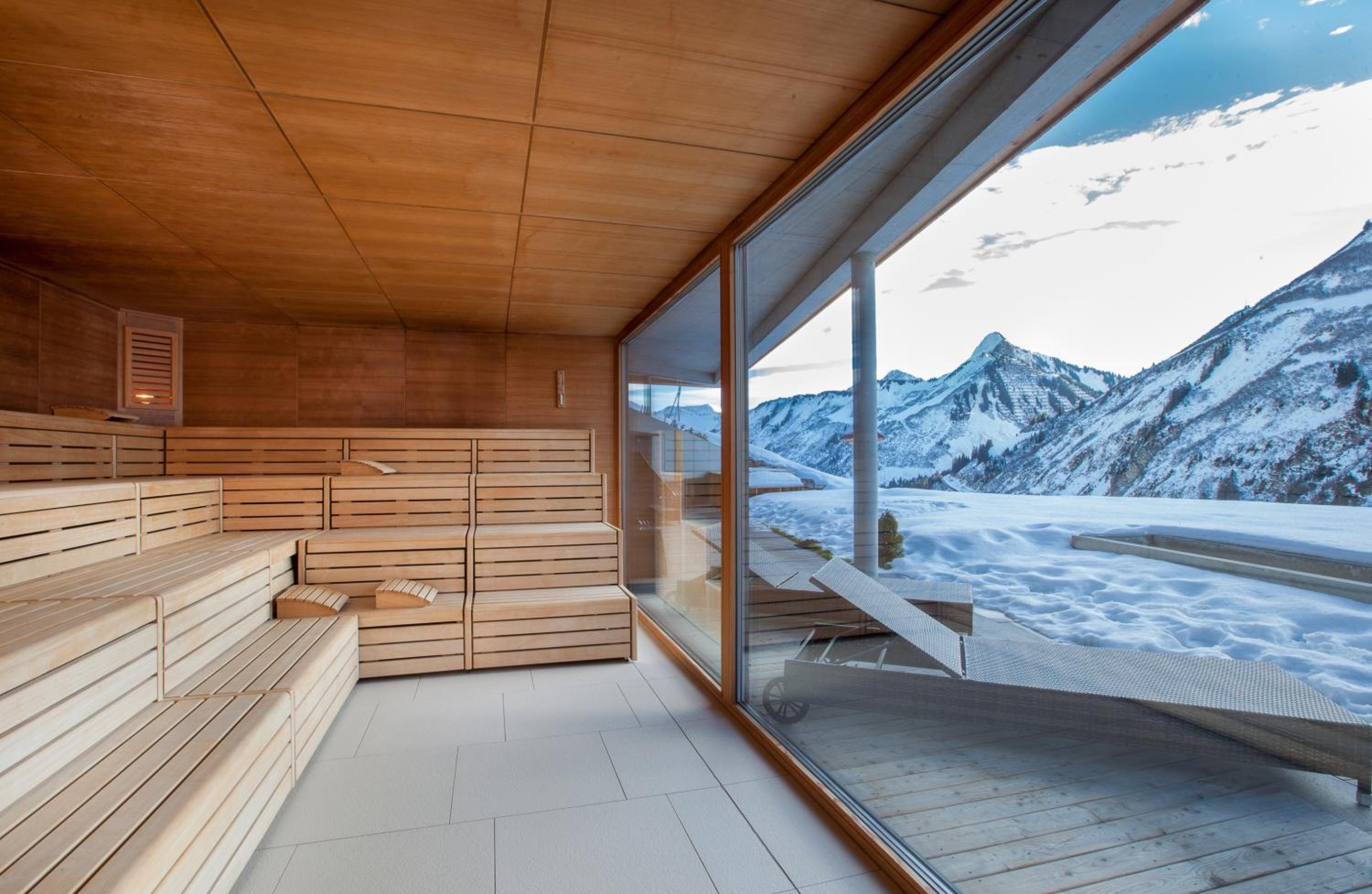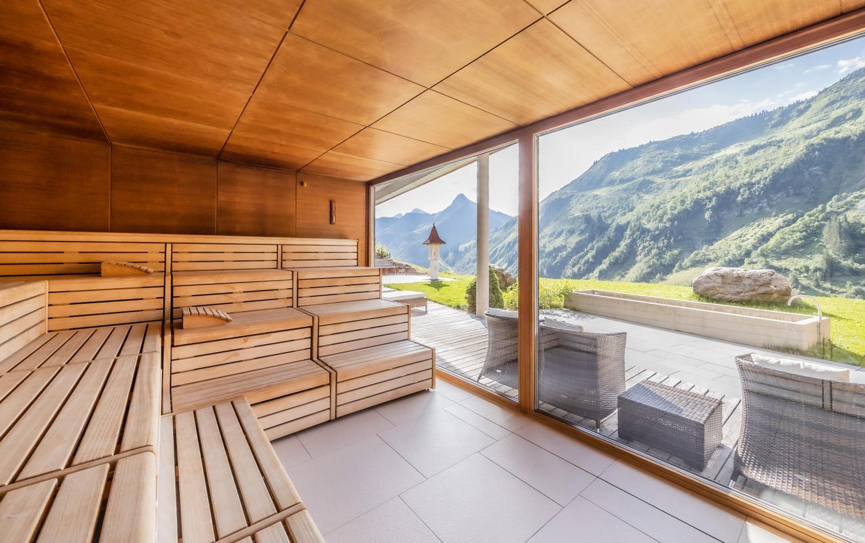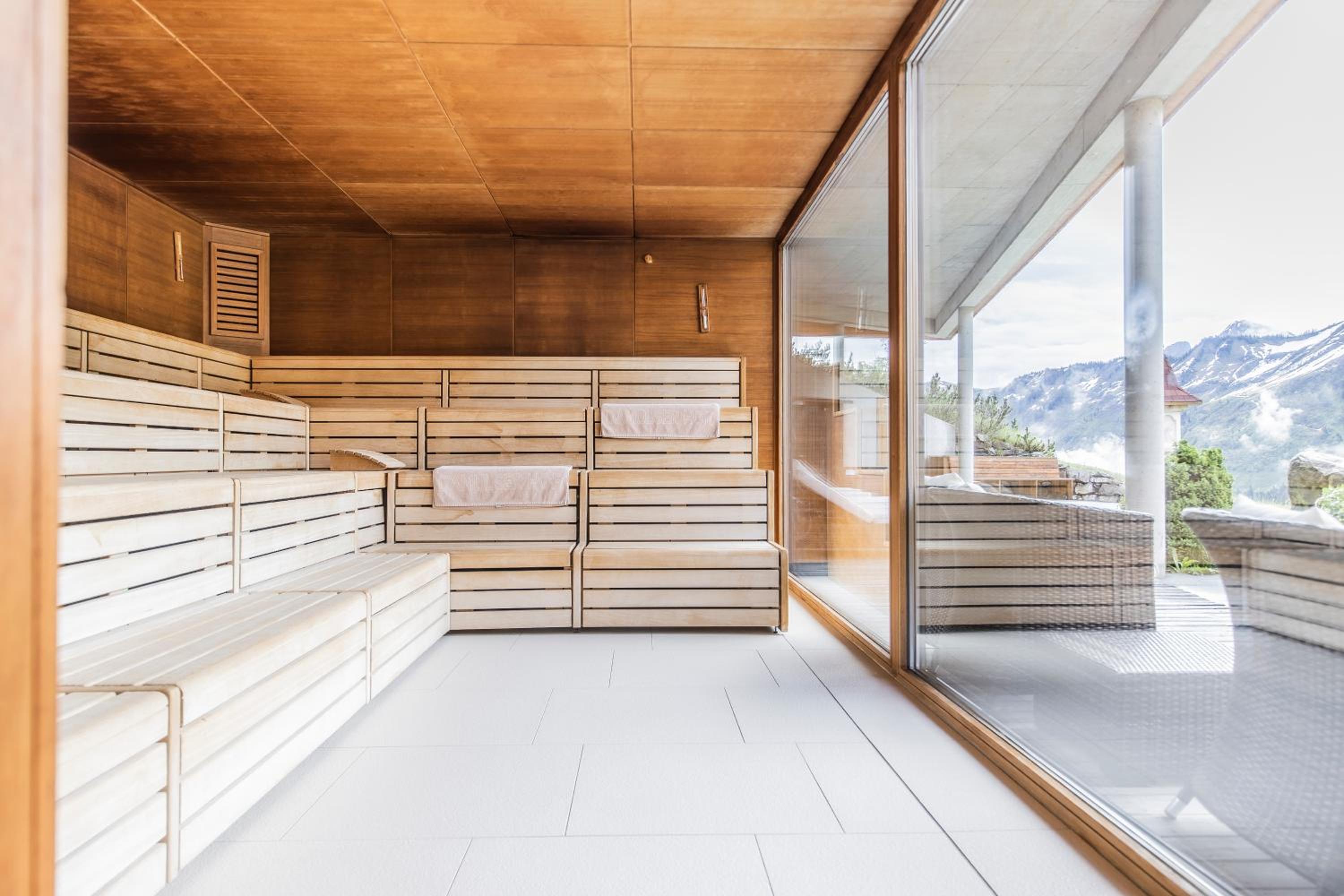 Indulge in the large spa area at Damülser Hof - Wellness & Spa, featuring a Finnish sauna, indoor pool, bio sauna, and more. Relax with panoramic mountain views and treat yourself to rejuvenating massages.