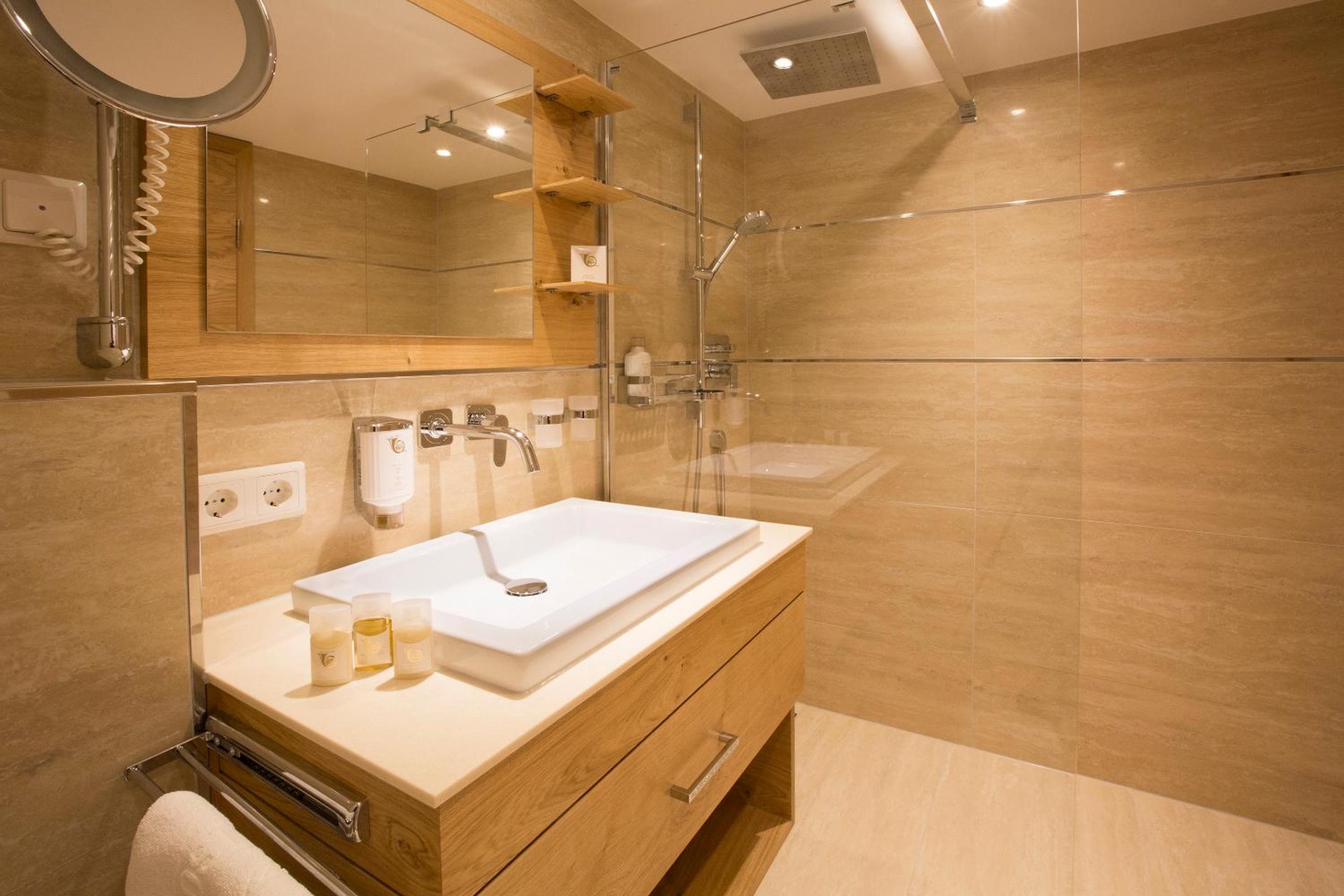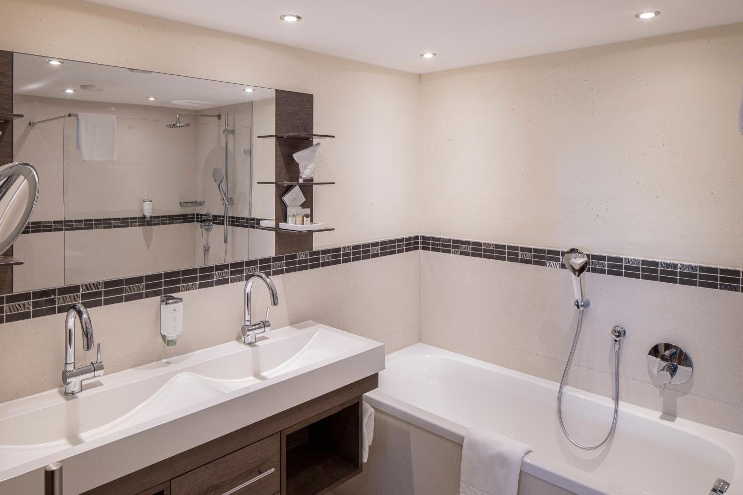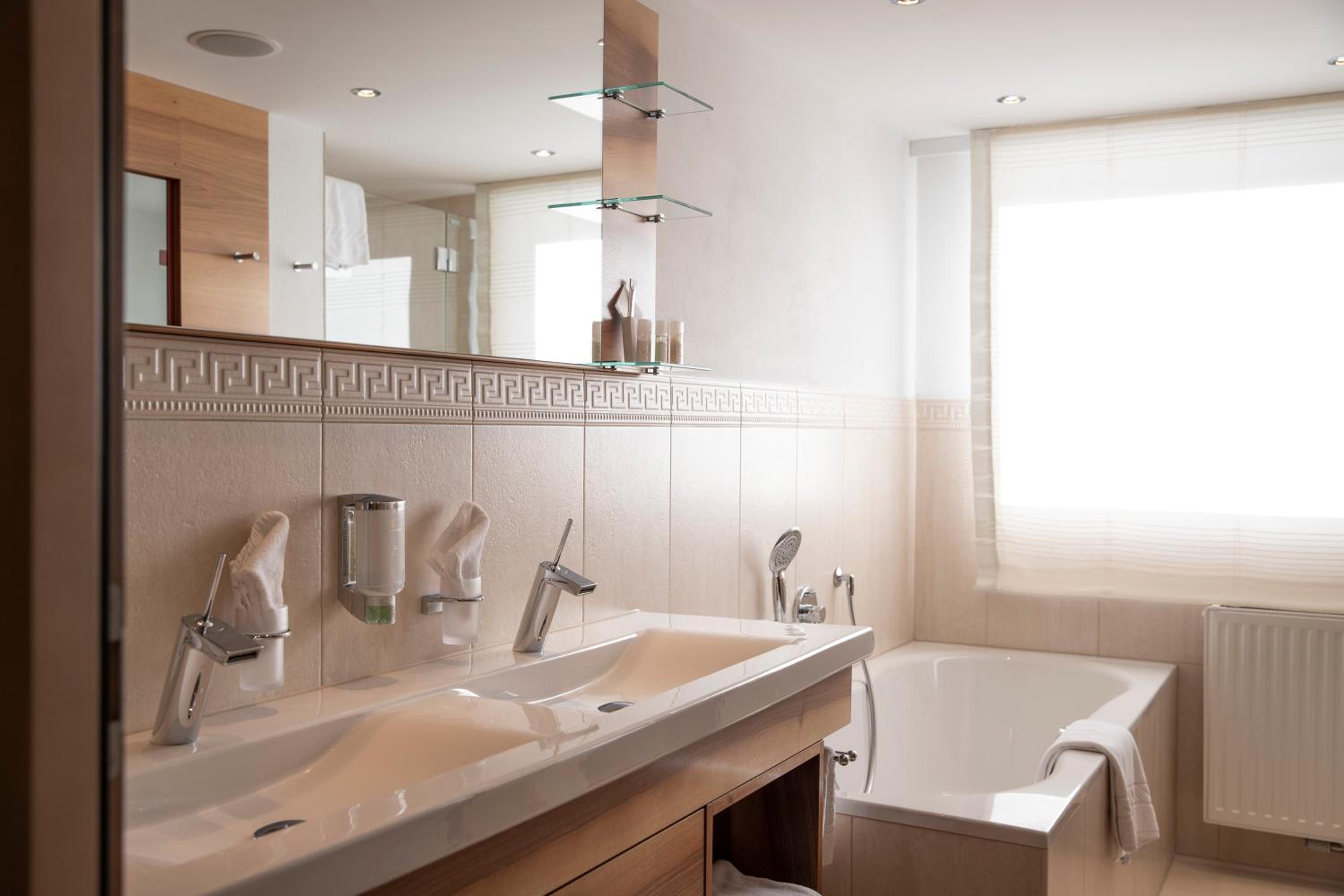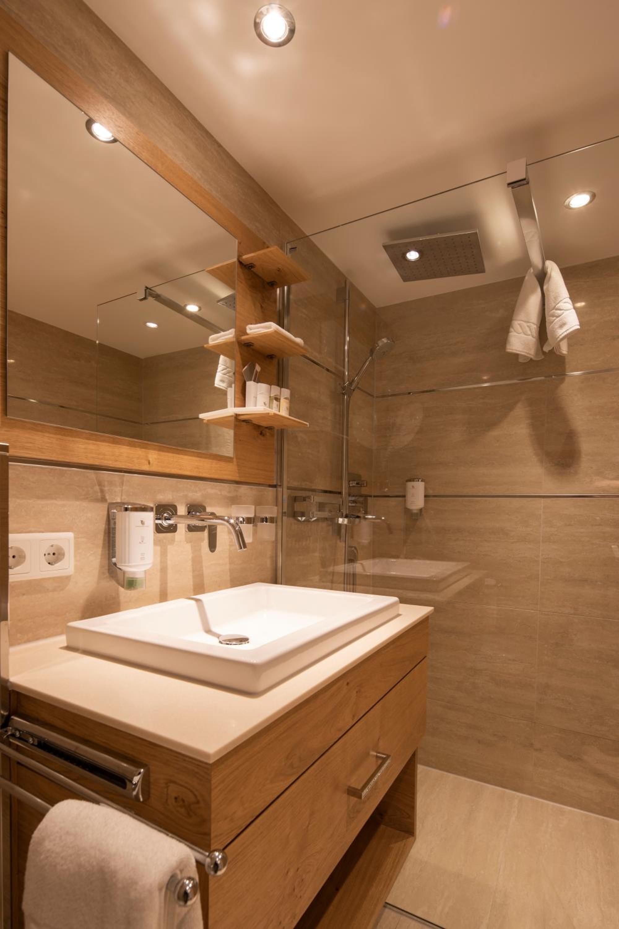 The hotel is conveniently located a few minutes walk from the gondola station. Our room was very spacious and had plenty of storage space. The bed was very comfortable and the room was spotlessly clean. The food in the restaurant was delicious and extremely well presented and all the staff members we met were very friendly, helpful and professional. The hotel bar area was comfortable and a nice area to relax in after skiing! The hotel pool was lovely and the spa area excellent. The ski/boot room was also of a very high standard and ski passes can be bought at the hotel reception. Ski equipment can be hired at Brundl Sports, opposite the hotel. The hotel even has its own ski guide!