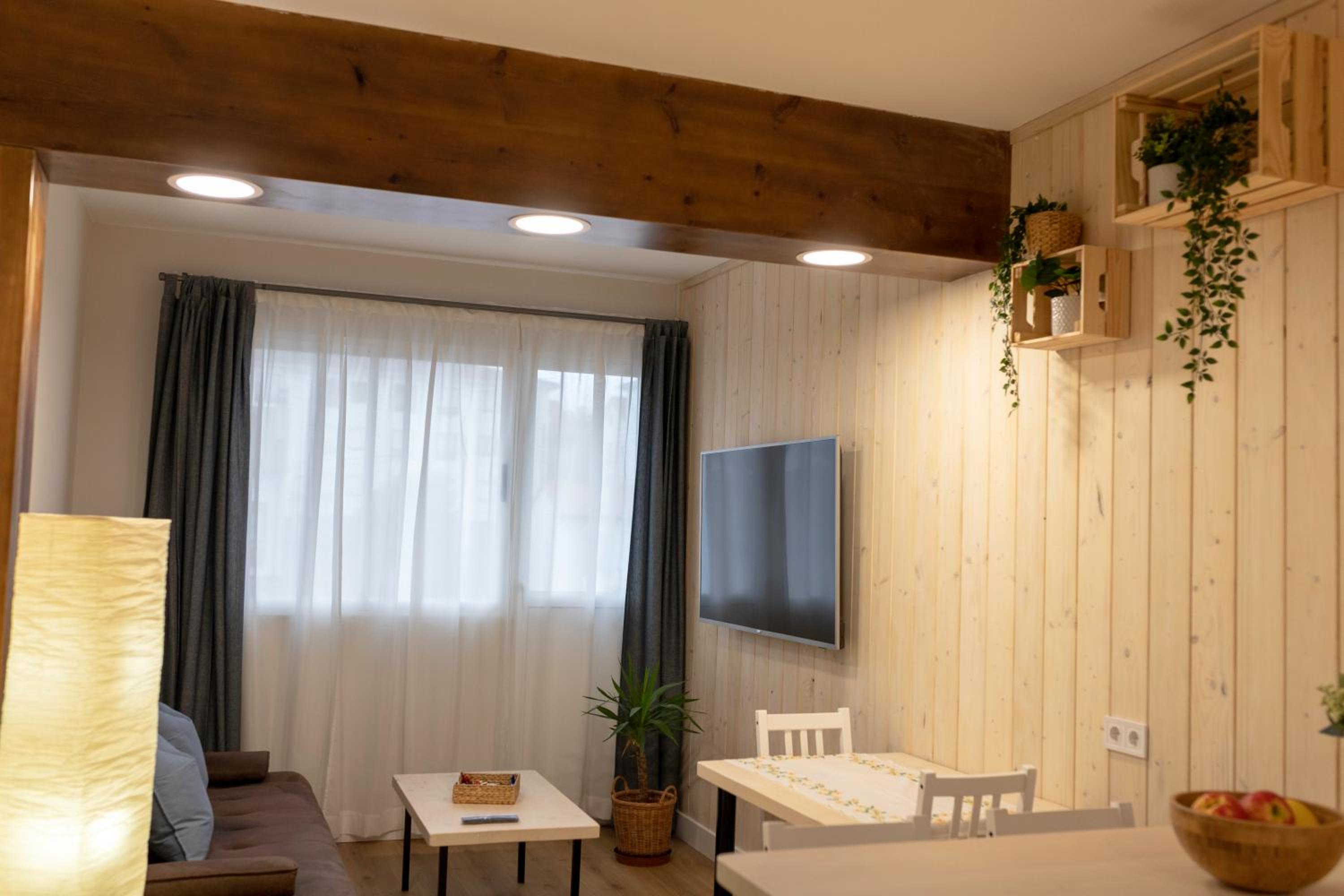 Habitación muy céntrica, con todas las comodidades, con un pequeño balcón y un gran televisor.