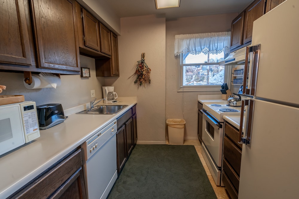 It is on Park Avenue which is one block off of Main Street which is the street with all the bars, restaurants, and shops, but in order to get to Main Street you have to walk down a steep street or sidewalk. The street and sidewalk were both snow and ice covered and slippery. I'm sure this is the situation most of the winter. The building is old but has been updated but not to a degree that I would say that it is exceptional. It is acceptable. My unit was on floor two which was about 15 stairs down from the entry door. There is a defacto lobby that is about 10 stair up from the entry door. There is no desk attendant in the lobby. I had to check in and get my instructions from the sister property that is about two blocks away. This wasn't a big deal for me as I new where the place was, but it is inconvenient . Once through the front doors and down the stairs my unit was towards the front of the hallway. The hallway is old, narrow, and kind of dingy. My first impression of the unit was just the same, kind of dingy. The carpeting is worn and there is old base board heating that is not functional and makes the place look old. Also, the shutters on the windows and old and crocked. The stove was an old electric unit and the mattress on the bed was thin and very firm, either very old or cheap. The toilet flushed very slow and the shower took at least 5 minutes to get hot. Too much money for the quality.