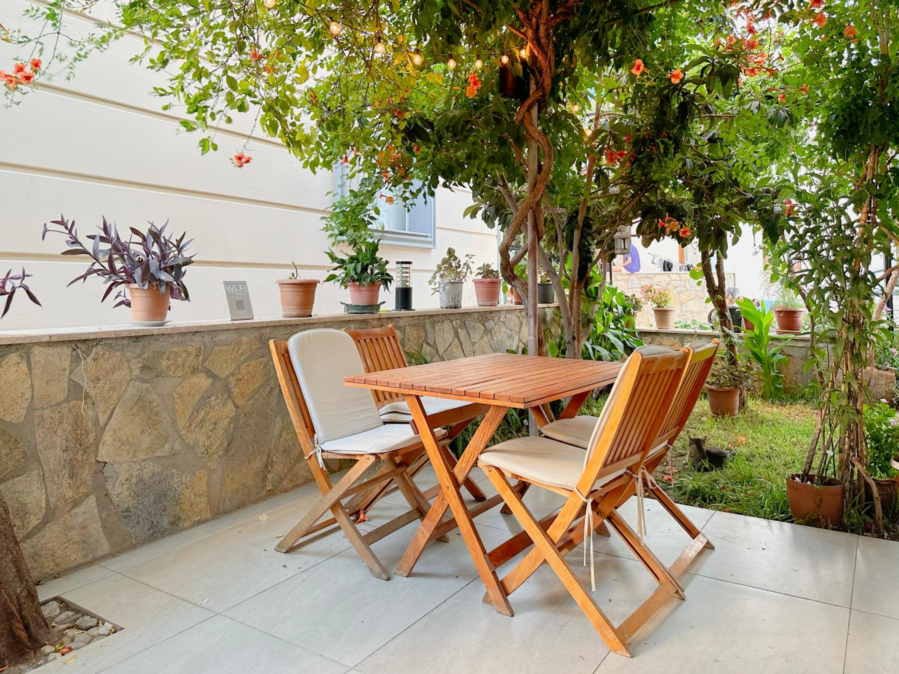 Guests can unwind on the terrace at Kaya Apart Datca, enjoying picturesque views of the sea and the town. The perfect spot to relax after a day of sun and sand.