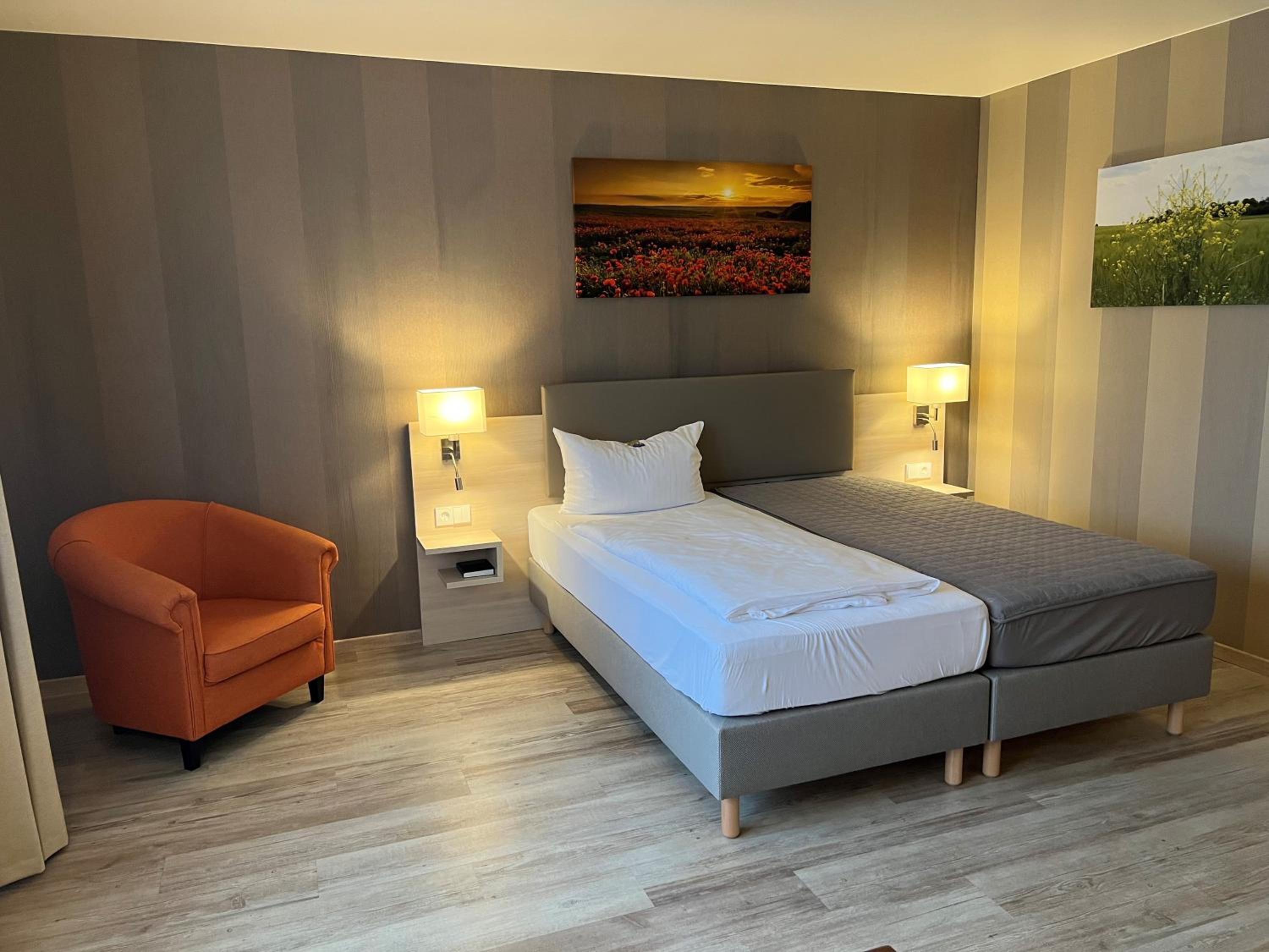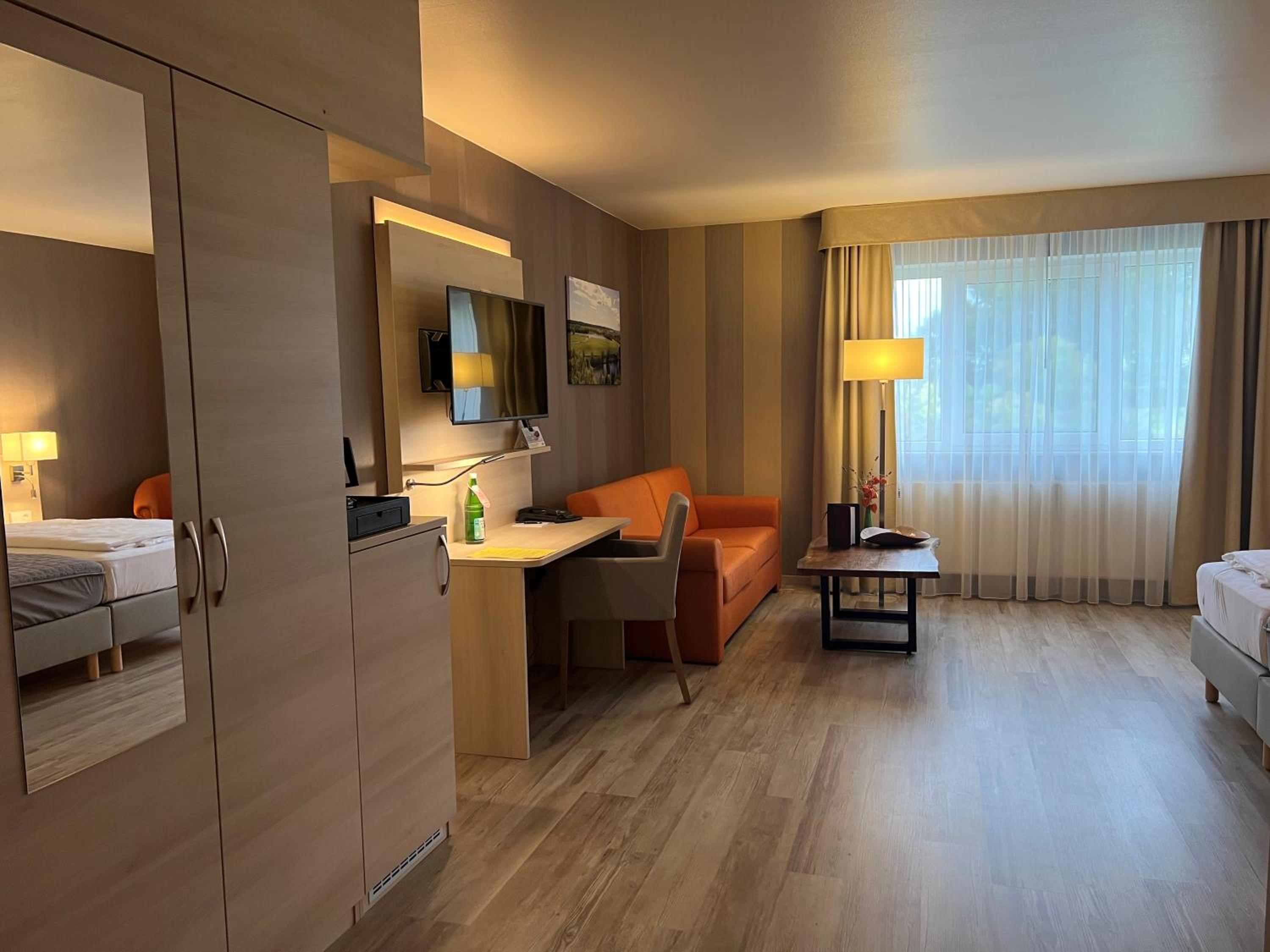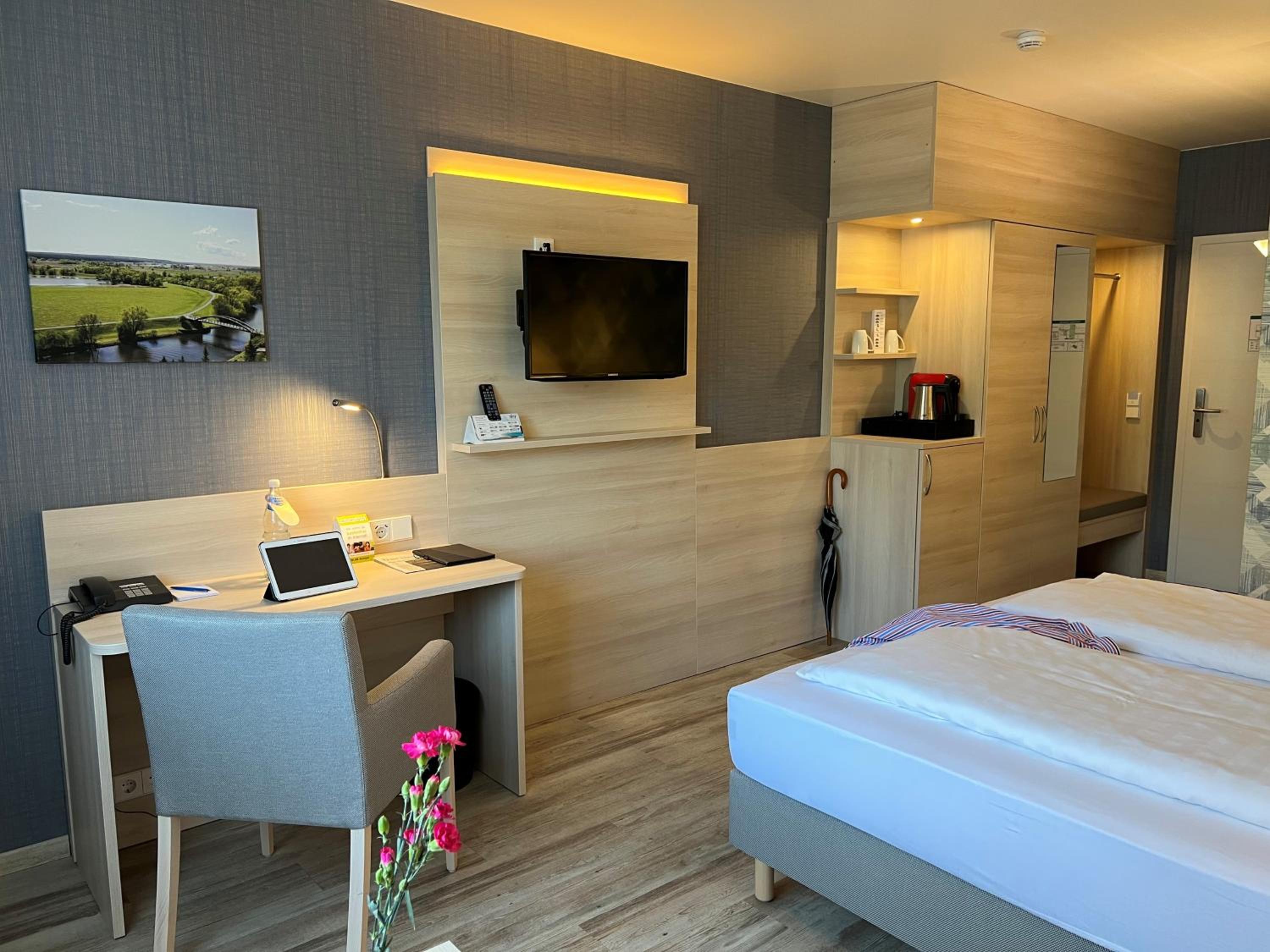 Kleines nettes Familienhotel in relativ ruhiger Lage, großes neu renoviertes Zimmer, netter und freundlicher Service, gutes ausreichendes Frühstücksbüffet , Ladesäule für E- Mobile,