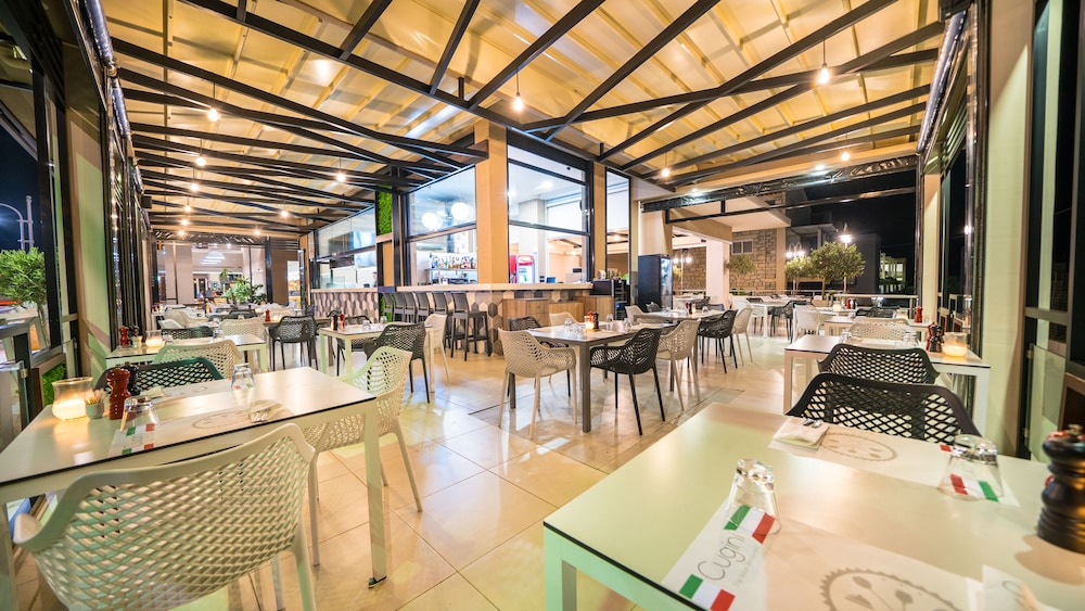 Indulge in Greek cuisine at Waves restaurant with beachfront views and poolside bar.