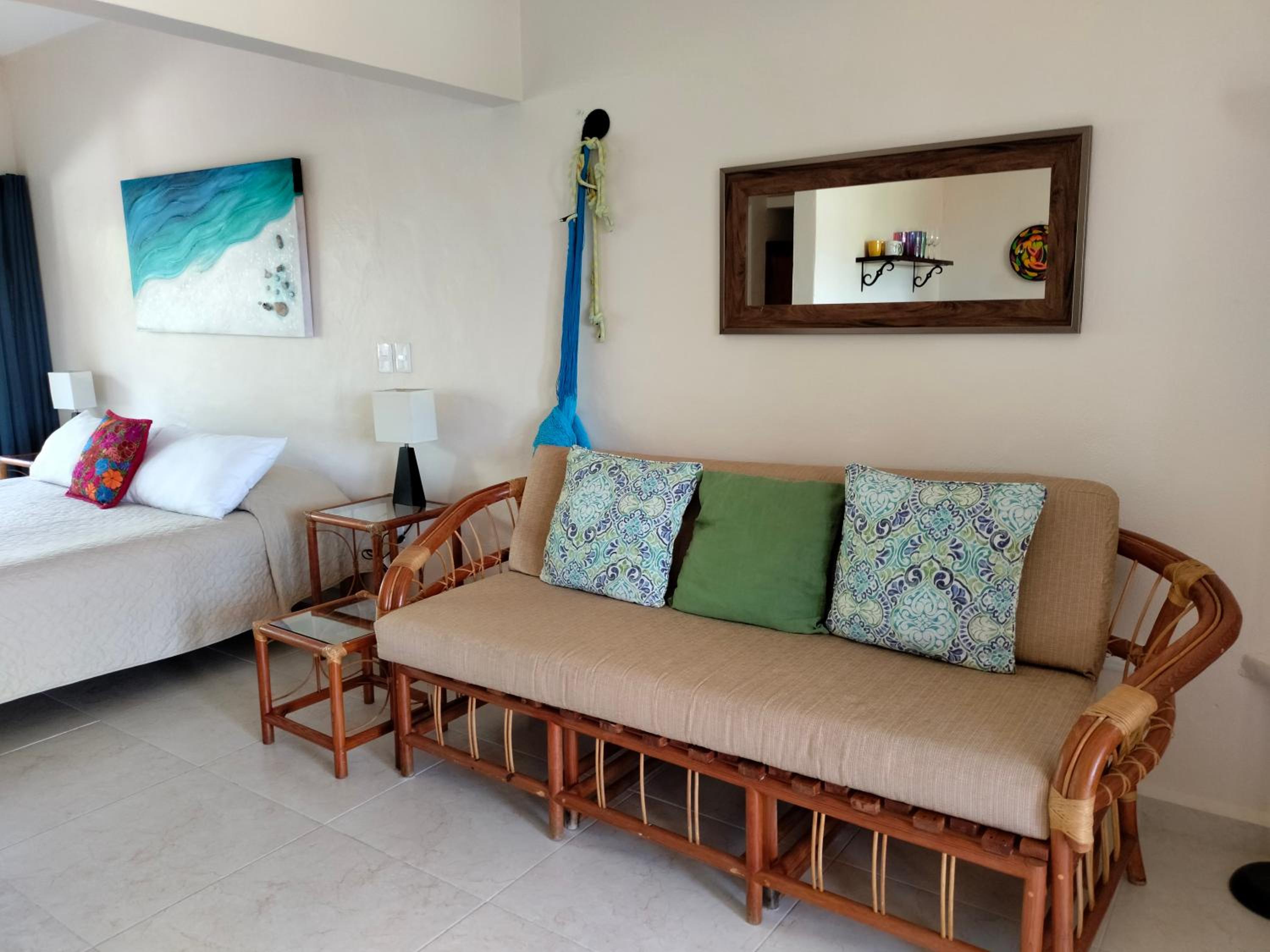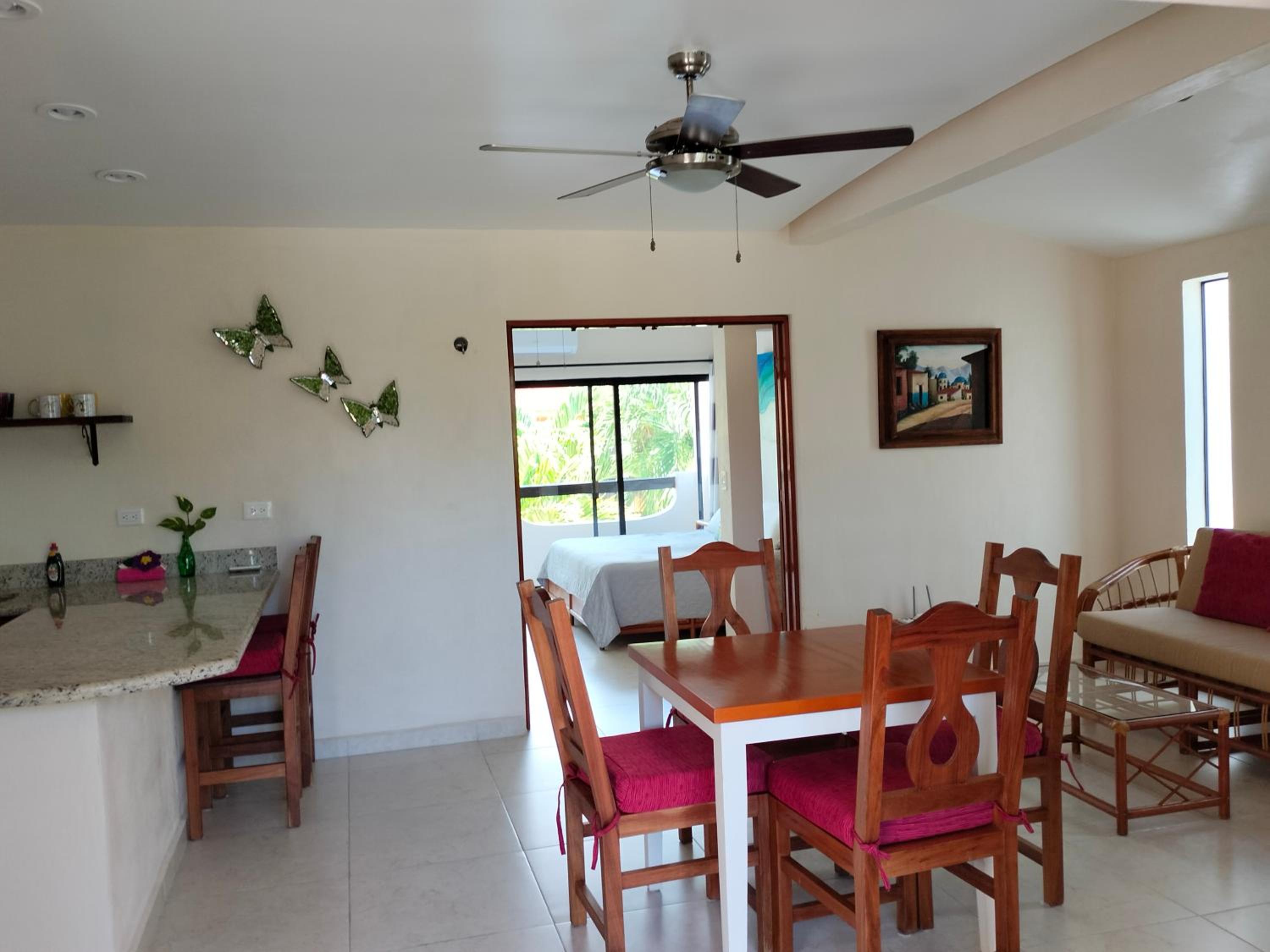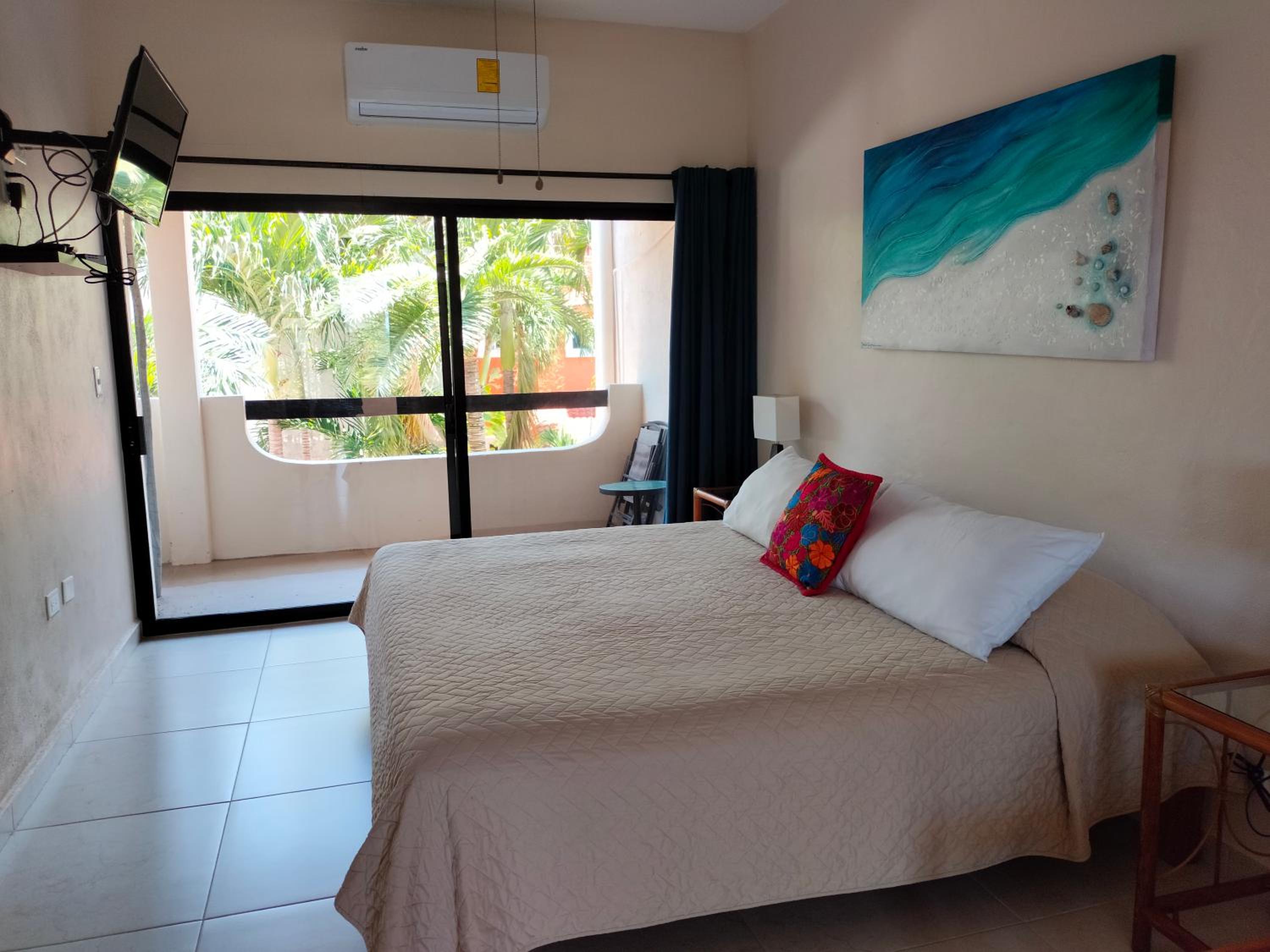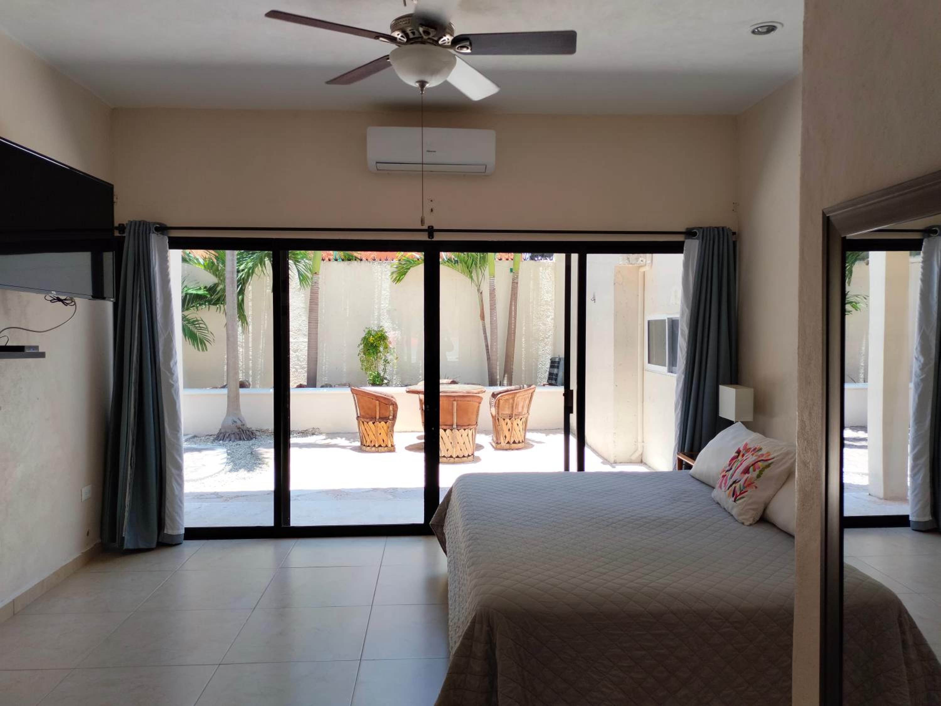 We had a great stay at Cabanas. The studio was large and comfortable. I especially appreciated the private deck with table and chairs, kitchen, good air conditioning, and Myron, the friendly owner who is responsive and nearly always available. The beautiful beach is nearby (less than 2 blocks) and collectivos, which can take you to many locations, run right outside.