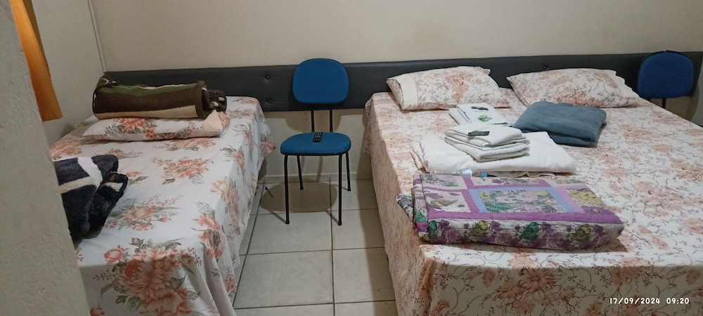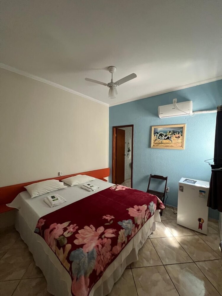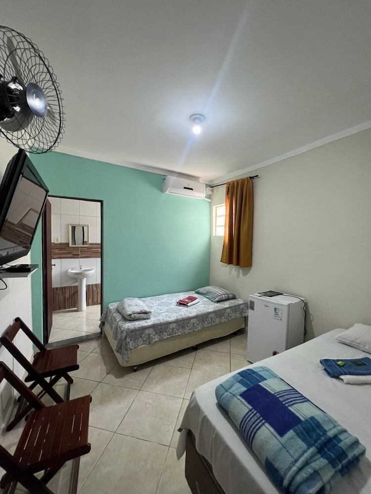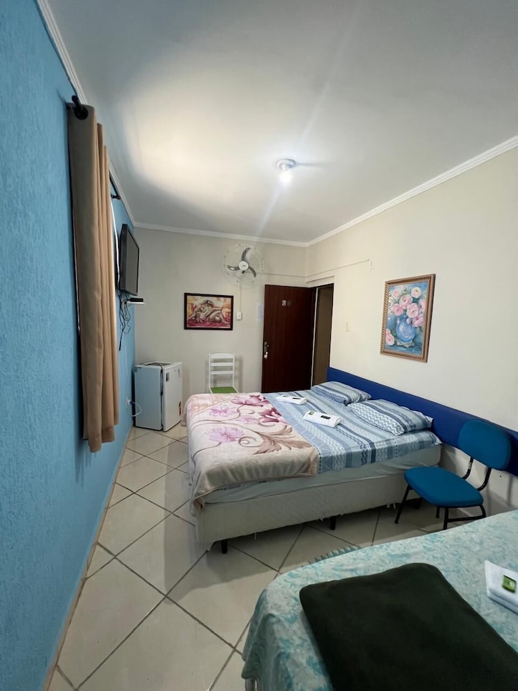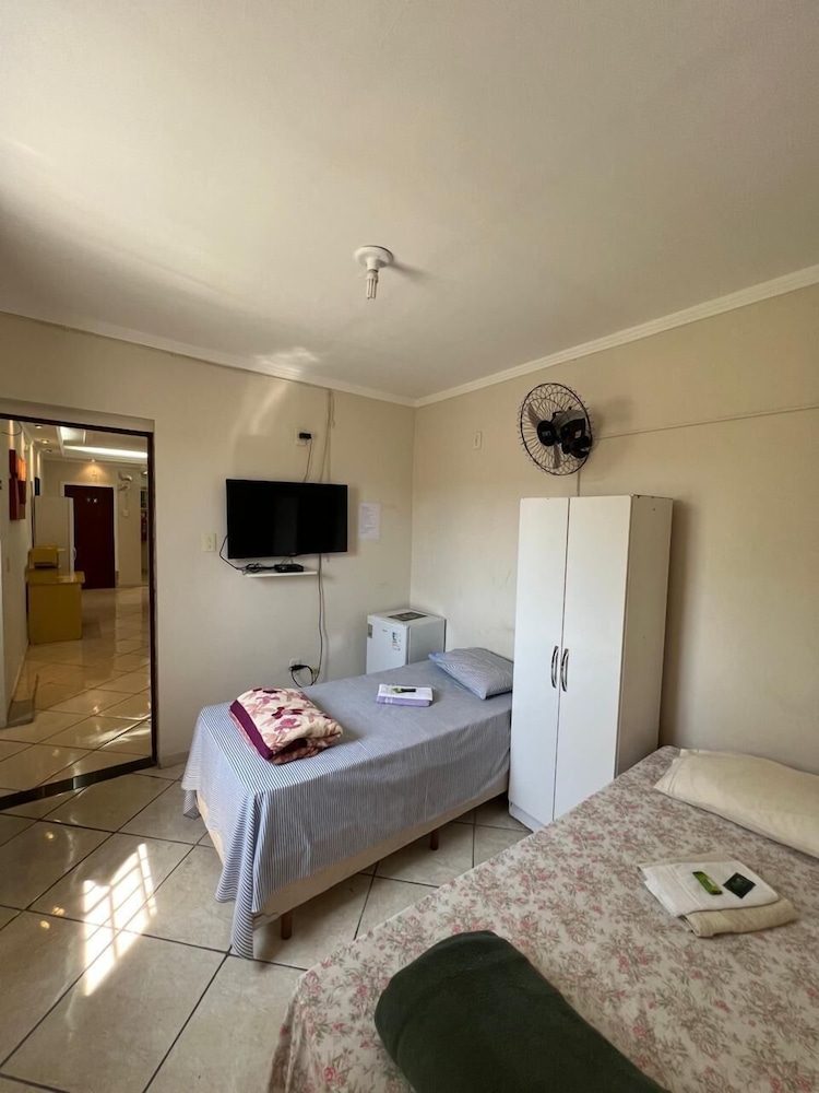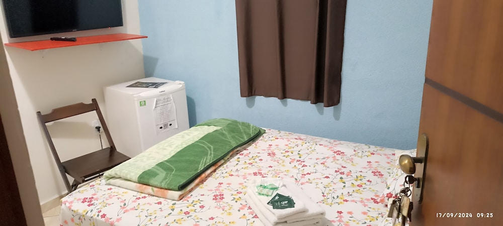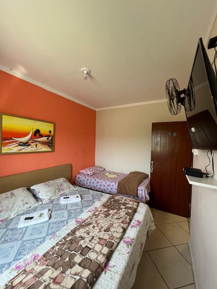 Quanto à acomodação, é modesta, camas razoáveis, banheiro ok, não tive nenhum problema, TV com tamanho legal. Café da manhã simples, a proprietária foi muito educada e se dispos a fazer ovos mexidos para nós na hora, o resto foi básico: pão, manteira, leite, bolo, também tinha disponível torradas e geleias. O frigobar não pode ser usado, serve apenas para o que o dono vende. Estacionamento é na rua, de frente para o hotel.