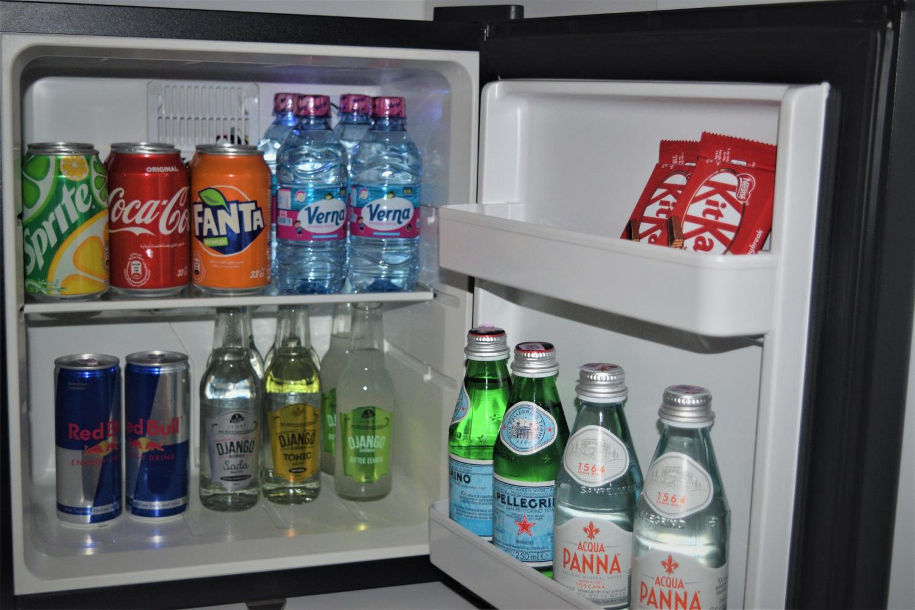 The fridge had complimentary drinks, good wifi, and nice AC.
