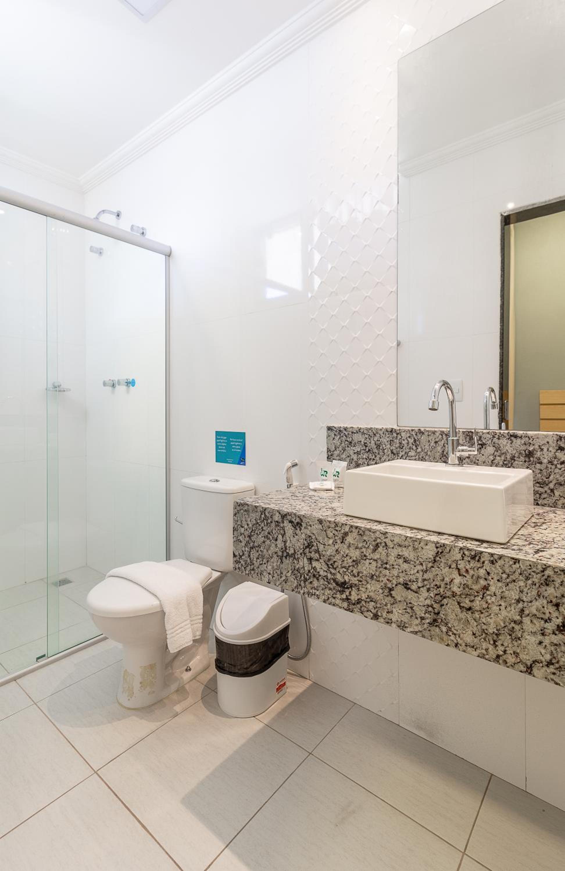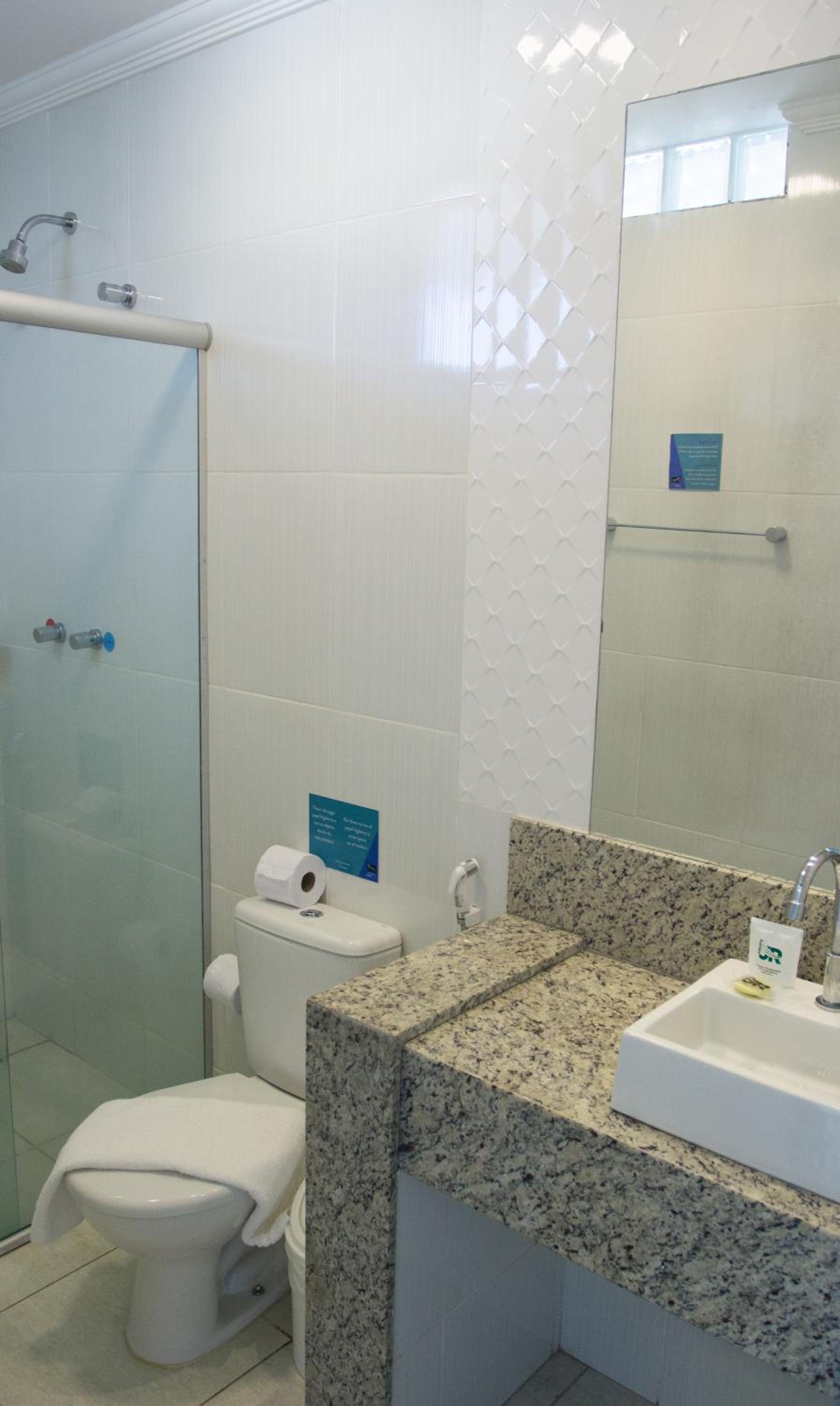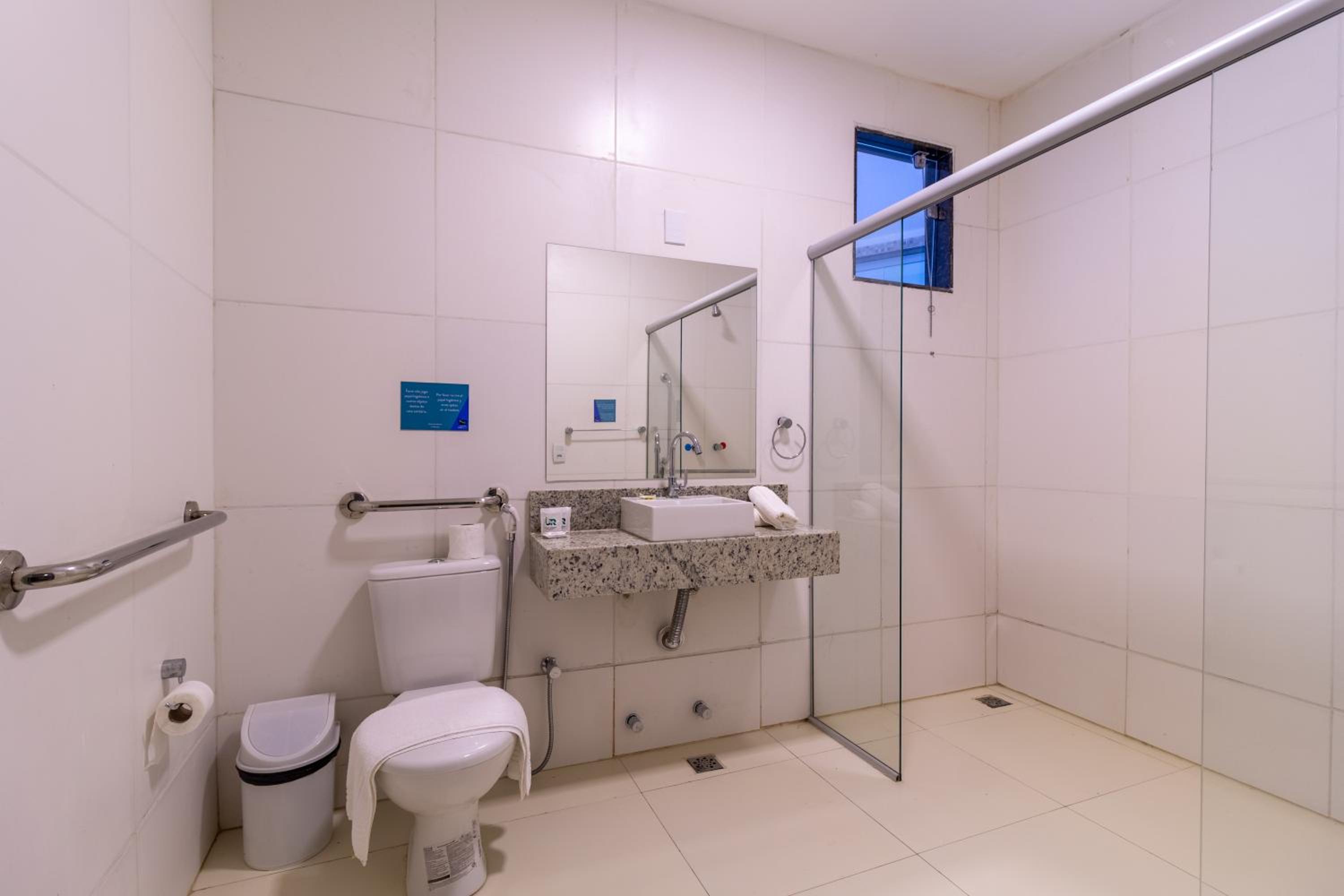 Nem de longe é um hotel 4 estrelas. Não tem lugar de colocar seus produtos de higiene no banheiro (como shampoo, condicionador, óleo e etc), o vaso é muito baixo e pequeno; a pia é pequena e quando você abre acaba se molhando e molhando também o chão. Não tem telefone no quarto para se comunicar com a recepção.