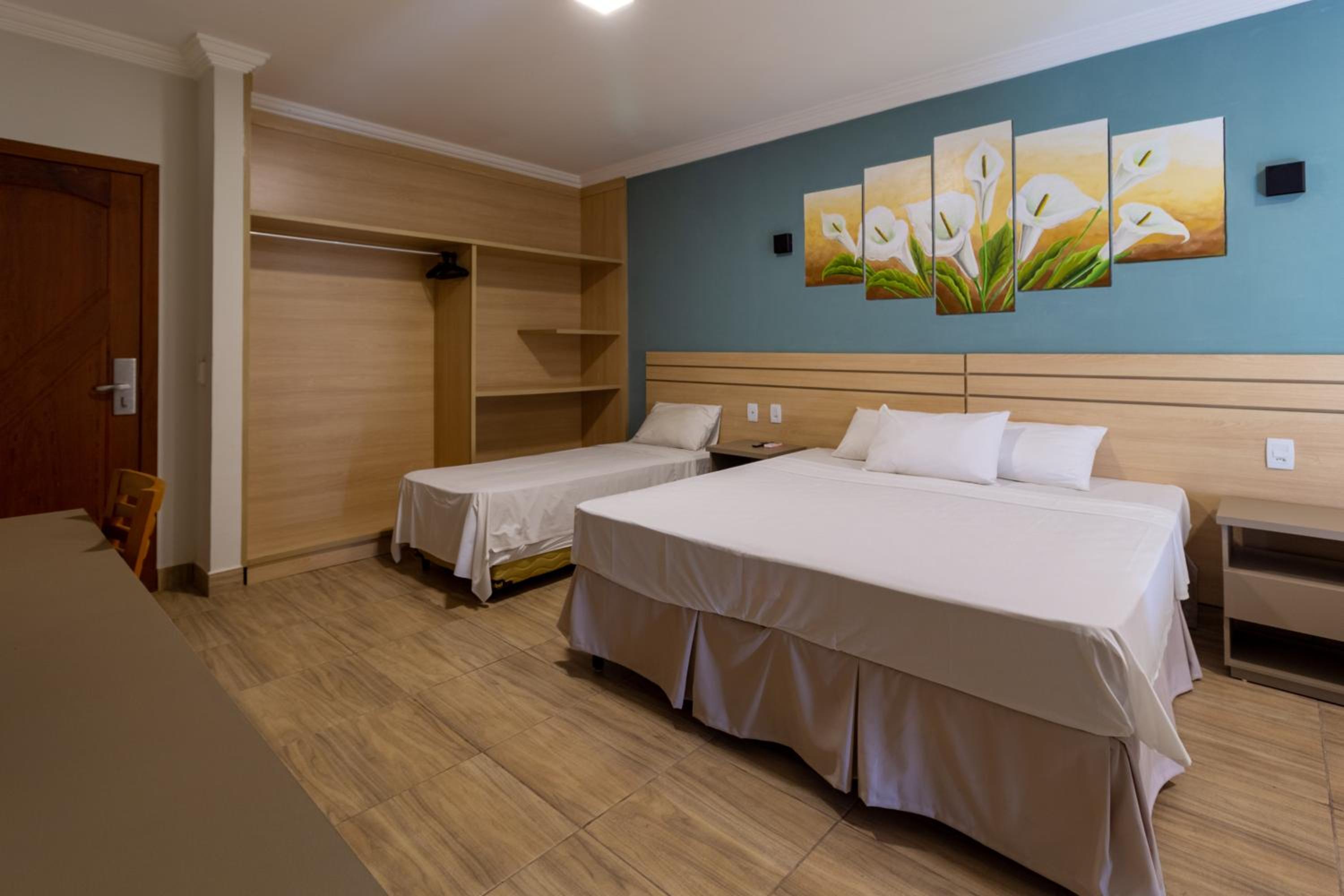 Os quartos são espaçosos e o lugar de colocar roupas é muito bom. A localização do hotel é muito boa.