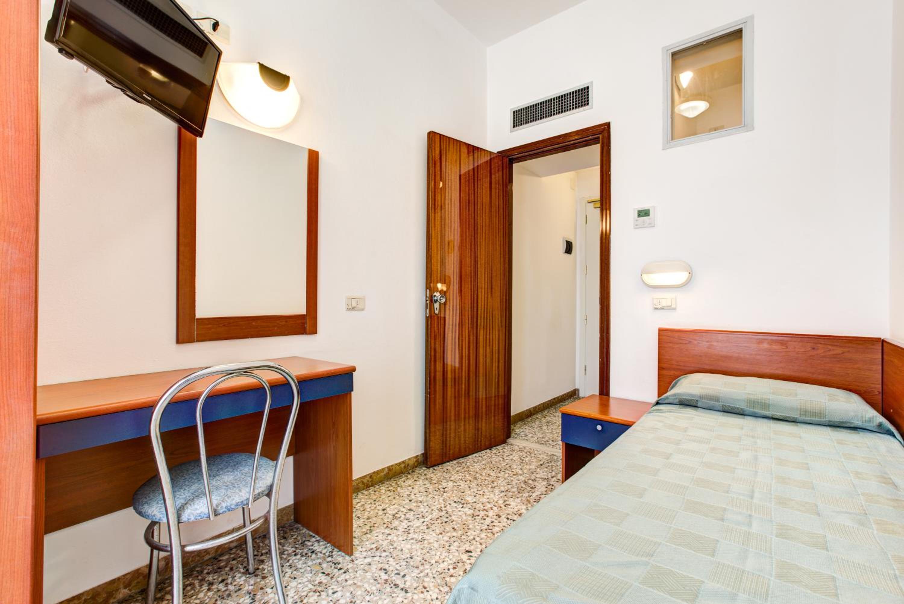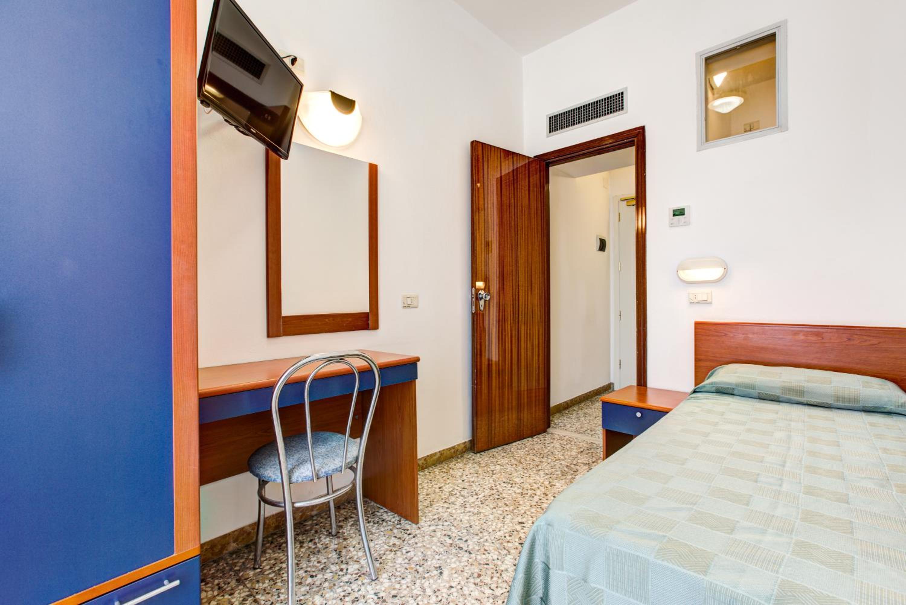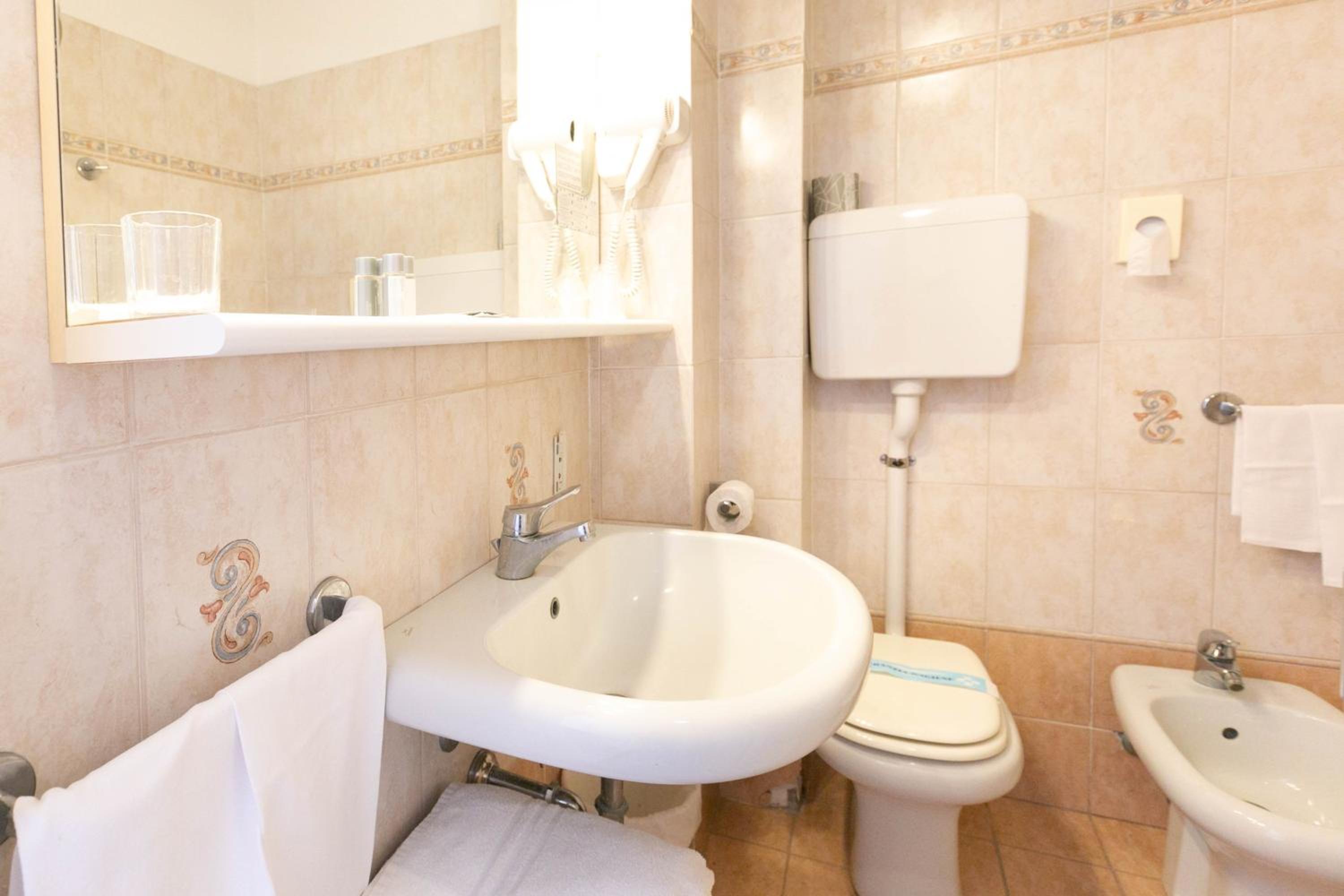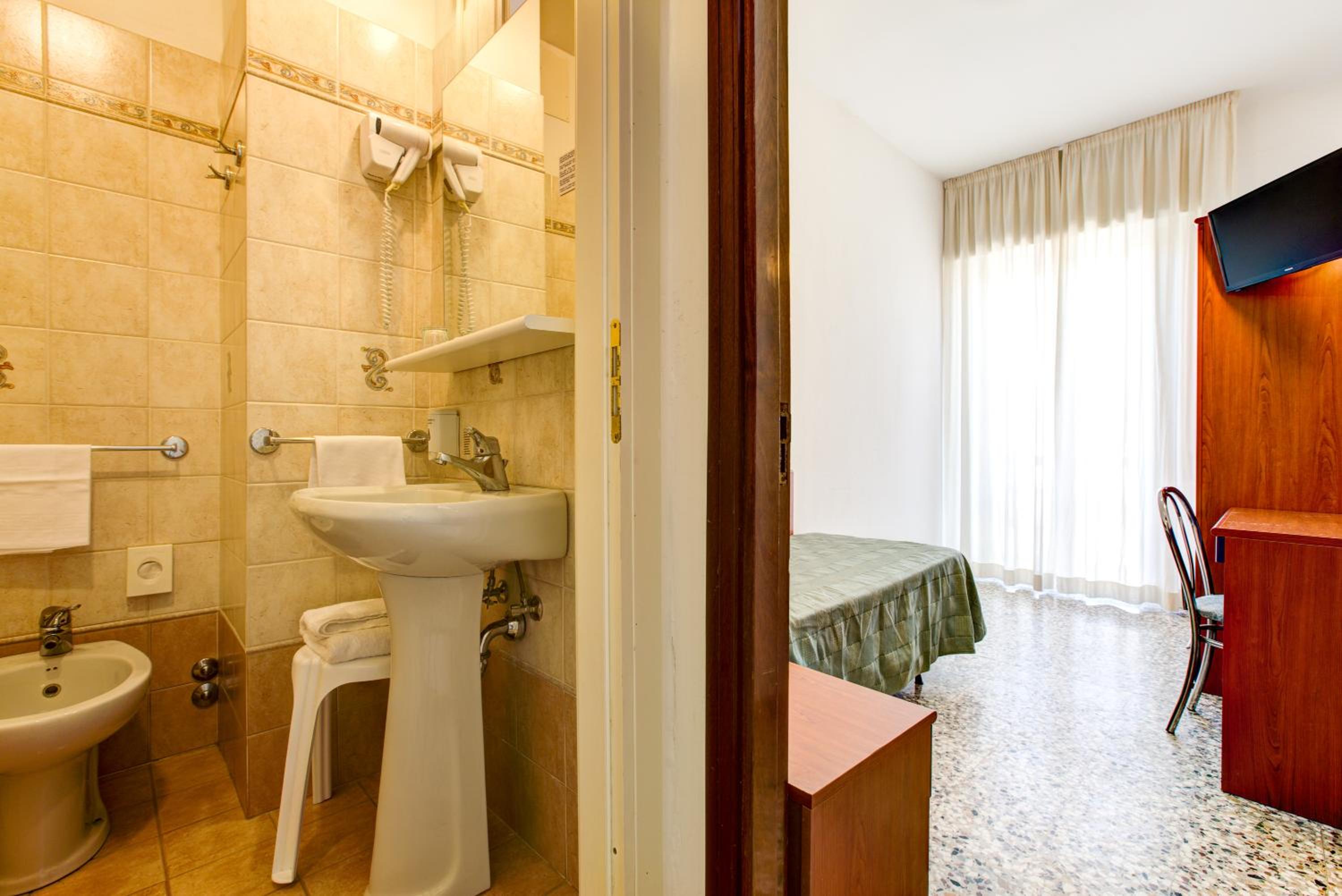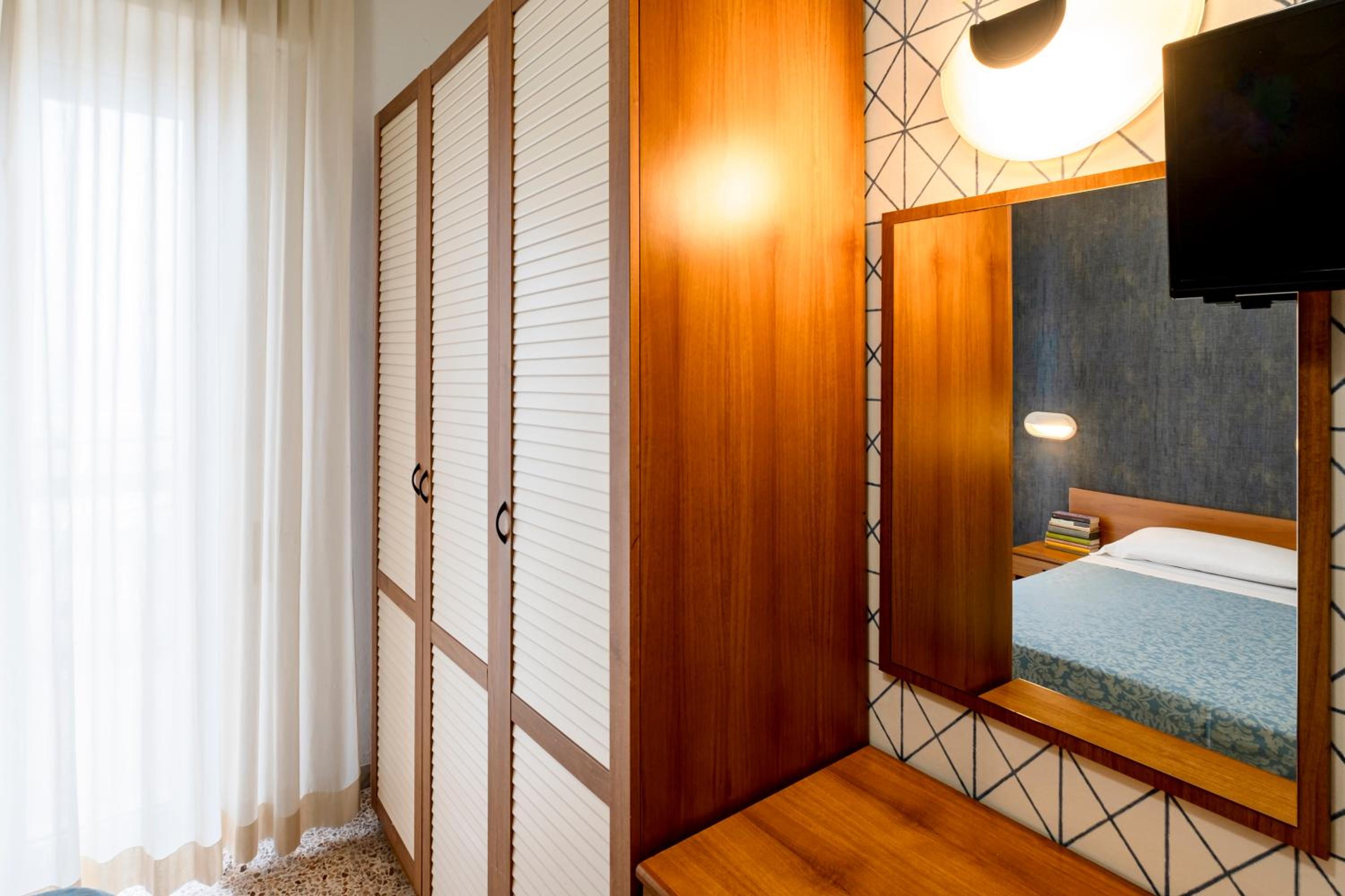 Note negative e quindi voto 5: la stanza è piccola e l'arredo un po' vecchiotto e improvvisato (sedie di legno pieghevoli, porte vecchie). Non un quadro alle pareti o un appendino, per rendere la camera più confortevole. Anche i sanitari del bagno, e anta doccia andrebbero cambiati perché ormai vecchi e usati. Devo aggiungere però che era pulita e il letto comodo. La reception nin era stata delle più accoglienti. Tra i serizi elencati c'erano piscina con lettini (un po' sacrificata, ma ok) bici a disposizione, si ma solo a pagamento, frigobar che in stanza non c'era. Era menzionato il parcheggio a pagamento, che però meglio prenotare nei mesi estivi per non trovarsi senza.