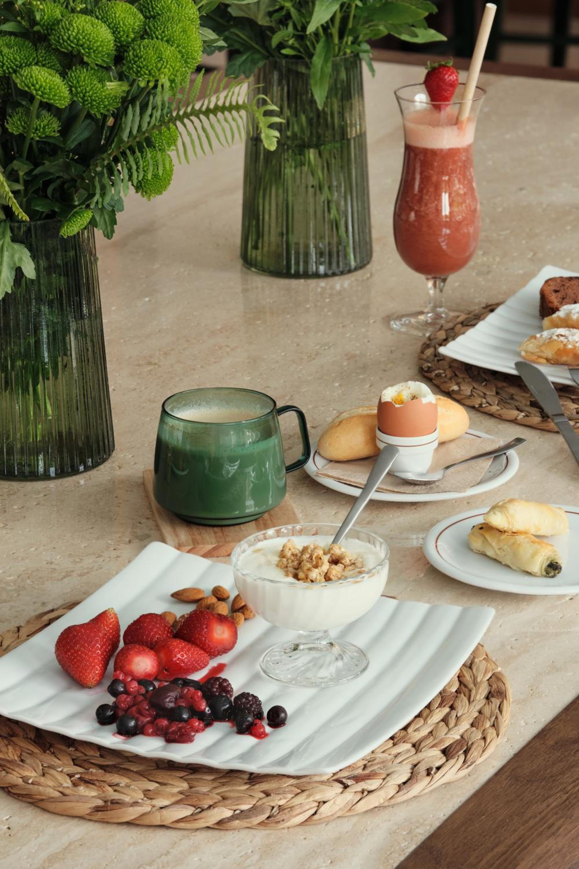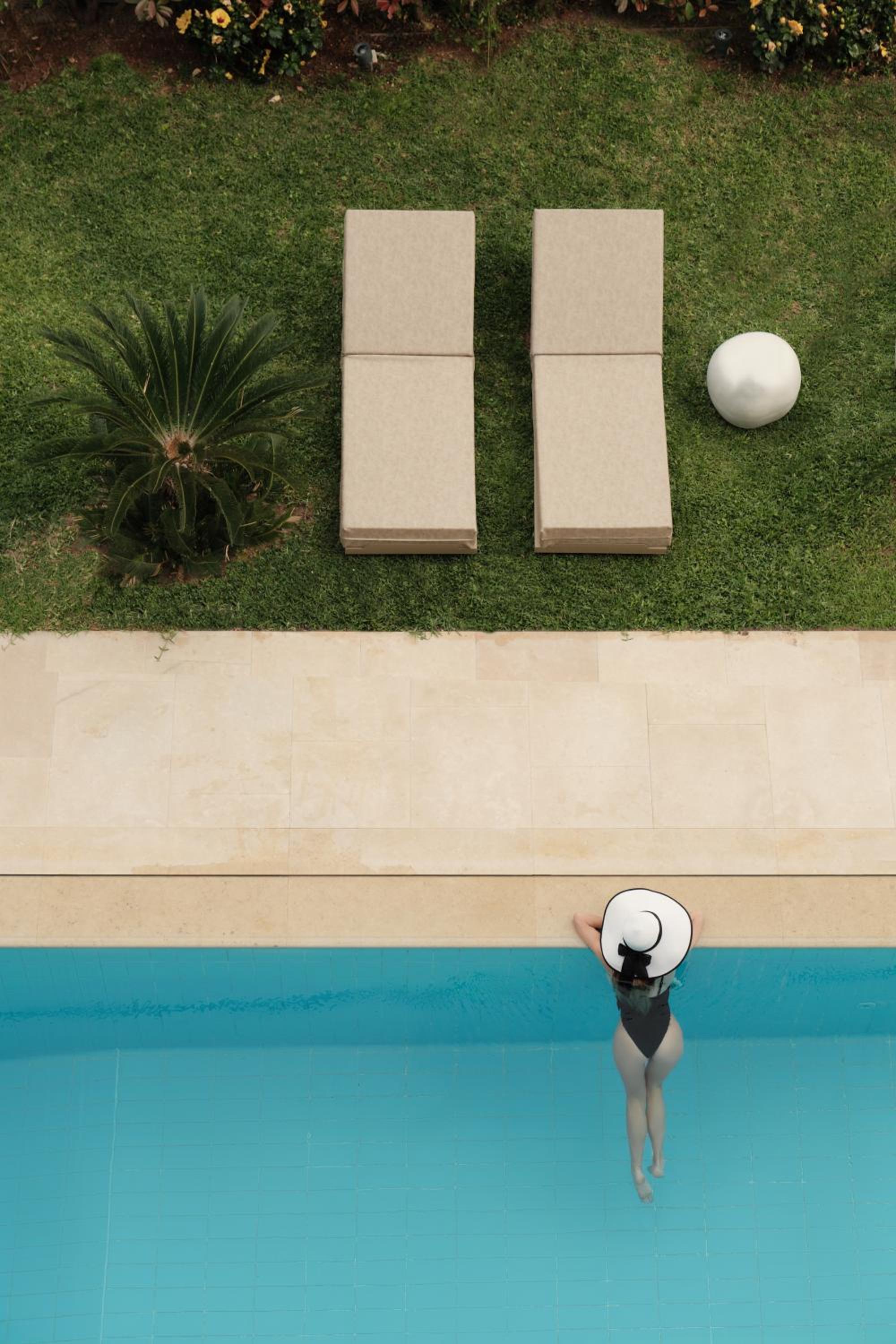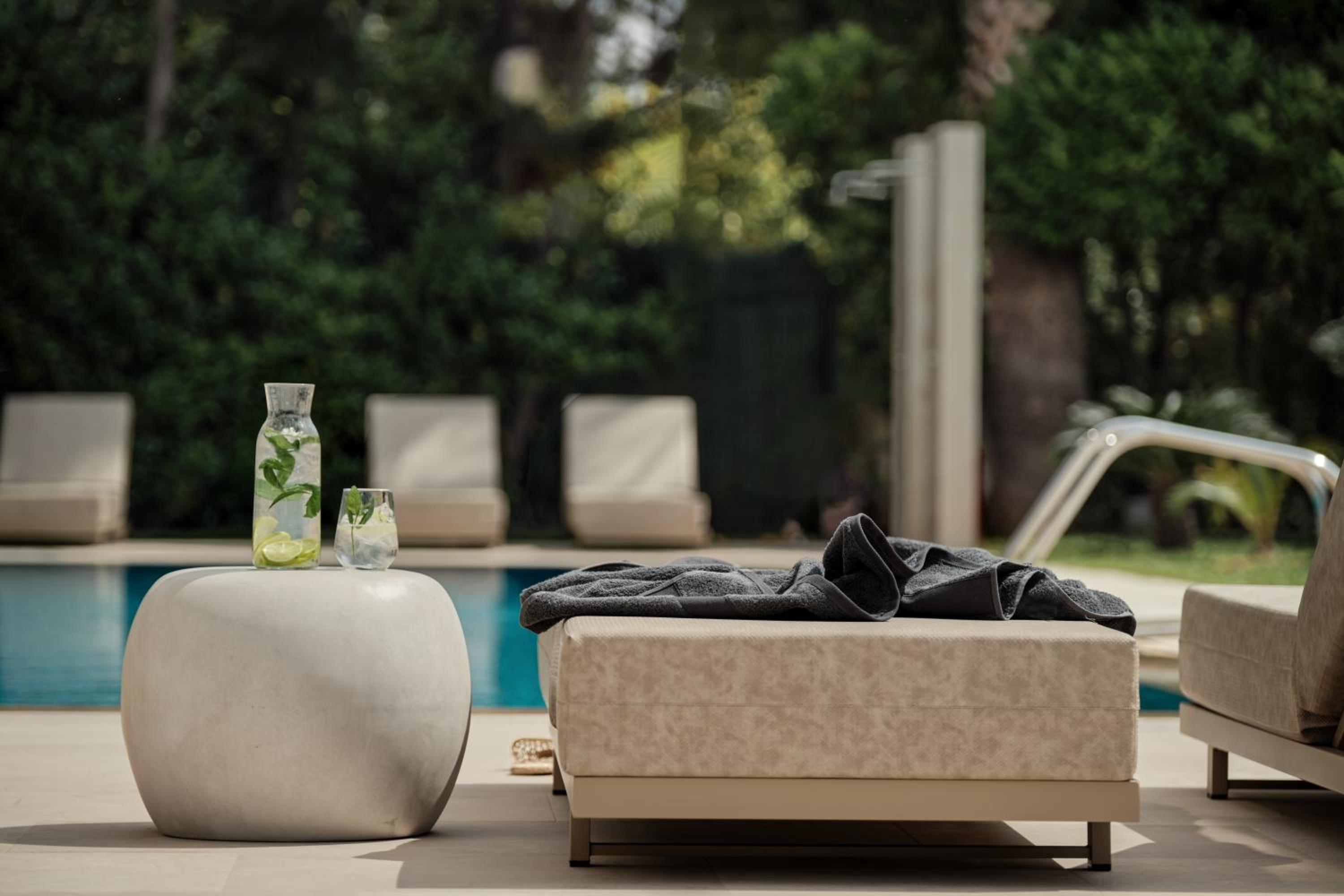 Unwind in the hotel's blossomed garden by the pool, savor Mediterranean cuisine at the restaurant, or sip on a refreshing drink at the main bar. Each room offers modern amenities for a comfortable retreat.