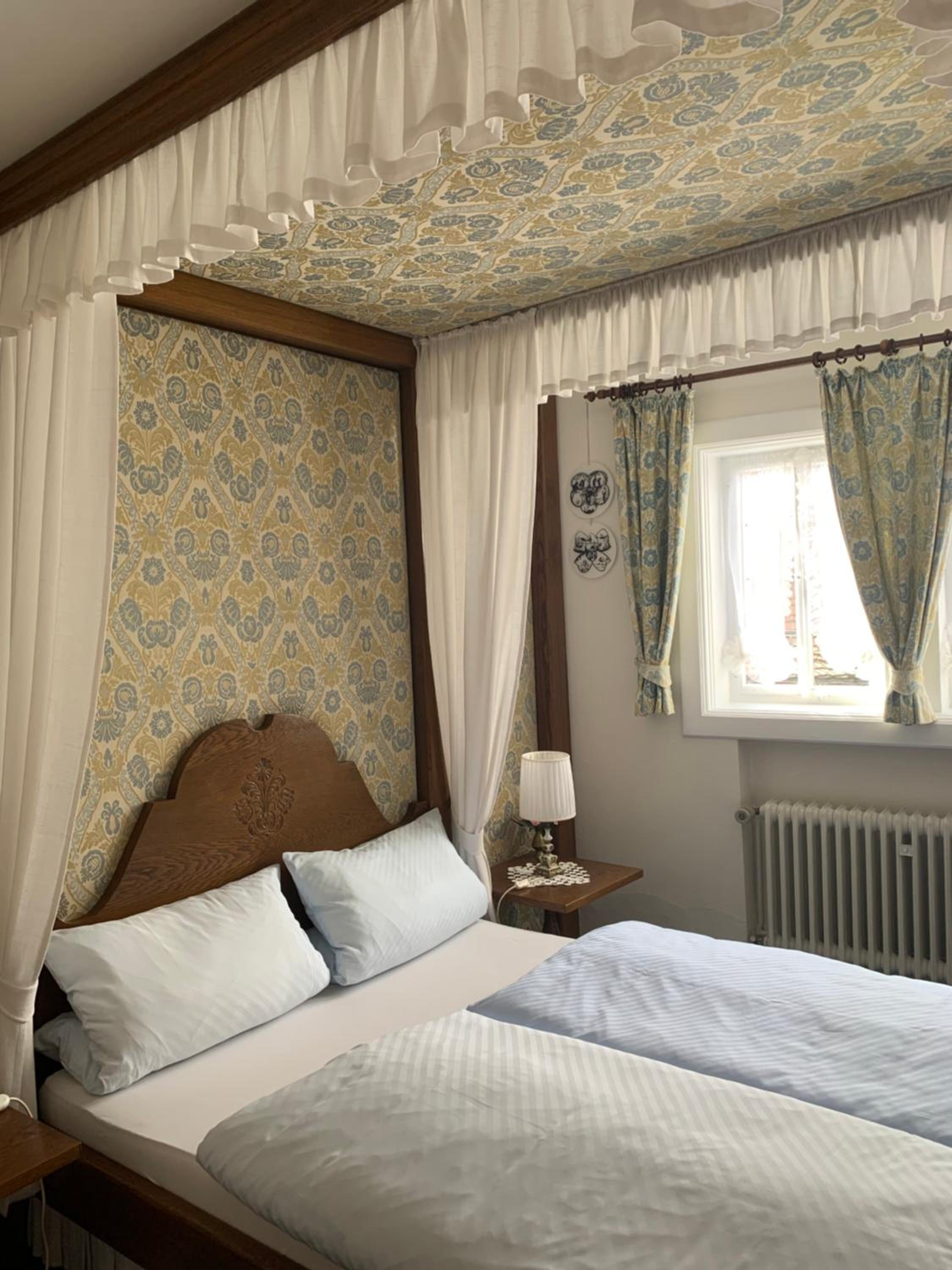 Historic Inn, stayed with my dad and he was so happy to stay at one of the most famous timbered houses in town. No English is spoken by the people who run it but nothing a translator app can’t help with. We emailed ahead to let them know we’d be arriving after dinner, check in was easy! It is an experience to stay in a very well preserved home, room showed history and character and were sparkling clean, hot water is great. Bedding and towels were so comfortable and also equally pristine. Breakfast is also so charming and very good value! Note they request cash settlement for check out. We drove and were given kind instructions on where to best park- there isn’t great parking right by the house but we knew this and packed a day bag for our stay to avoid bringing our suitcases on the cobblestone. There is free parking overnight by the church which is about a 3 min walk. There is an elevator inside the property. The restaurant right next door is also fun, apparently you need a reservation normally as it gets busy but we got lucky and squeezed in for an evening.