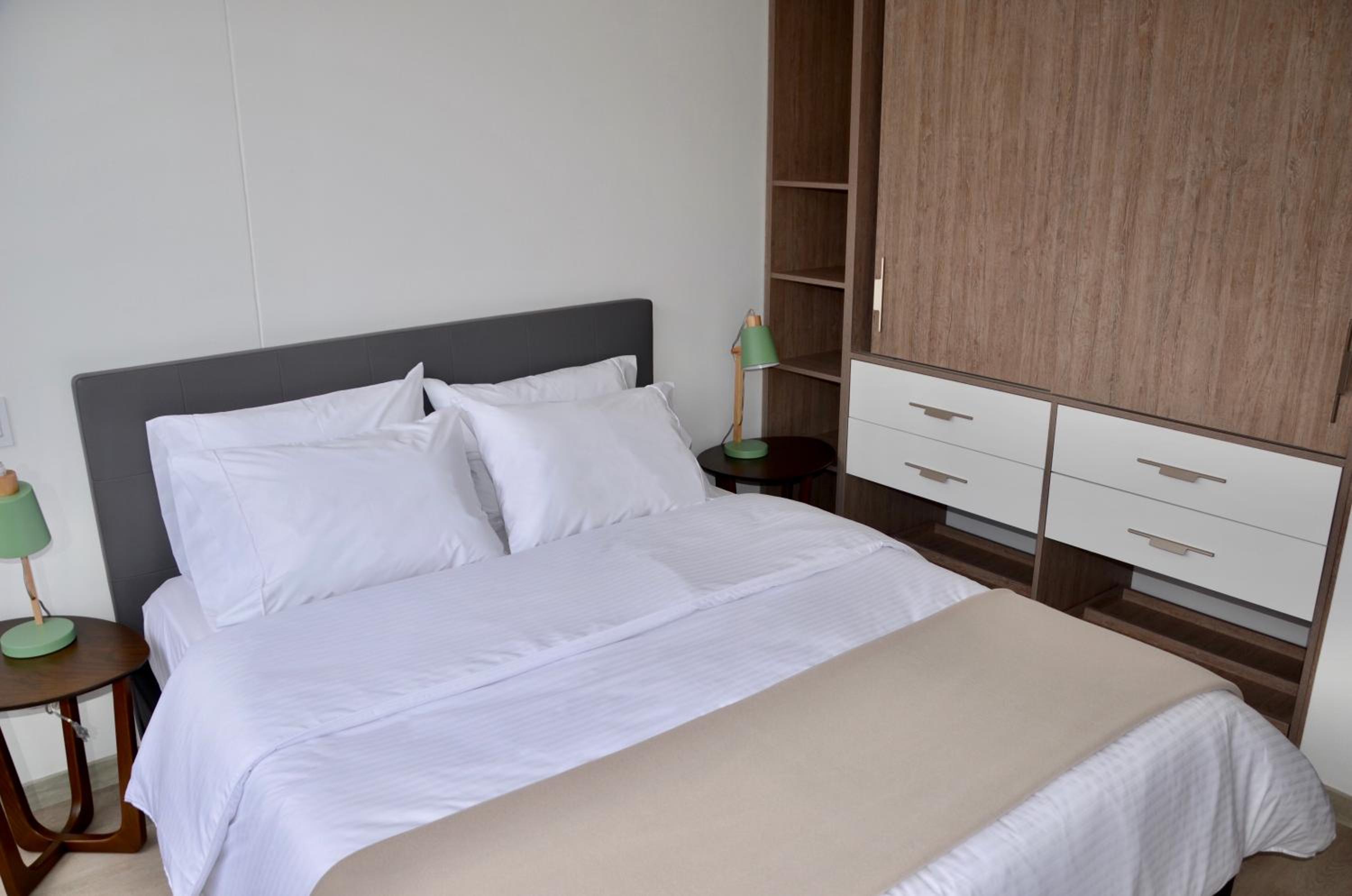 The apartments were well stocked (all basic kitchen and laundry appliances were available), and the beds were comfy. Wifi was also reliable, but only in your room. Be sure to bring laundry soap if you plan on using the washer, as this isn't supplied. We stayed here for two visits, and the second was a 2-bed apartment. Rooms were clean, with hot water.