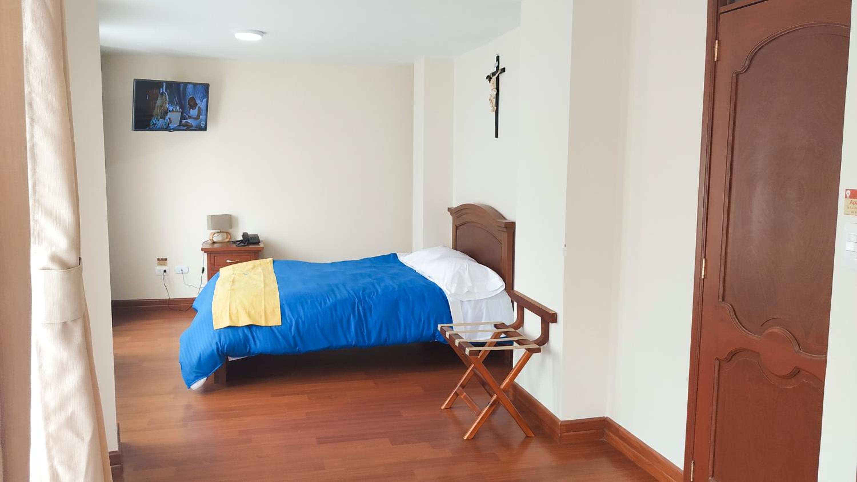 No staff present, no drinking water, sometimes no shower water, more than 20 m8nute wait for warm water to come to the shower, no chairs to sit on except for a few in reception, breakfast was good, cooked on the spot but the same every day. The hotel is spacious but the rooms with more than one bed leave room only to sit on the bed. It is rather secure, but four flights of stairs to the top floor, no lift of course. No hotel or hostall is closer to the sanctuary. It is not economical although it is very decent.the