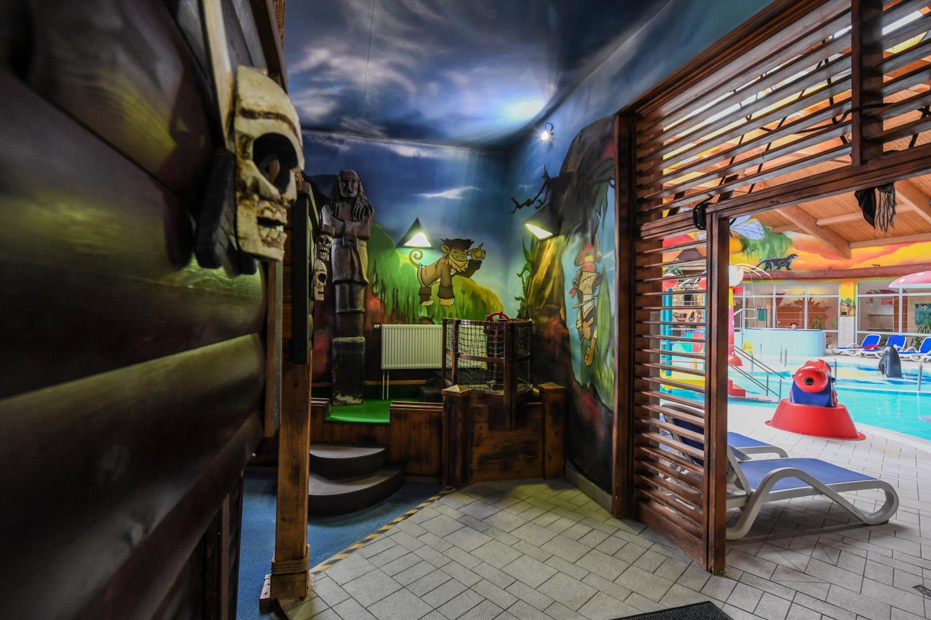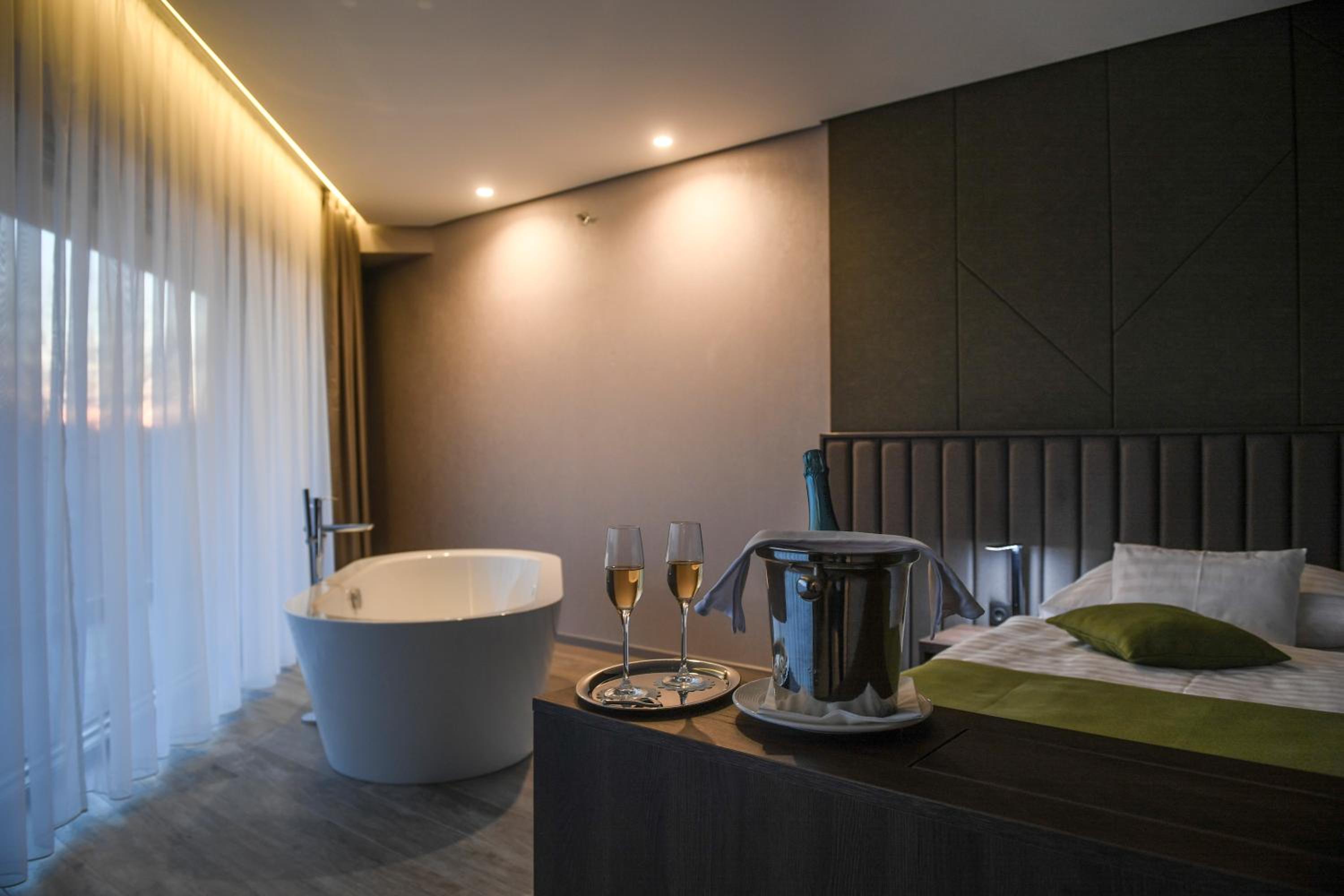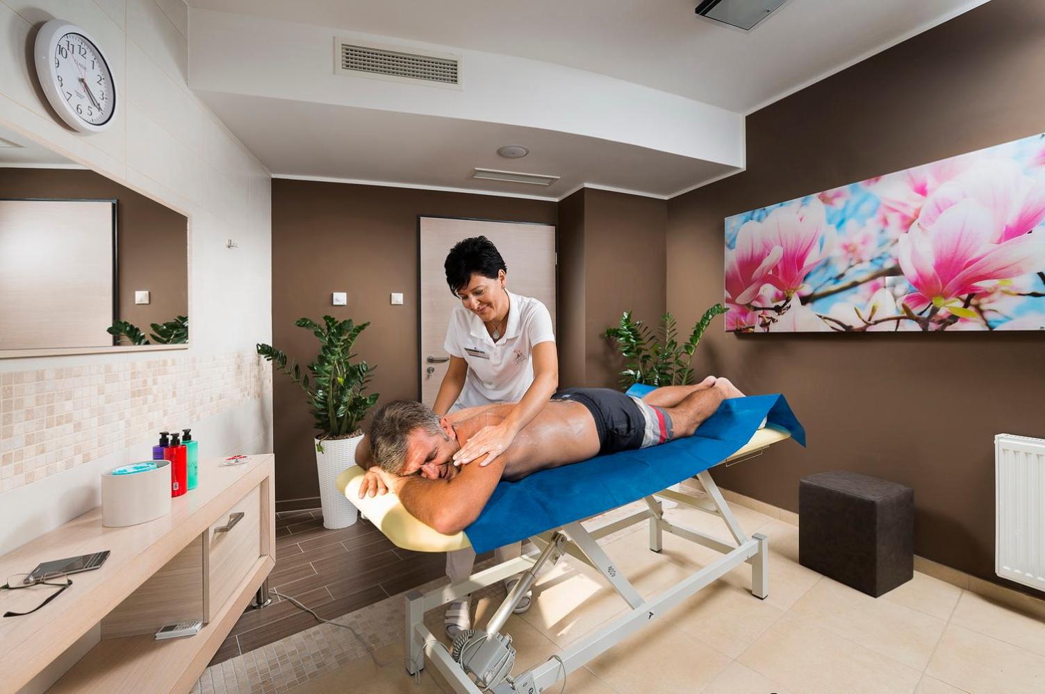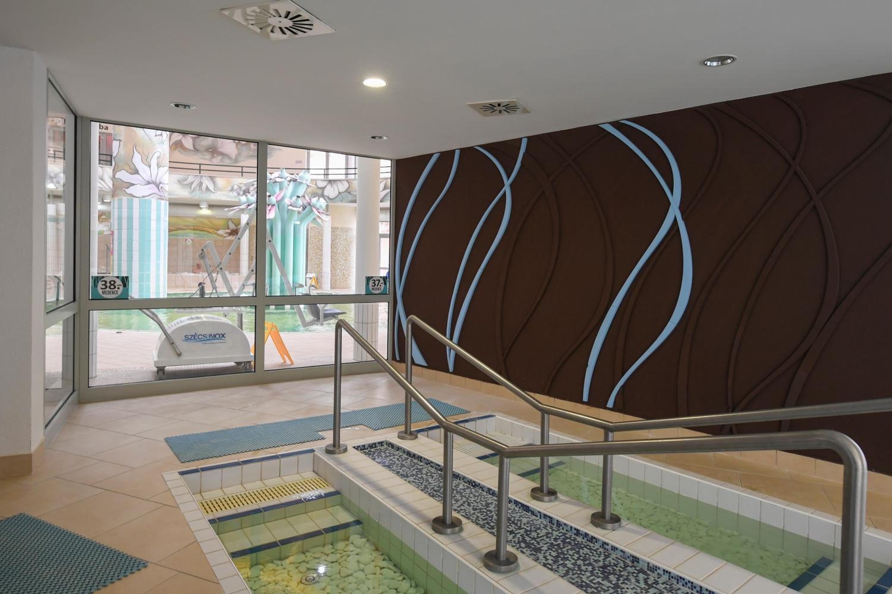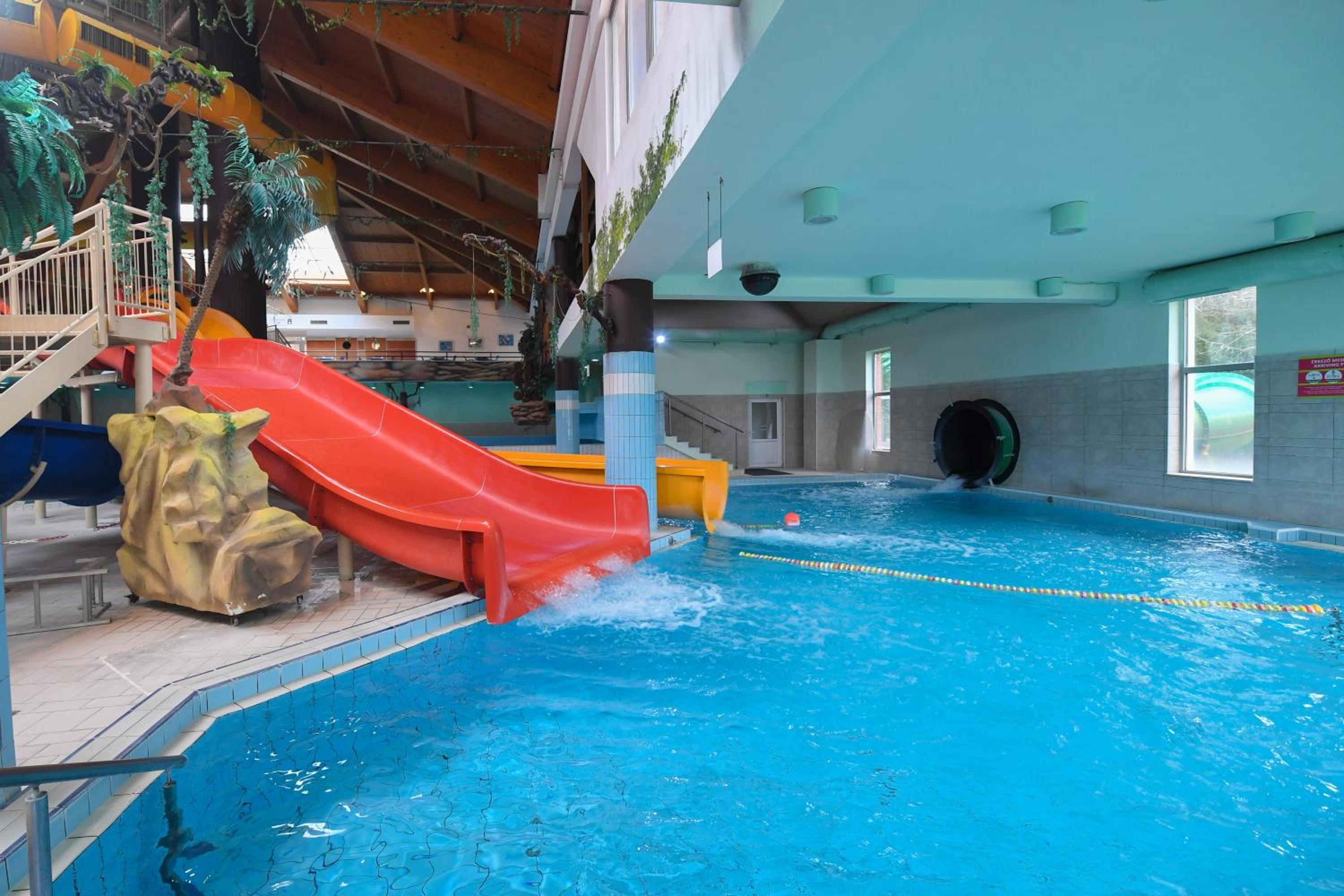 Indulge in the spa and wellness centre with indoor and outdoor pools, fitness centre, and terrace. Unwind in the hot spring bath after a day of activities like hiking and cycling in Nyíregyháza.