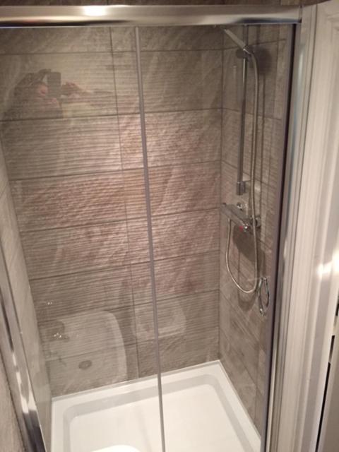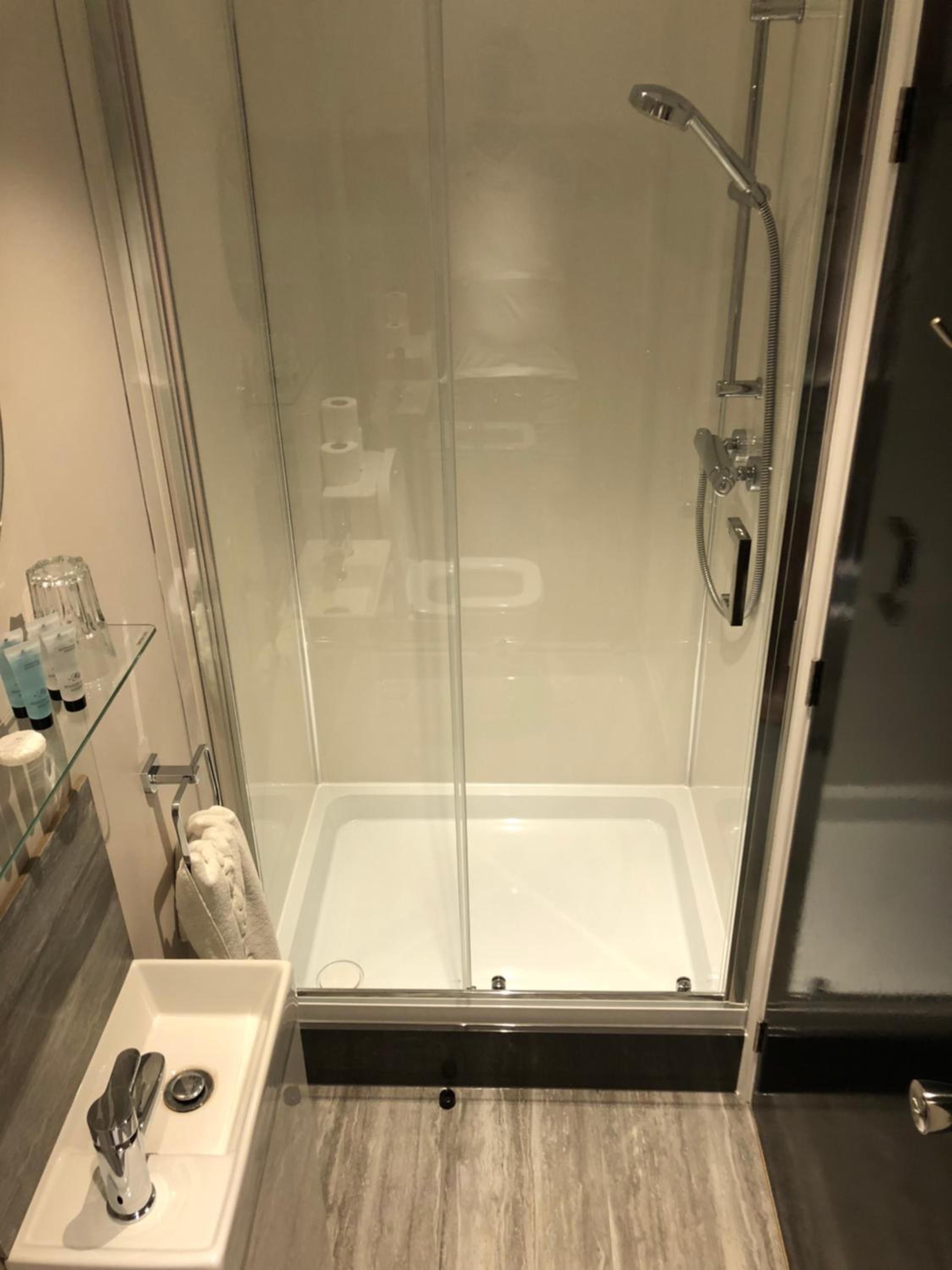 Tiny en suite, door too close to toilet, no extractor fan. No signal on TV.
