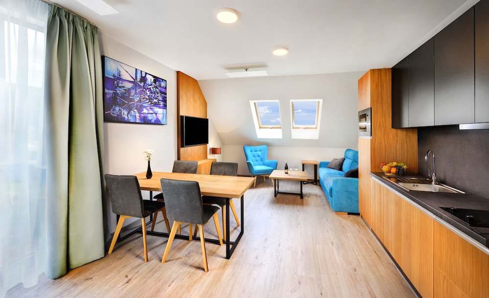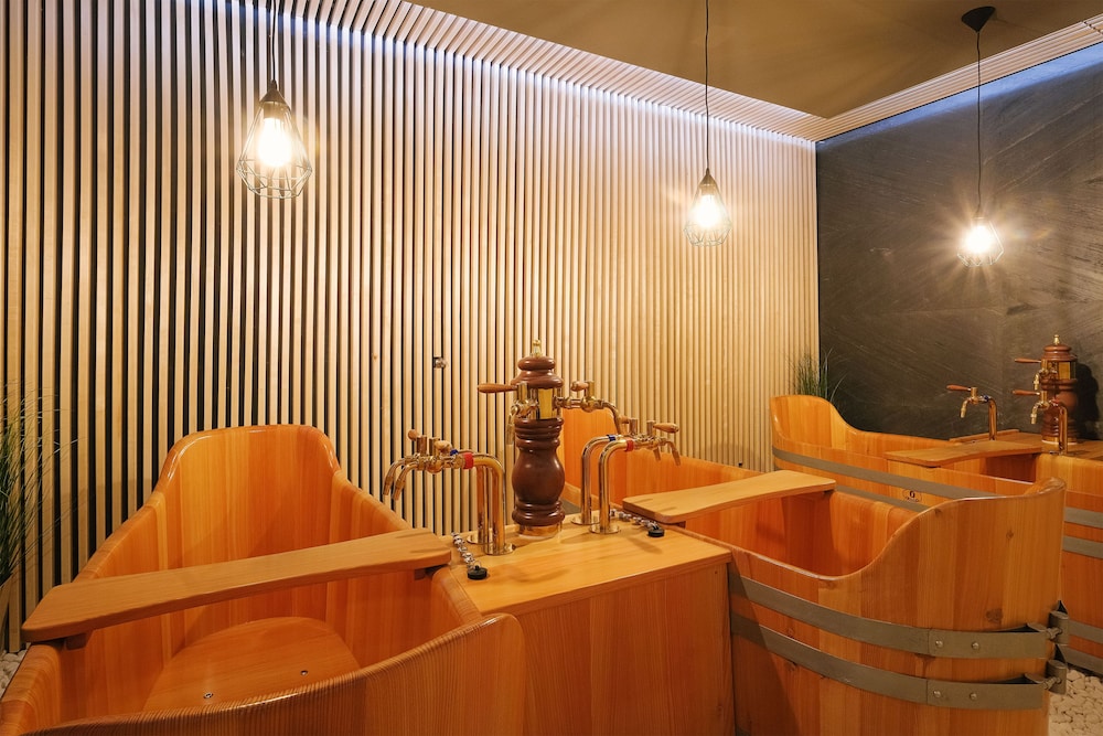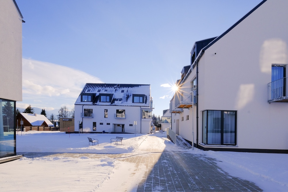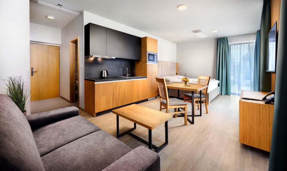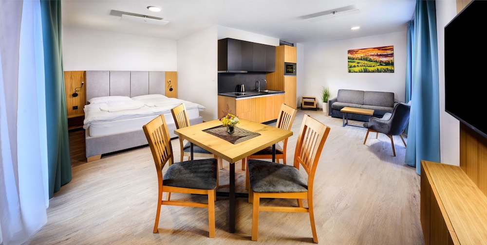 Amazing place! 10 out of 10 stars. We stayed in a two bedroom apartment with a sauna. I even added more nights and convinced my family to come stay. Foos at the restaurant was delicious. Everything is nice and clean. We even tried the beer spa, what an experience! The location is right accross from Tatralandia. We had two little kids with us. They have a playground outside and a kid's corner inside. We will definitely return. Please fix the driveway that leads to the hotel but everything else is perfect.