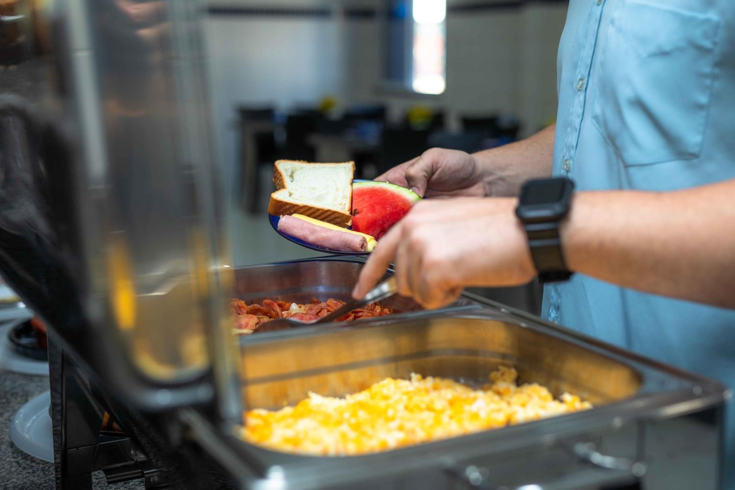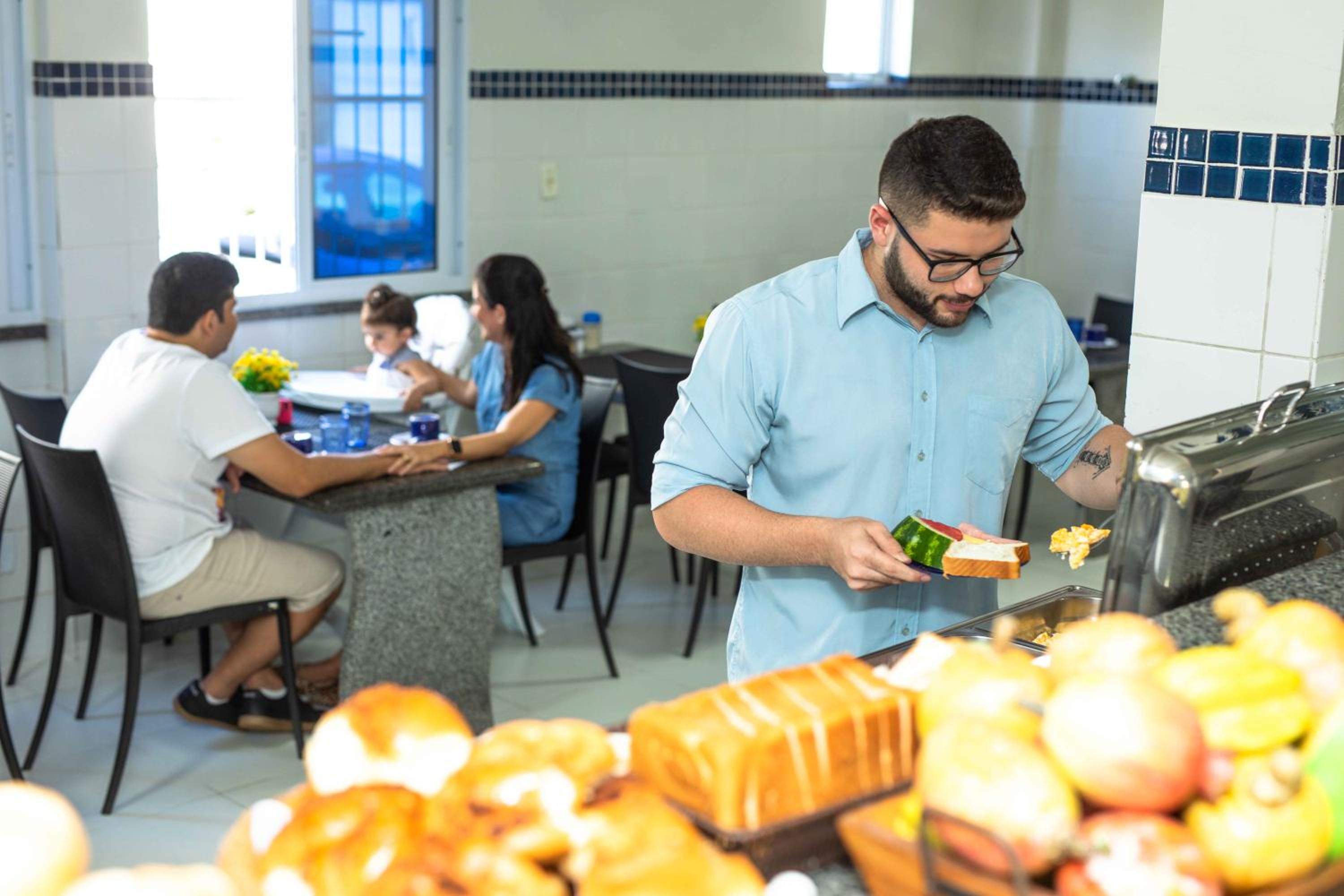 O café da manhã é bom, com variedades.