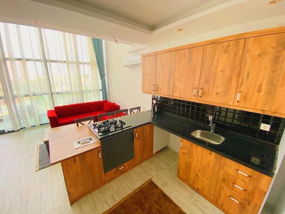 Ich habe ein Zimmer mit Kochnische gebucht. Als wir ankamen, stellte sich heraus, dass in der Küche nicht einmal Gläser vorhanden waren, obwohl es einen Wasserkocher gab. Als ich fragte, warum die Küche leer sei, sagte man mir an der Rezeption, dass die Küche im Zimmer nur zur Dekoration diene. Ich konnte mir Becher zum Trinken besorgen, aber natürlich war es nicht möglich zu kochen, obwohl ich dieses Hotel nur wegen der Küche gewählt hatte, da ich mit einem kleinen Kind reiste. Ich musste dann in allen Supermärkten nach Gläsern mit Babynahrung suchen, was in der Türkei ein kleines Problem ist.