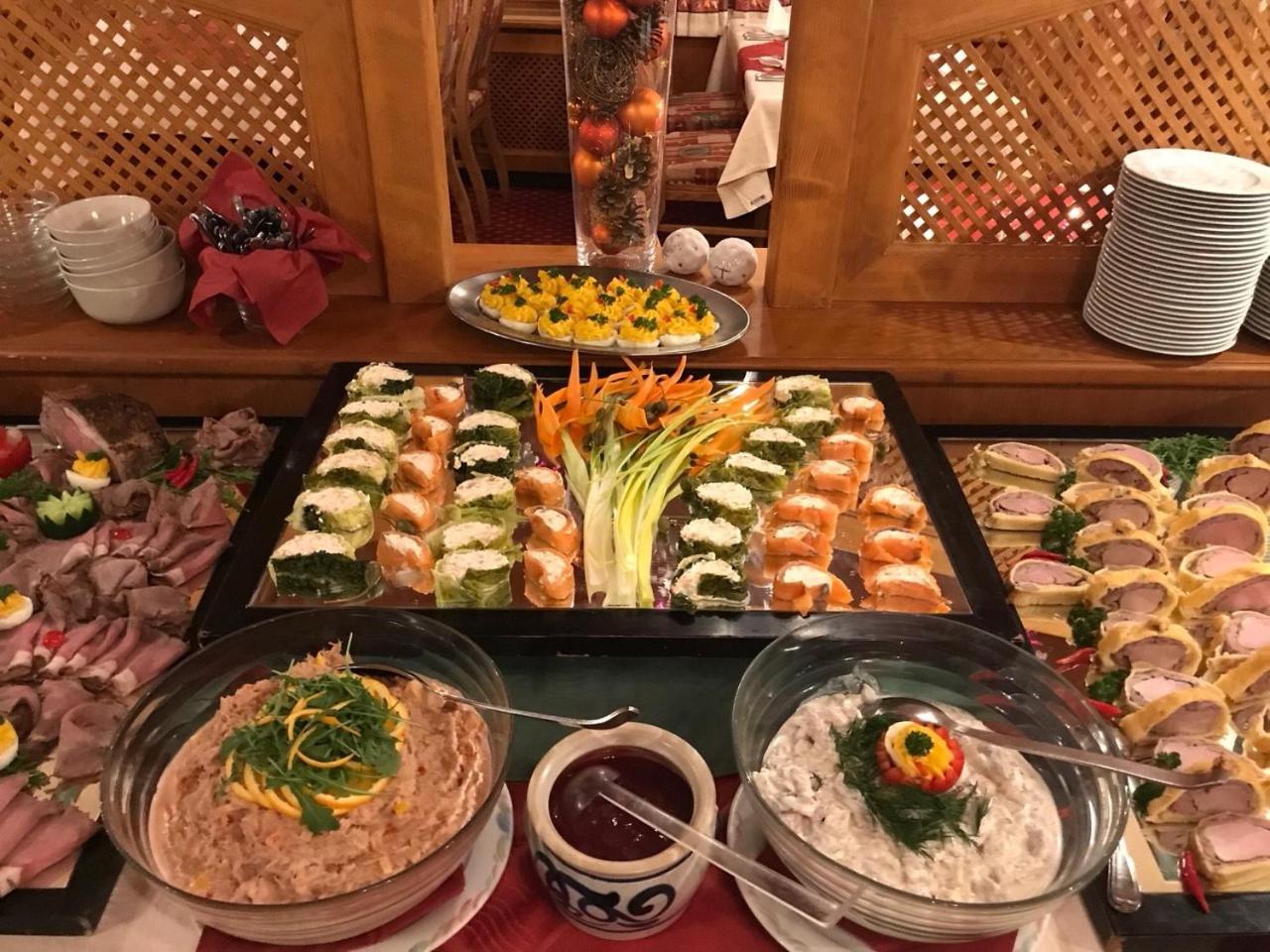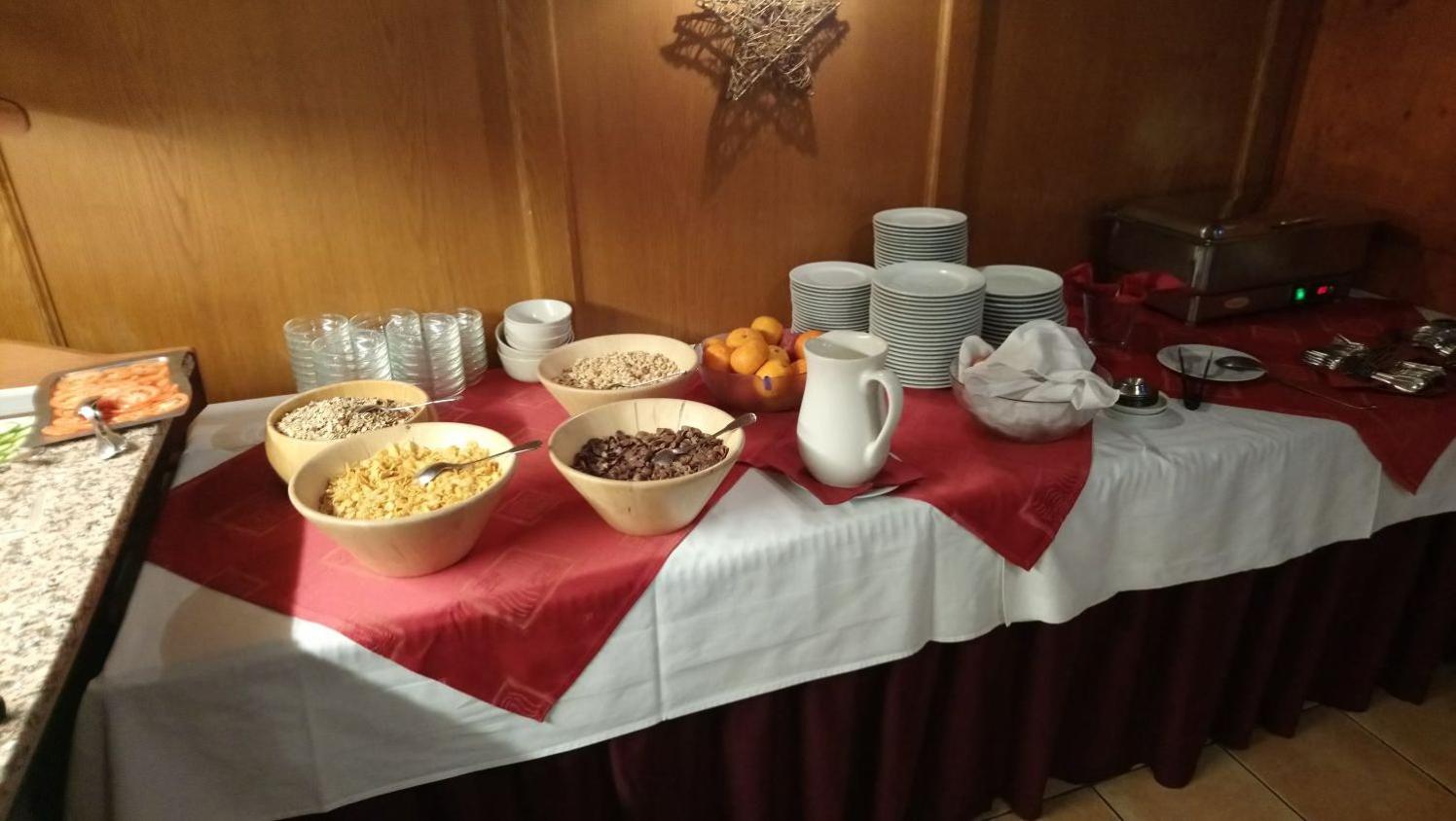Gutes Frühstücksbuffet mit leckerem Rührei. Lunch 3 Gänge mit Menüauswahl, auch für Vegetarier. Salat-Buffet.