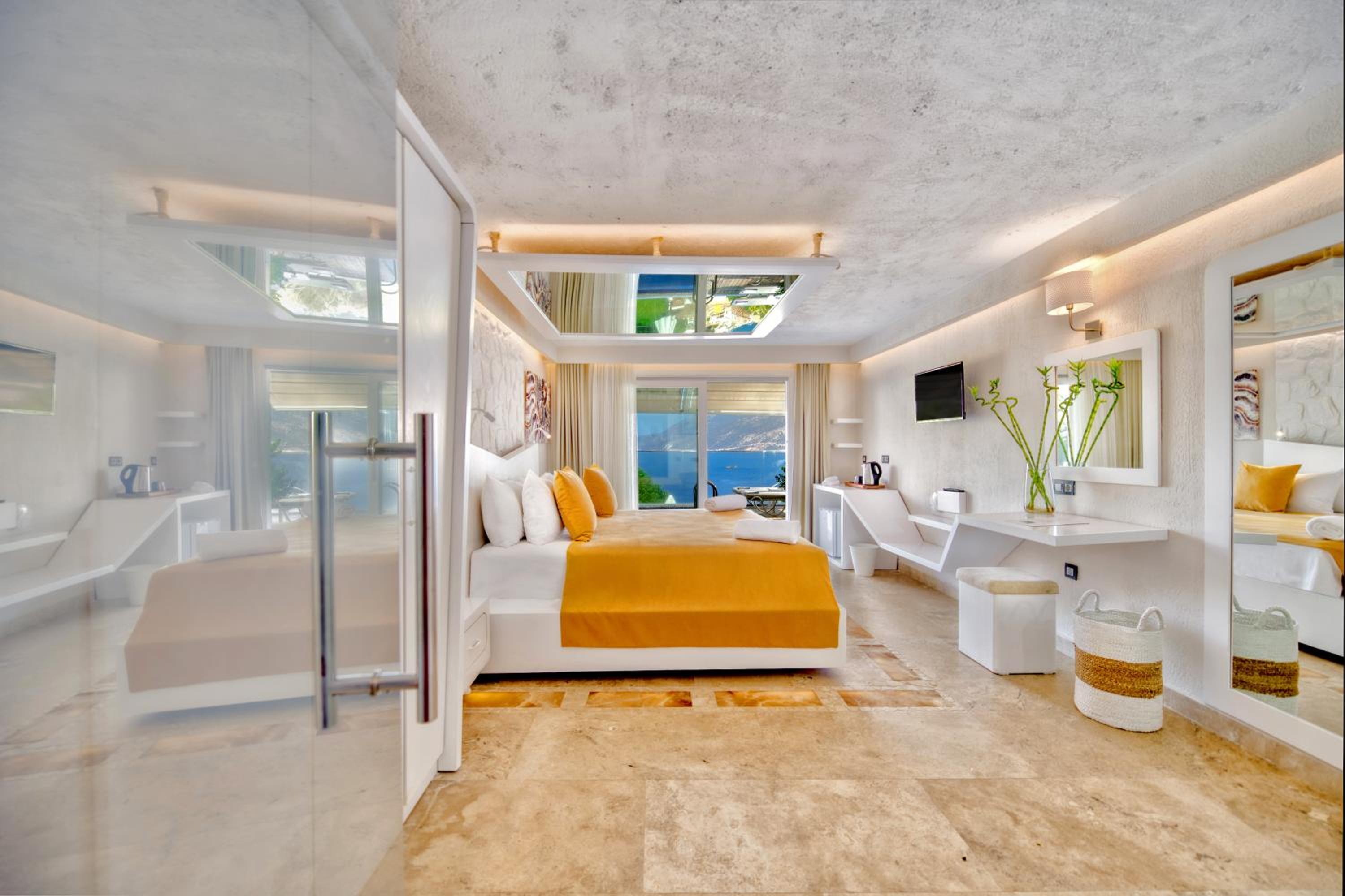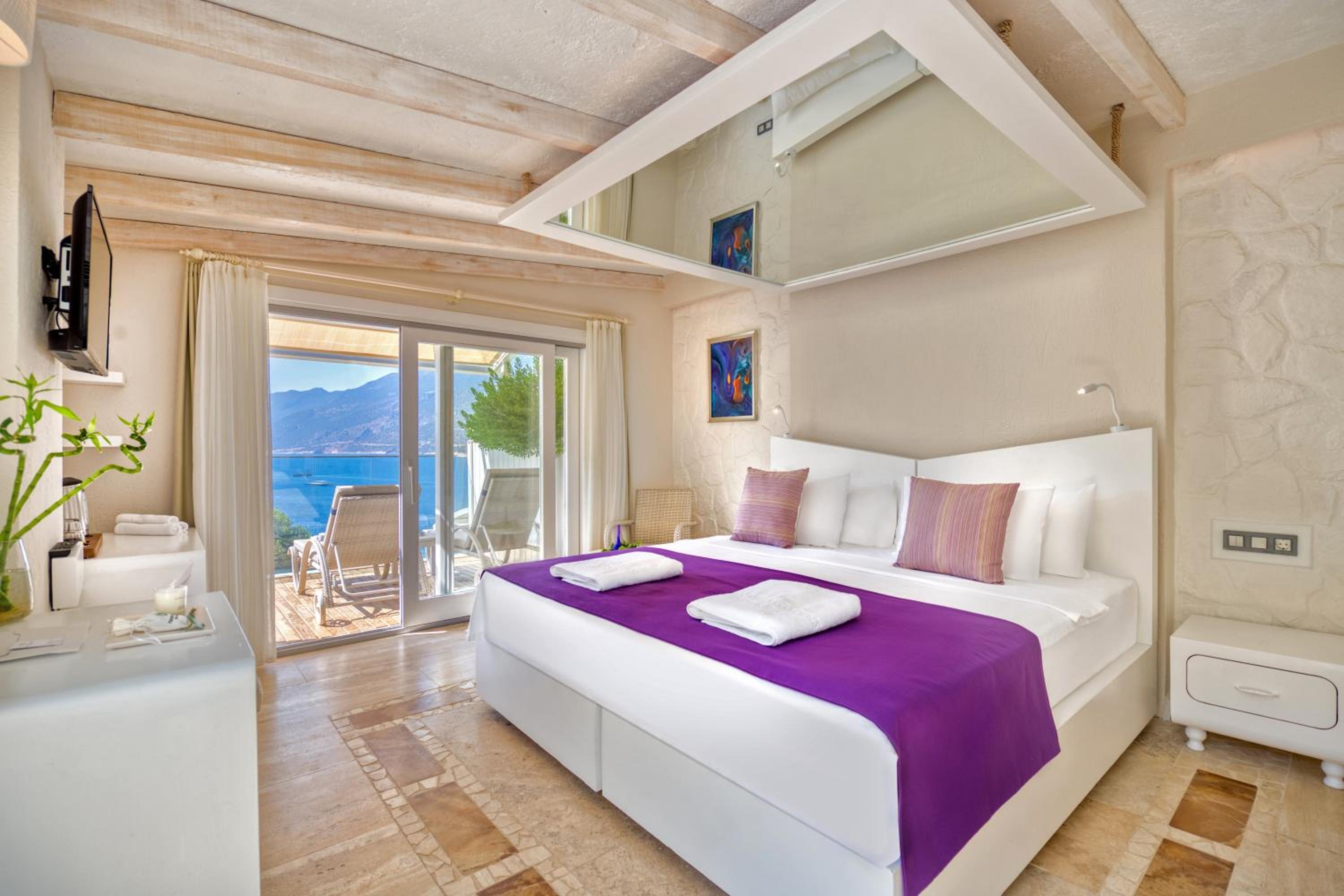 amazing design of hotel, beautiful views, access to the sea, regular dolmus to kas, quiet. interior decor subjective.ie bed looked fantastic very large mattress on a massive wooden platform ( unfortunately sqeeeked if you rolled over and banged your legs as you got out.) double bed sized mirror hanging from the ceiling gave you the impression of a raised room height and accentuated the fabulous view down the peninsular. Special mention to the cleaners who were fantastic room spotless