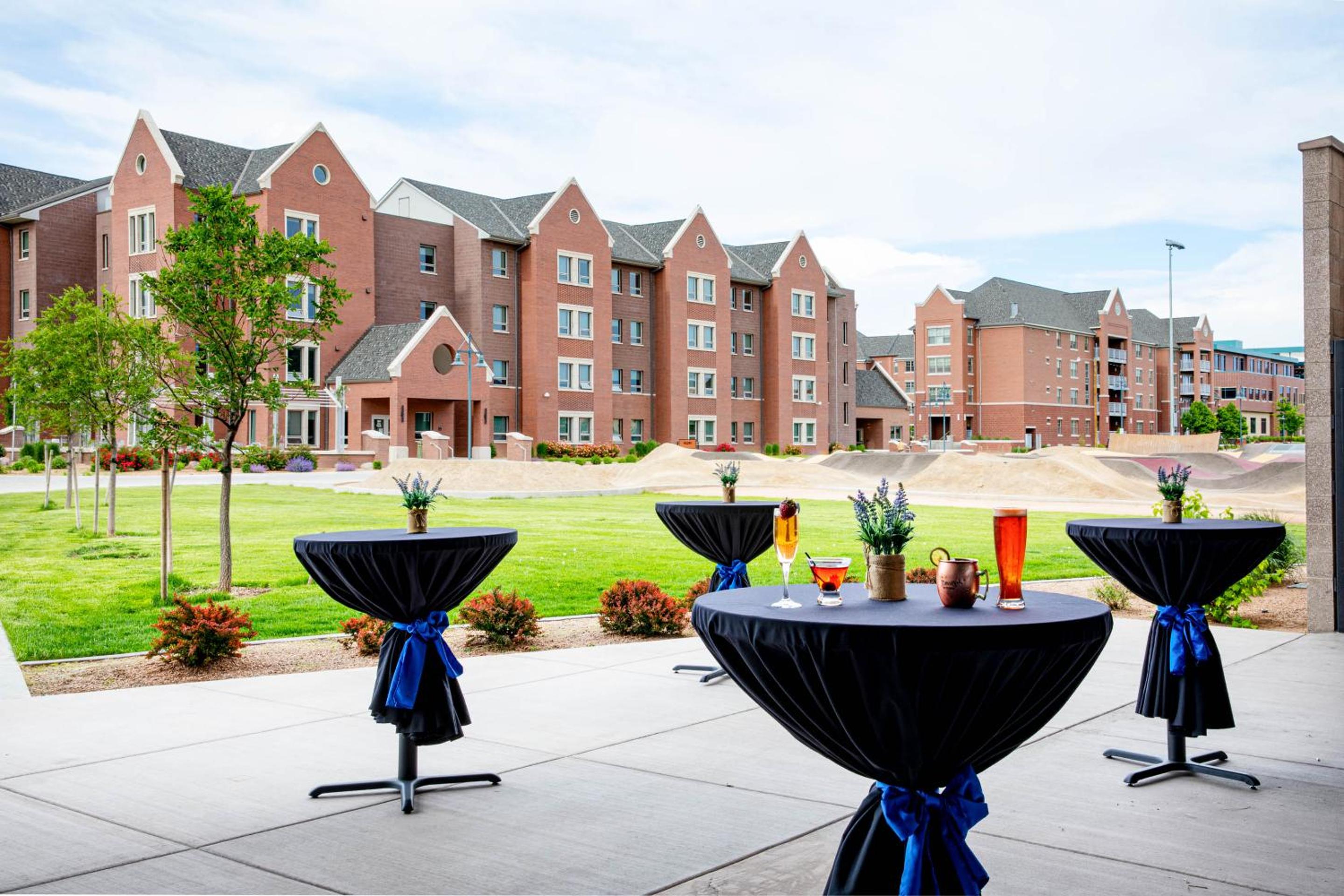 Located on campus, lots of grass on all sides, excellent dedicated parking, multiple access points, coffee shop and great dining in the glass walled restaurant