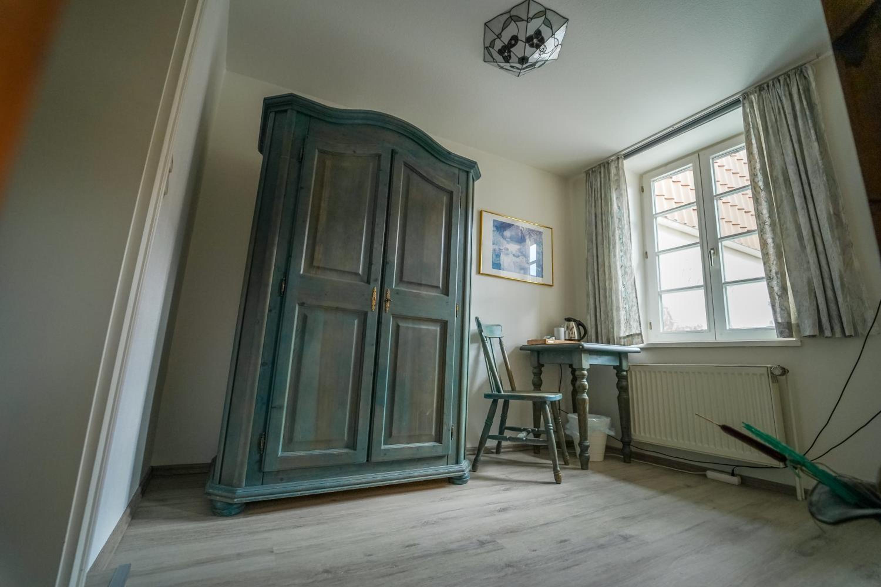 Nichts im Zimmer. Bett , alter Schrank, alter Nachtisch und Alte Möbel überhaupt.