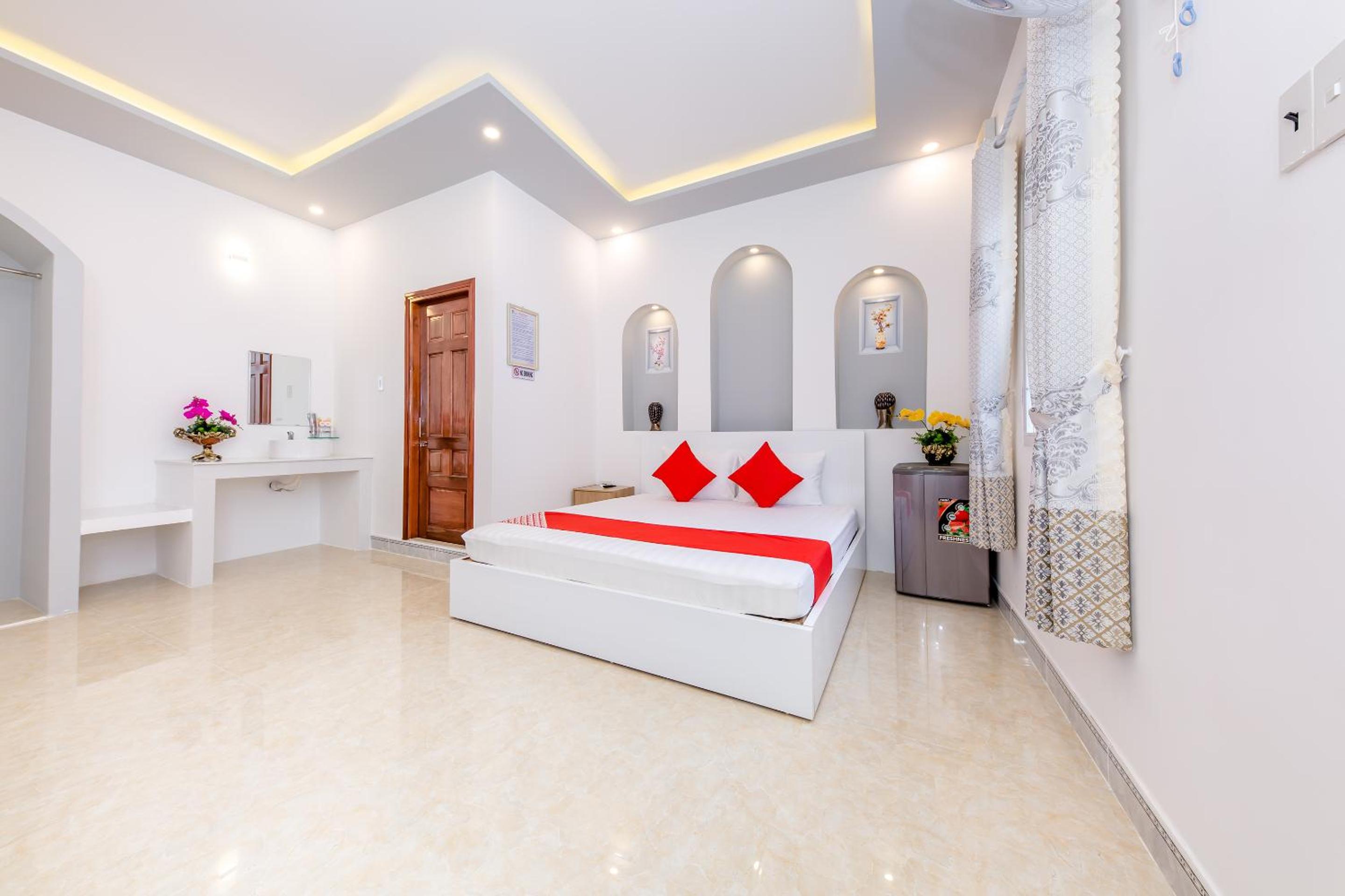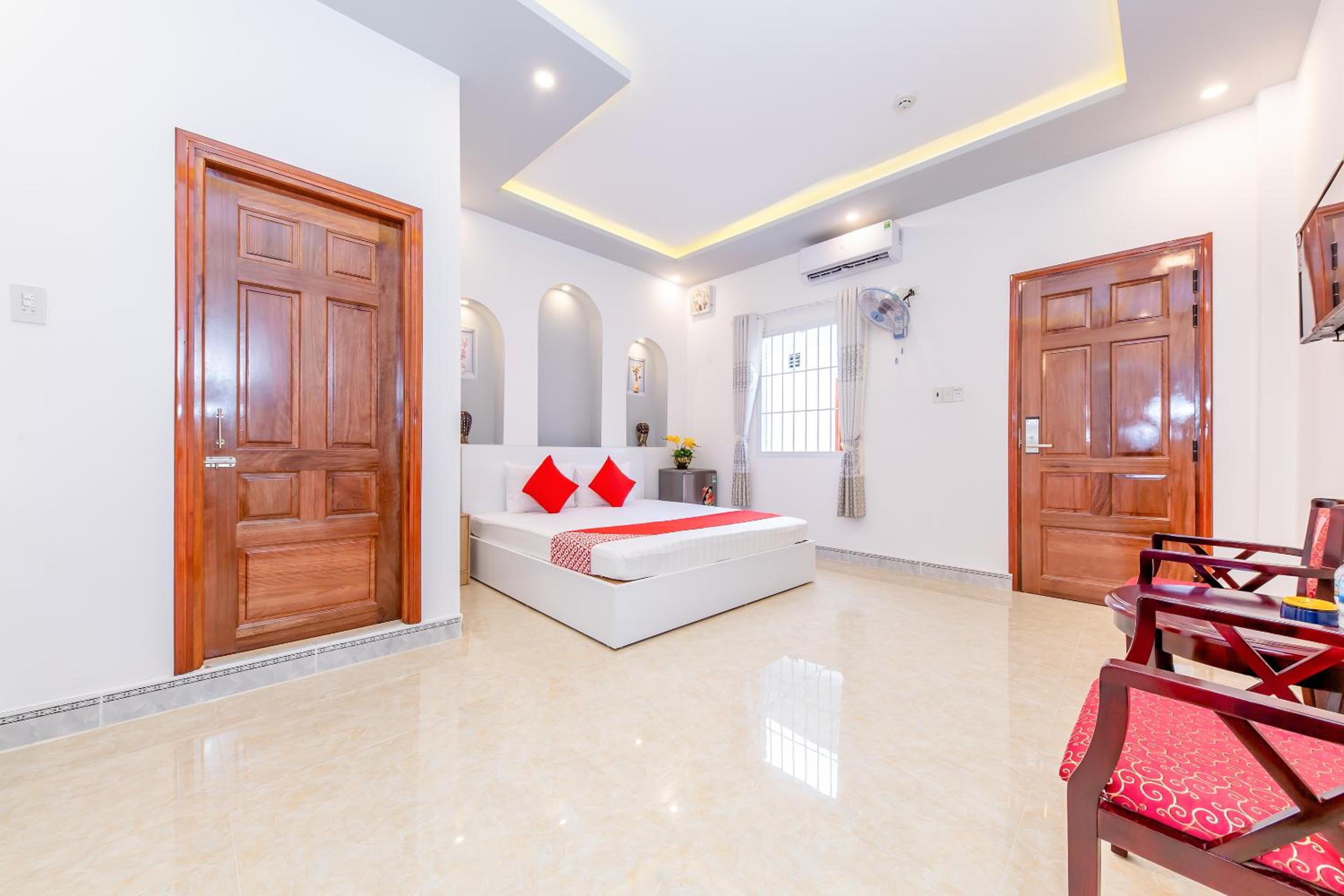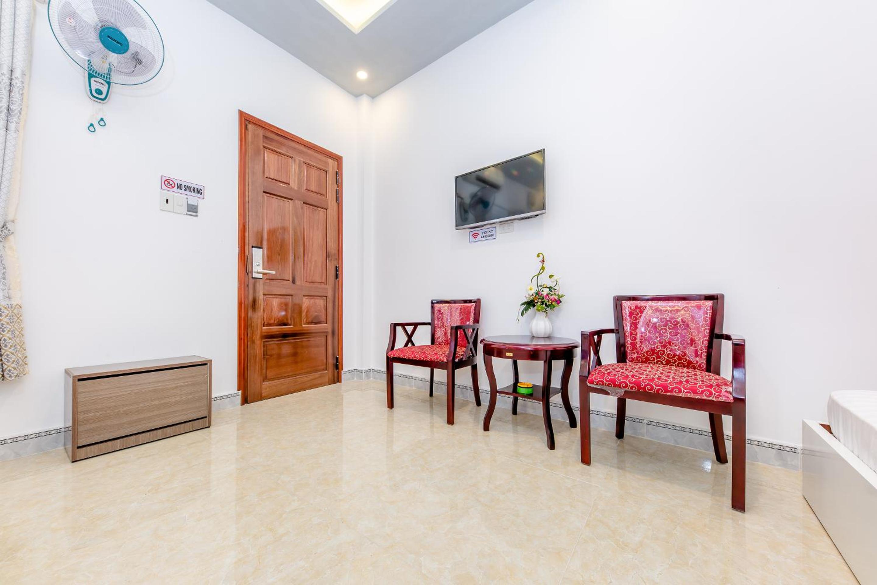 За свои деньги это просто шикарное место! Большой и симпатичный номер с окном (что большая редкость для Вьетнама за такую сумму), в котором есть всё для удобства: большая кровать с удобным матрасом, кондиционер, вентилятор, телевизор, холодильник. Есть стол и два кресла, вешалка для одежды, туалетные принадлежности. Розетки у кровати с обеих сторон. Отель находится на спокойной улице, здесь тихо. Рядом много мест, где можно поесть и выпить кофе. На территории отеля есть парковка.