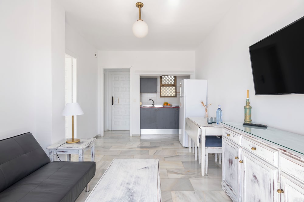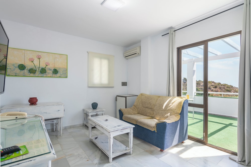 We didn't expect much for the price and were pleased with the size of room and ammenities. Nice little kitchen. Toilet and shower ok. Good air conditioning but not in bedroom. We brought a fan with us. Convenient for beach and taxis available to Nerja for less than 10 euros. However, we had no fresh towels all week. No clothes horse to dry clothes. Pool is grotty with clumps of hair from drain. Bar below is awful for evening meals. Parking is difficult too. We did enjoy our stay. Just accept basic conditions.