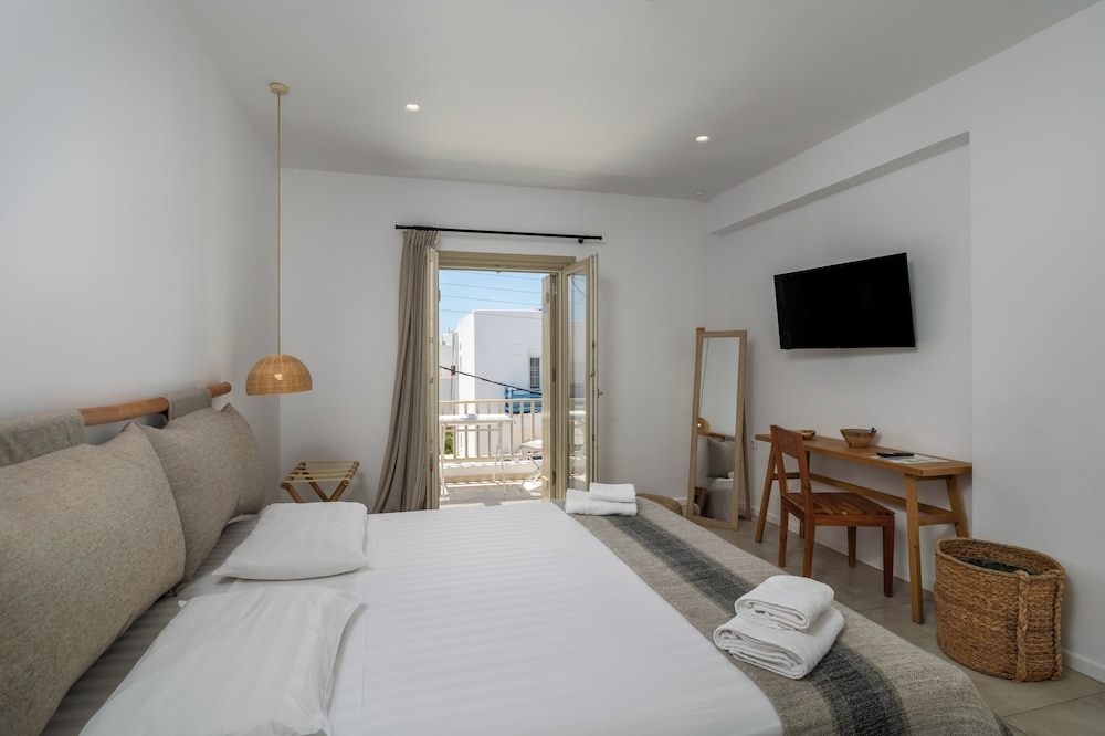 I stayed at this location with my two teenage kids. Very clean and friendly, helpful staff. The location is great. Just off the main strip with plenty of parking if you're renting a car. There are also several car/ATV rental spots within a block. It's a small, cute town so getting around is very easy. Would definitely recommend renting a car to see as much of the island as you can. There are several amazing beaches that are a quick 20 minute drive away. It's also walkable to the port if you're arriving by ferry, which we did. Be nice to all of the sweet cats that roam the town!