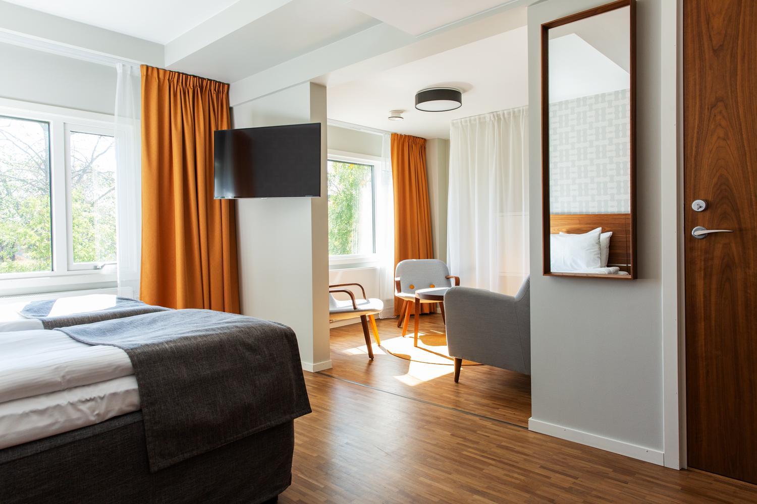 Rummet var lagom stort. Rent och fräscht, med liten sjöglimt. Tyst och stilla. Fina omgivningar. Otroligt god middag och en frukostbuffé med allt man kan tänkas vilja ha. Fylldes på hela tiden. Trevligt bemötande av alla vi träffade. Bokade in oss i badhuset, det var rymligt och fräscht. Stor bassäng att simma i två bubbelpooler och bastu. Fanns även ett gym. Då vi var där hade vi hela badhuset för oss själva