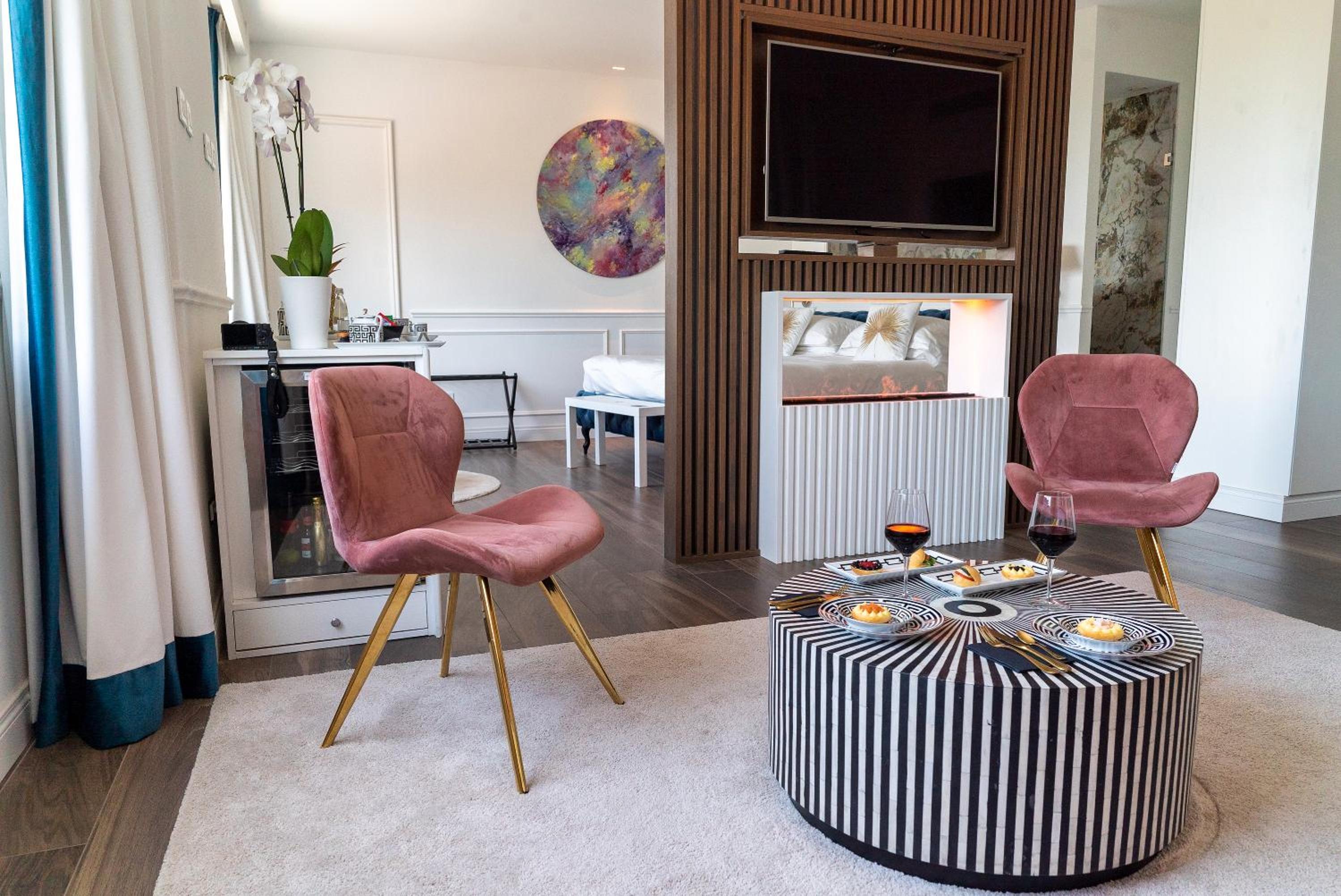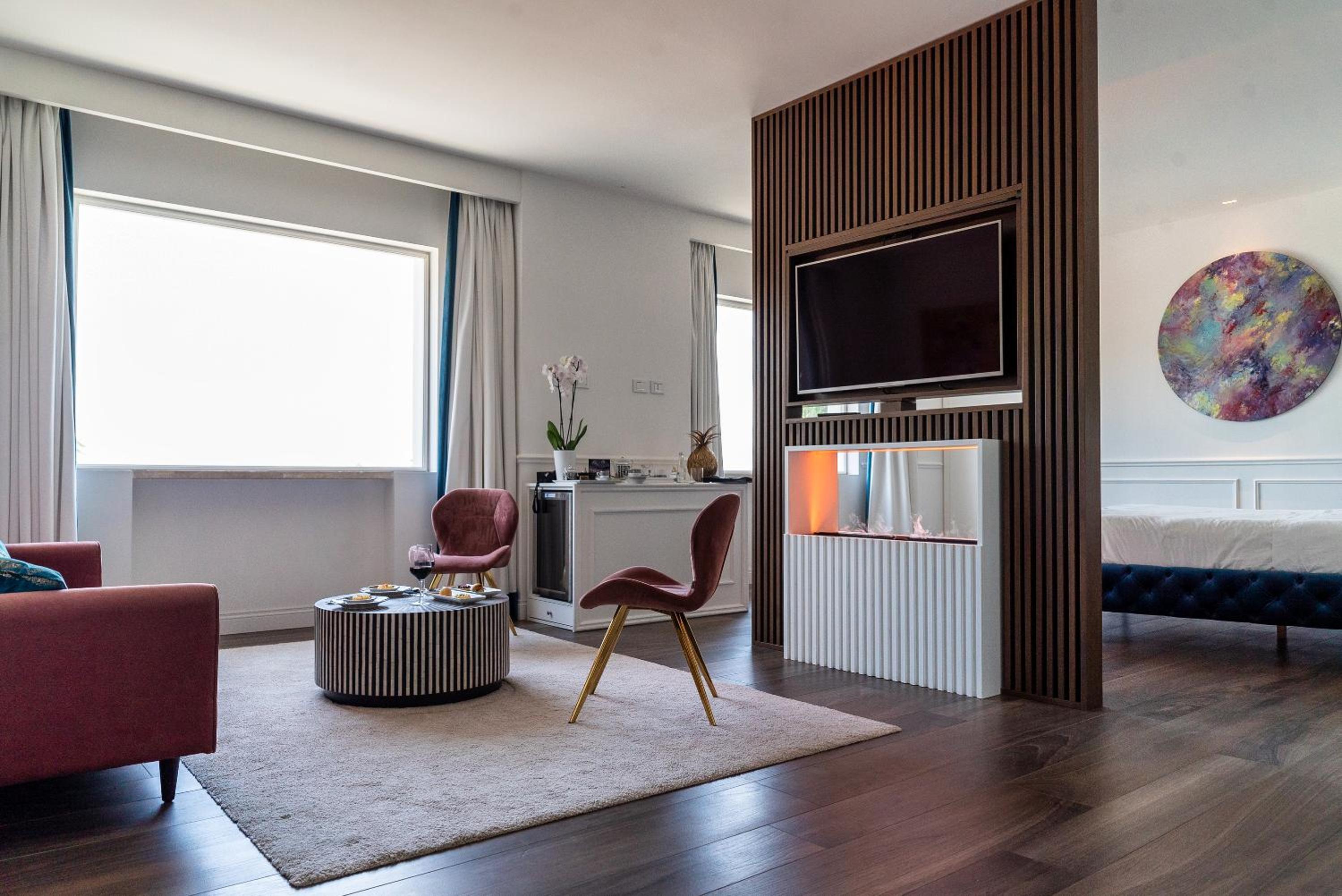 Breathtaking Views and Comfort: Enjoy city views from your own private balcony in every room, complete with modern amenities like a flat-screen TV and a spacious wardrobe.