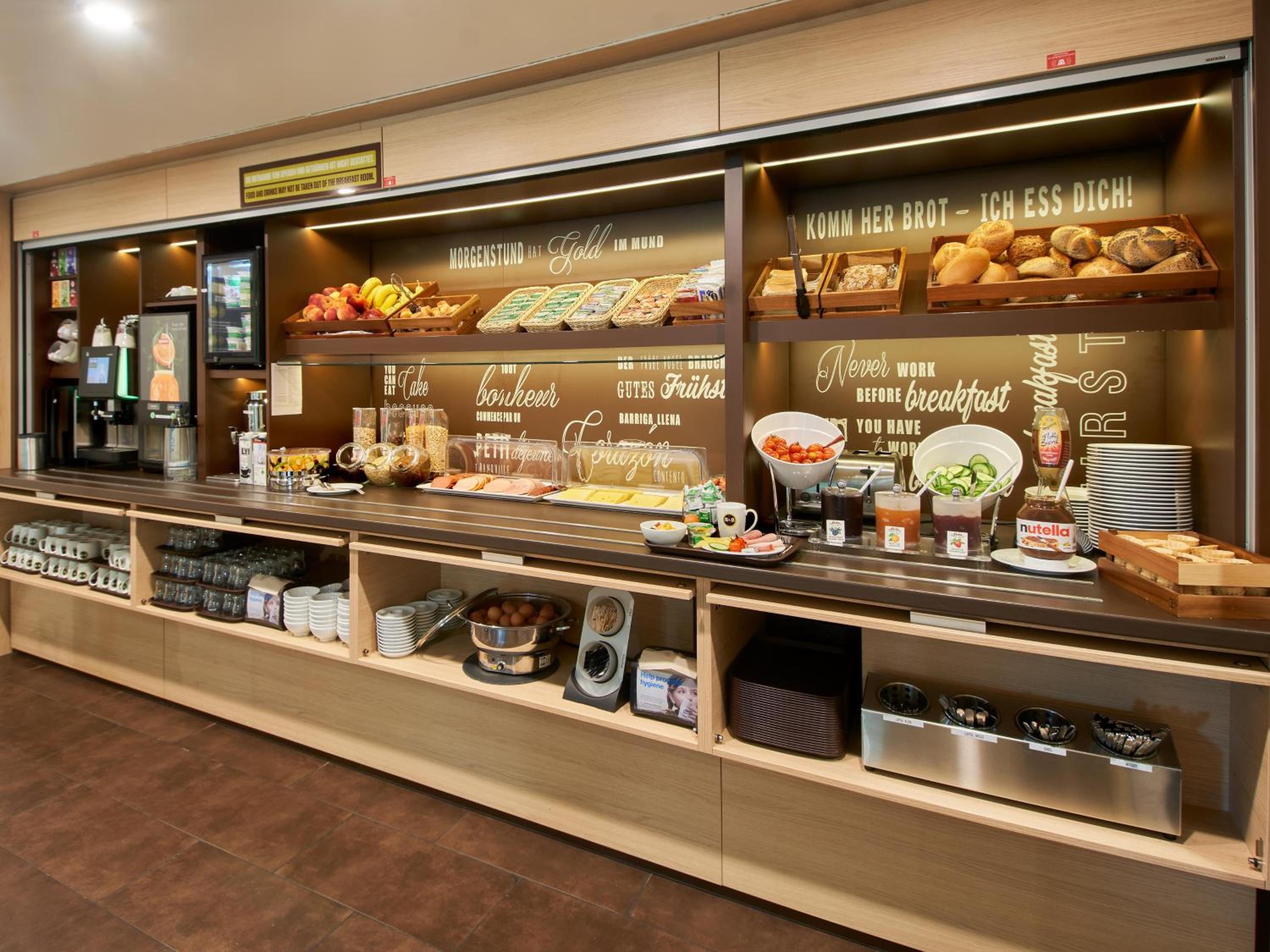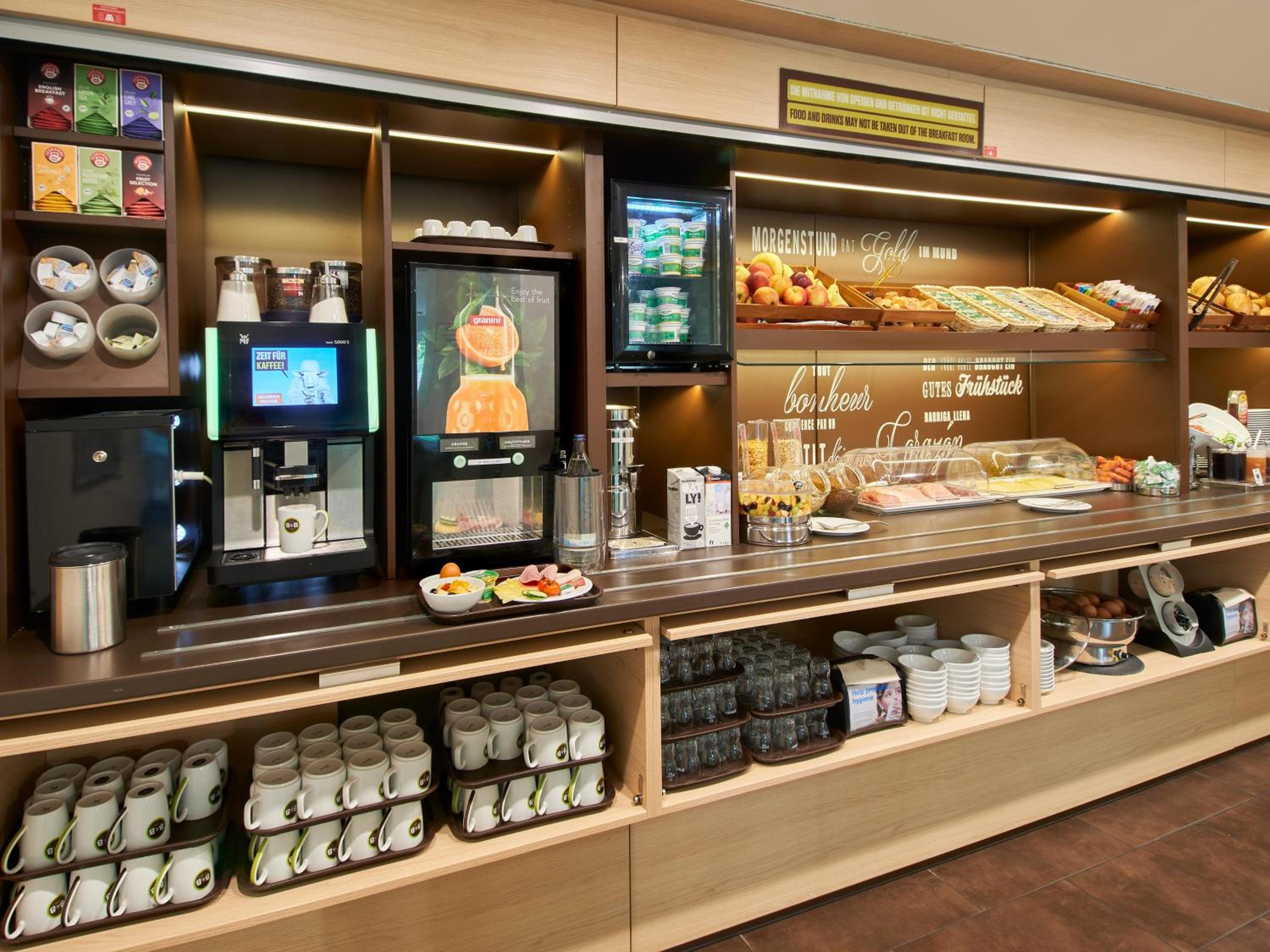 Indulge in a varied breakfast buffet at B&B Darmstadt to kickstart your day. For quick bites and beverages, head to the lobby where a snacks and drinks machine awaits you.