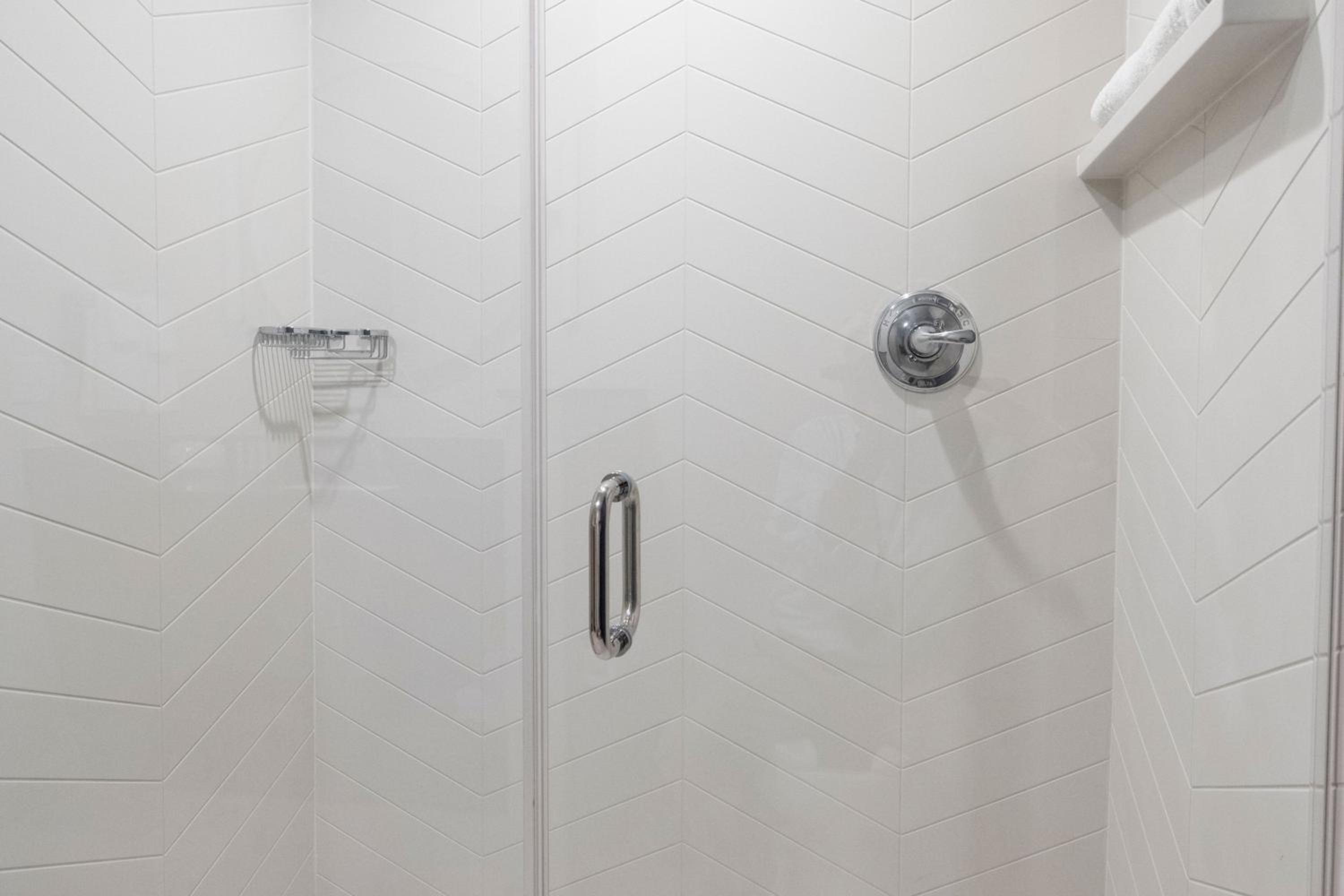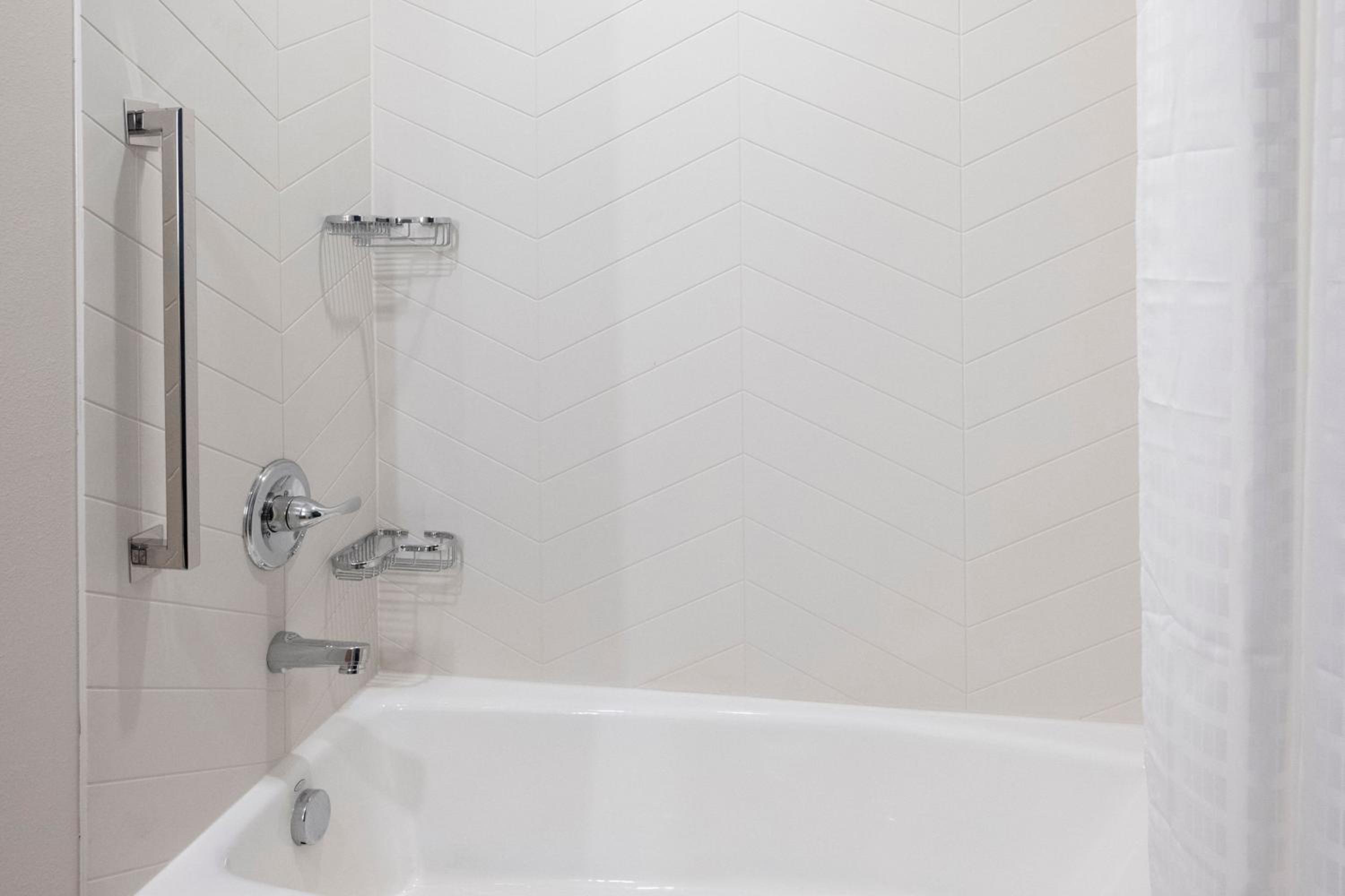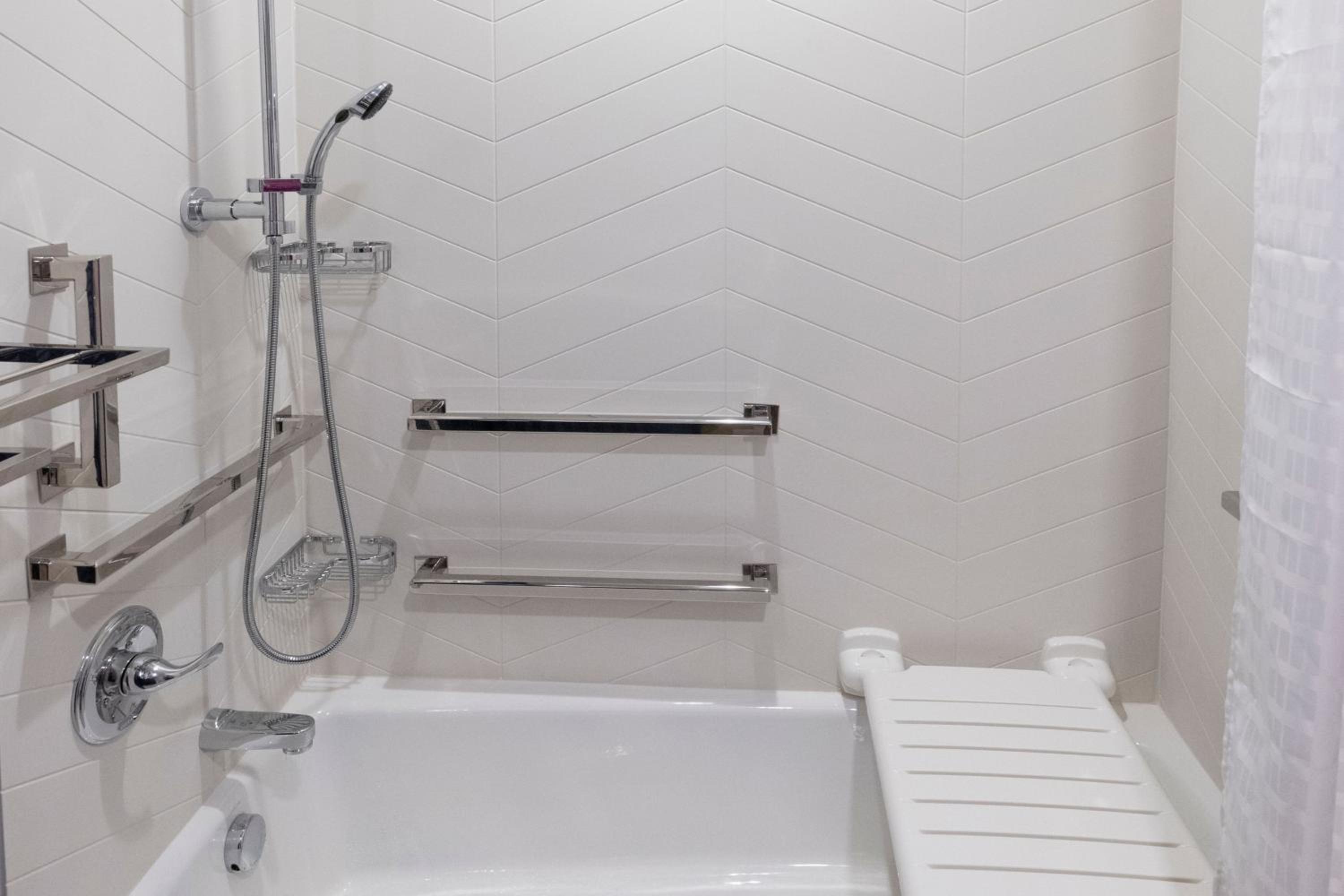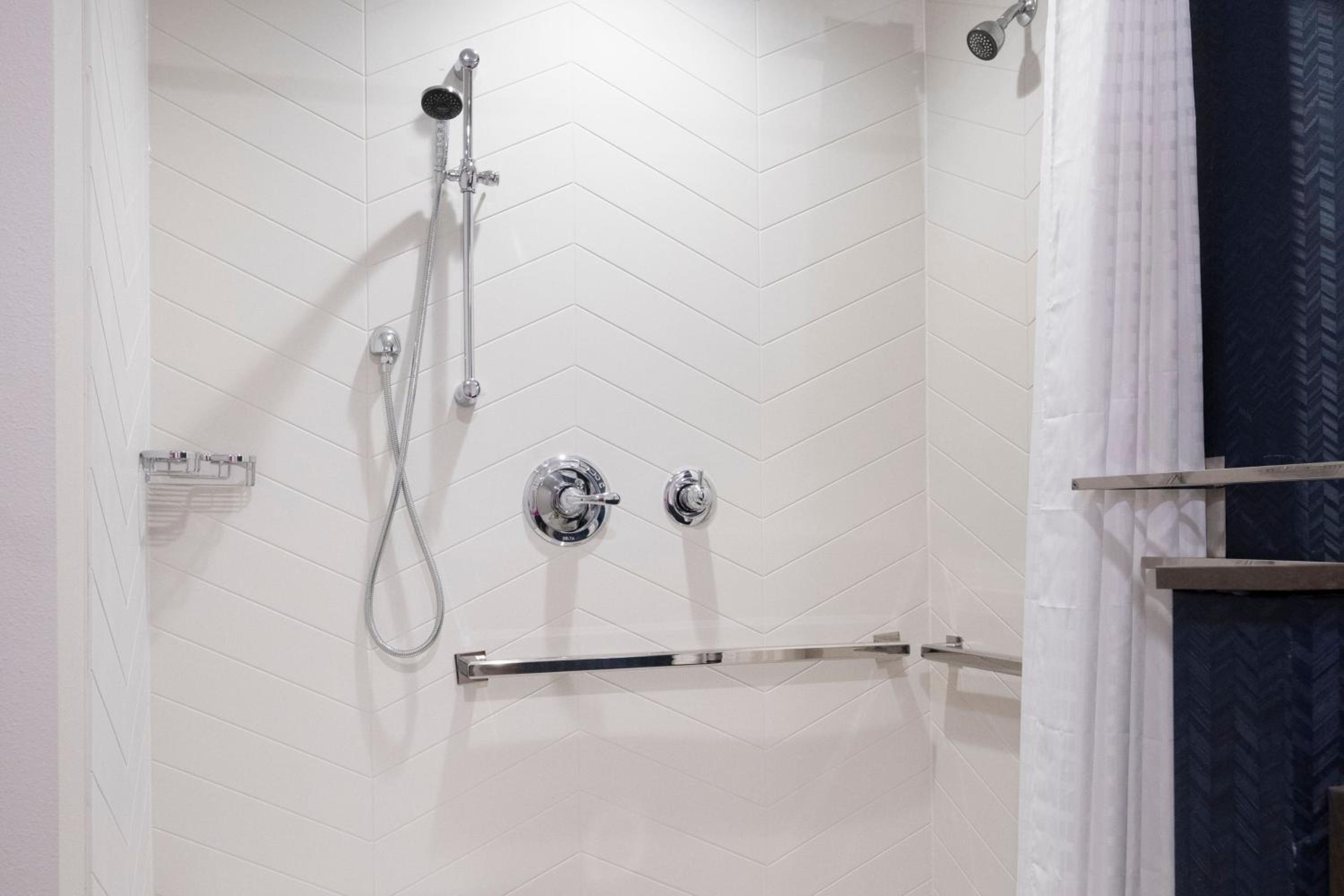The shower curtain in the handicapped roll in shower needs to be longer. Water goes everywhere.