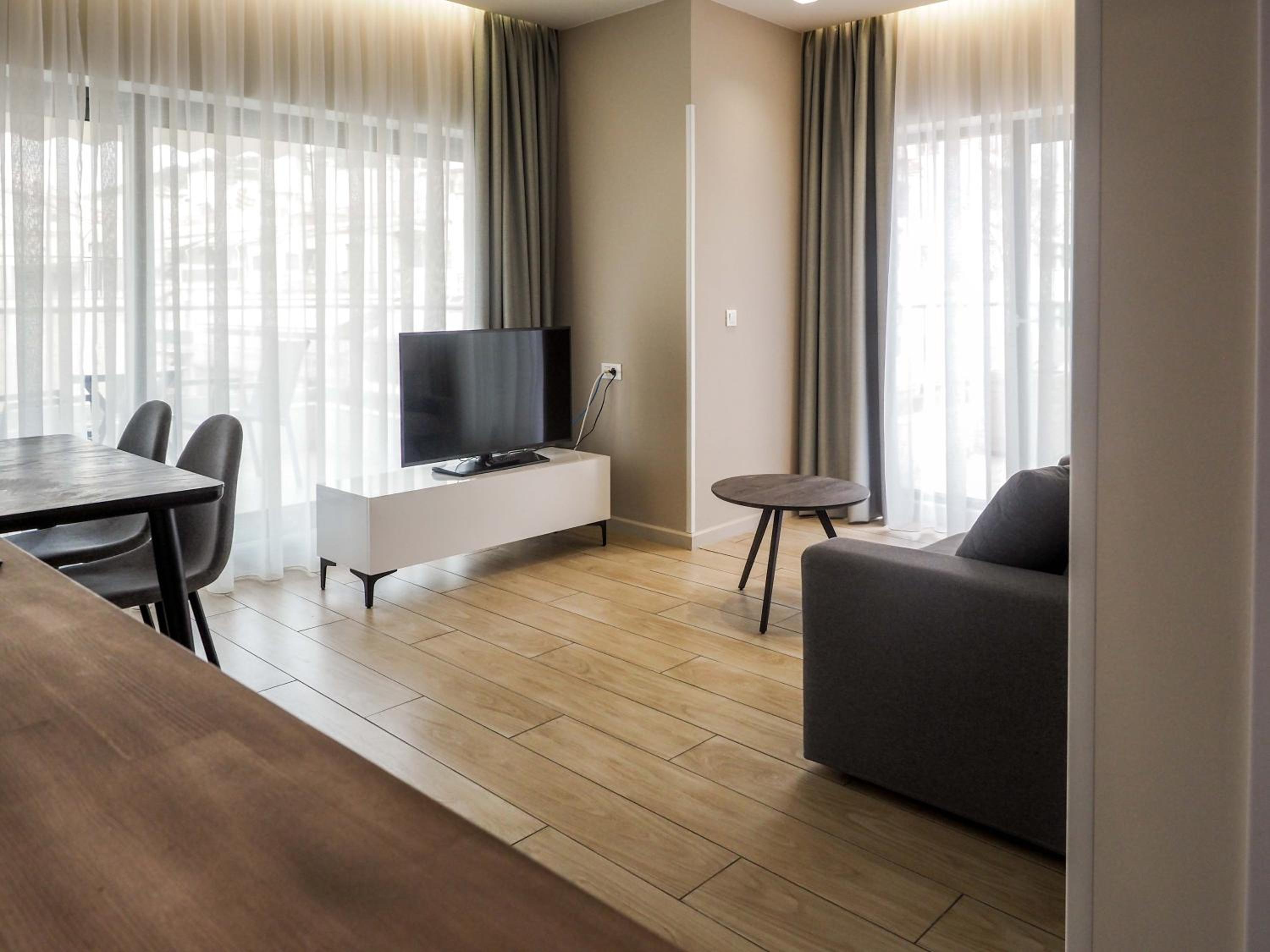 The apartment itself was very comfortable, clean, and well equipped. Towels were replaced every two days and the apartment was even cleaned during our stay, which was a wonderful surprise. Everything we needed was provided – soaps, a dishwasher, a dryer, and a fully equipped kitchen with plenty of dishes and utensils to prepare meals.