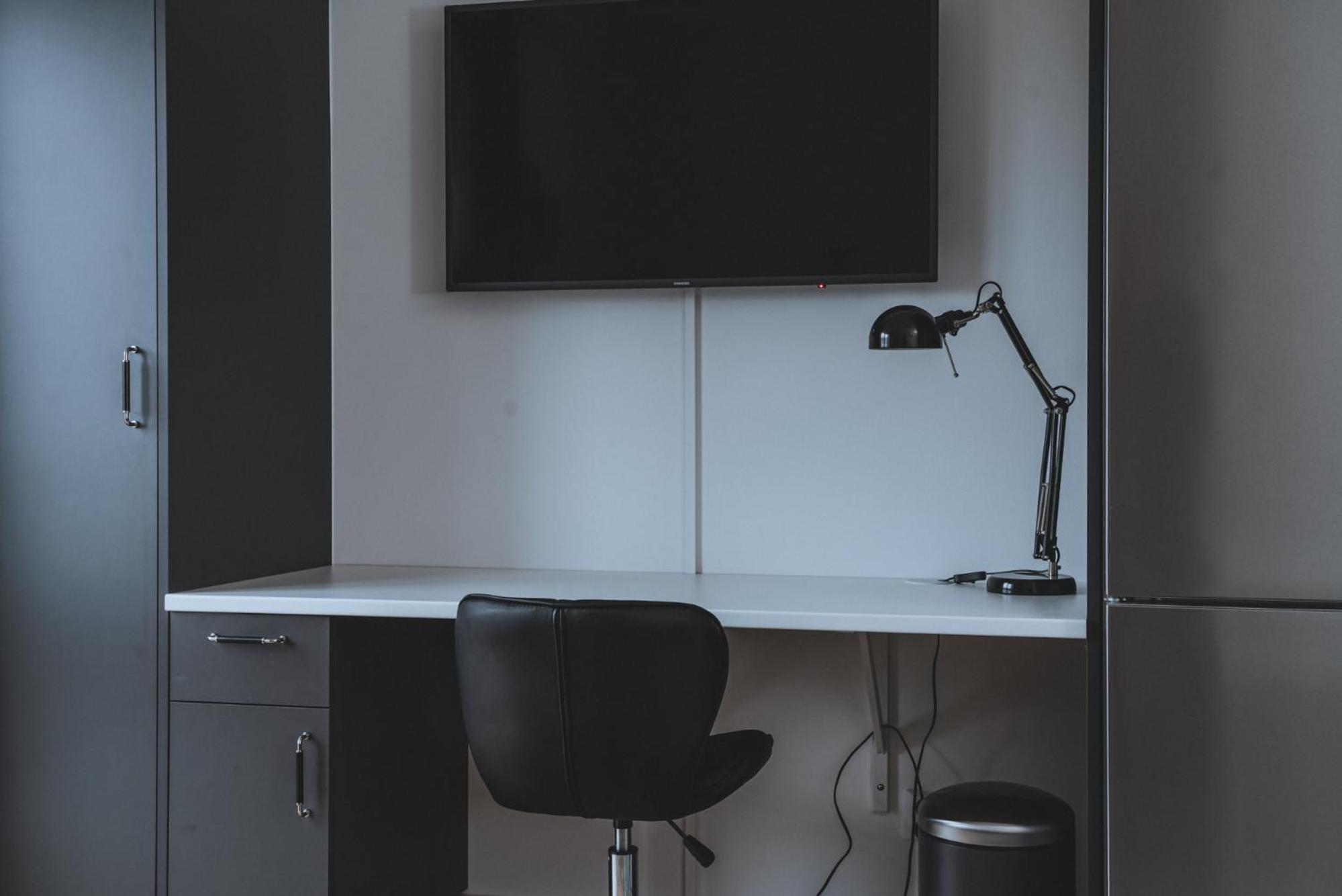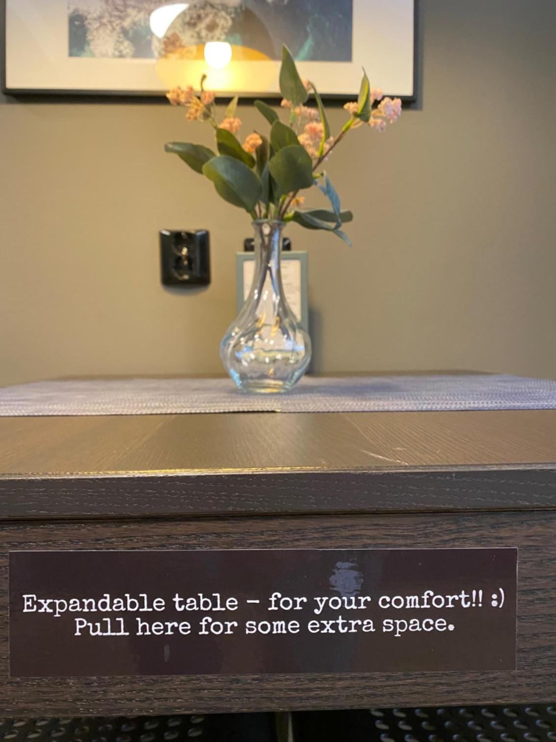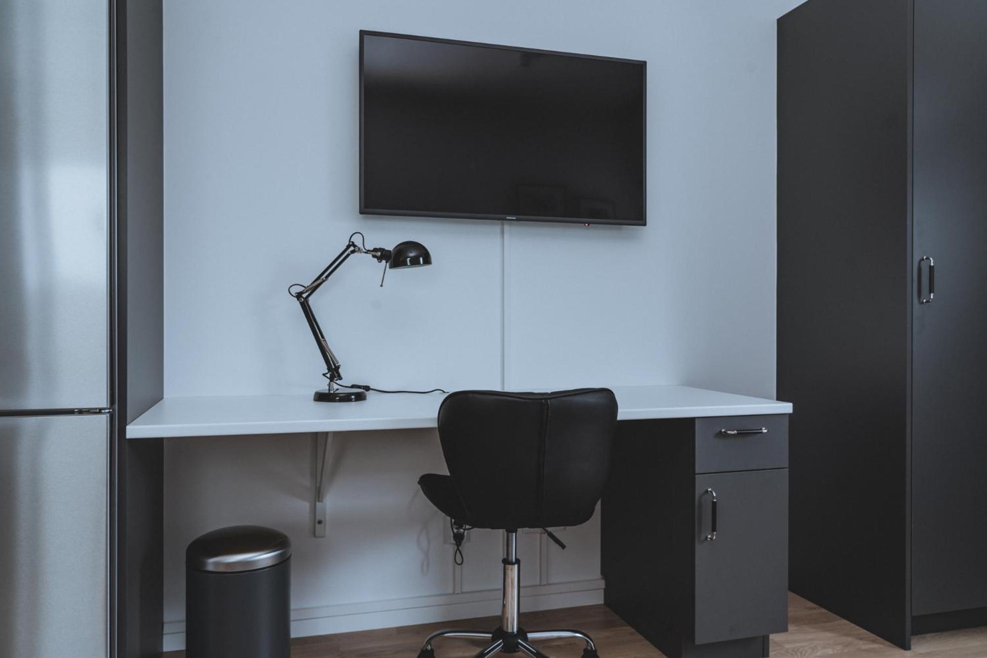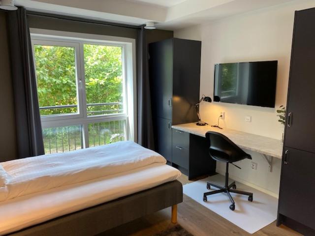 The room is spacious, with a large kitchen, nearly complete. The bathroom has a heated towel rack. There is a work space and a large television. The window looked out on a nice view. The bed was comfortable.