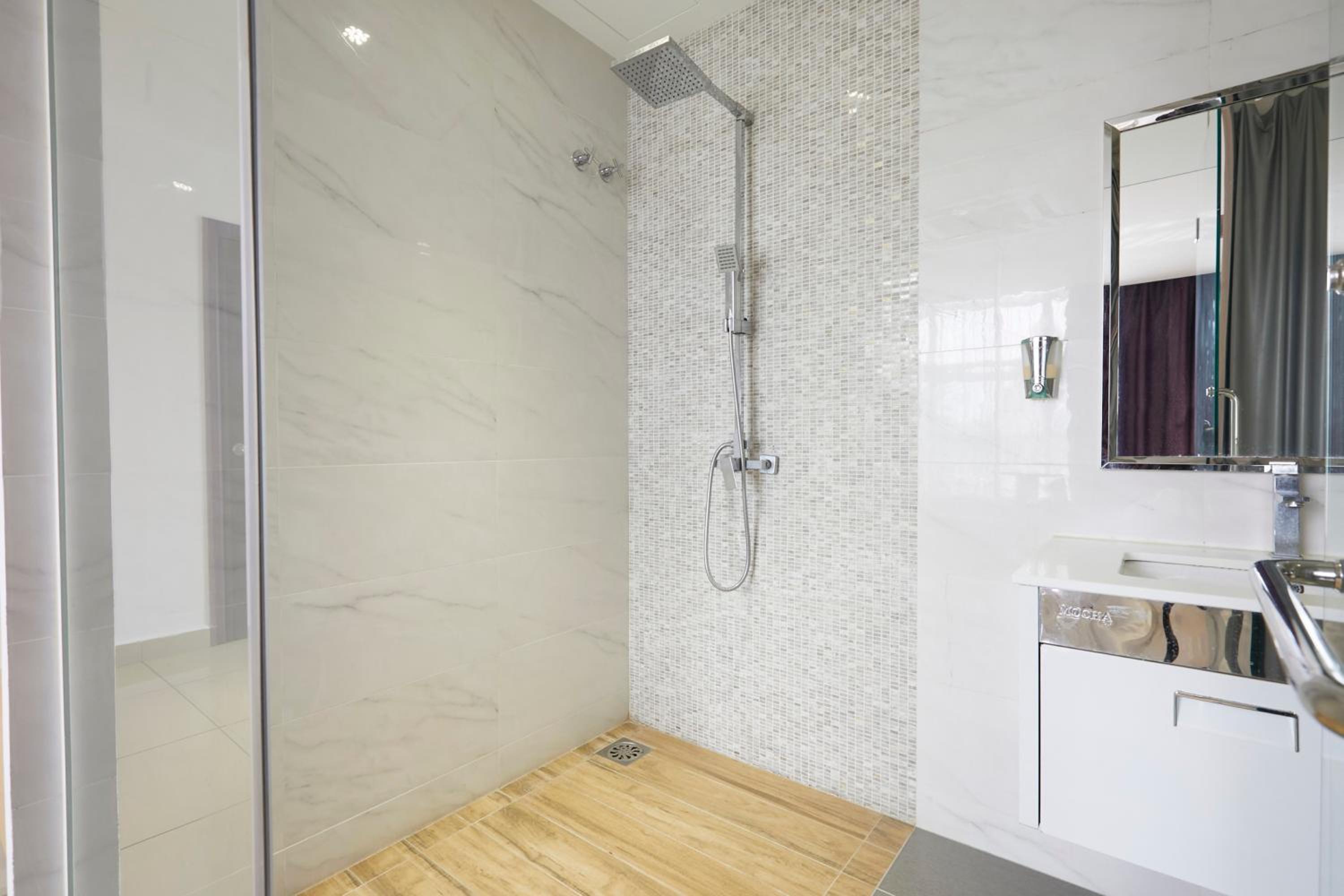 *Glass doors and walls, but available blind to cover (also moldy), glass door is not sealed properly, water hose direction point at glass door, each time bathing means flooding to the room.