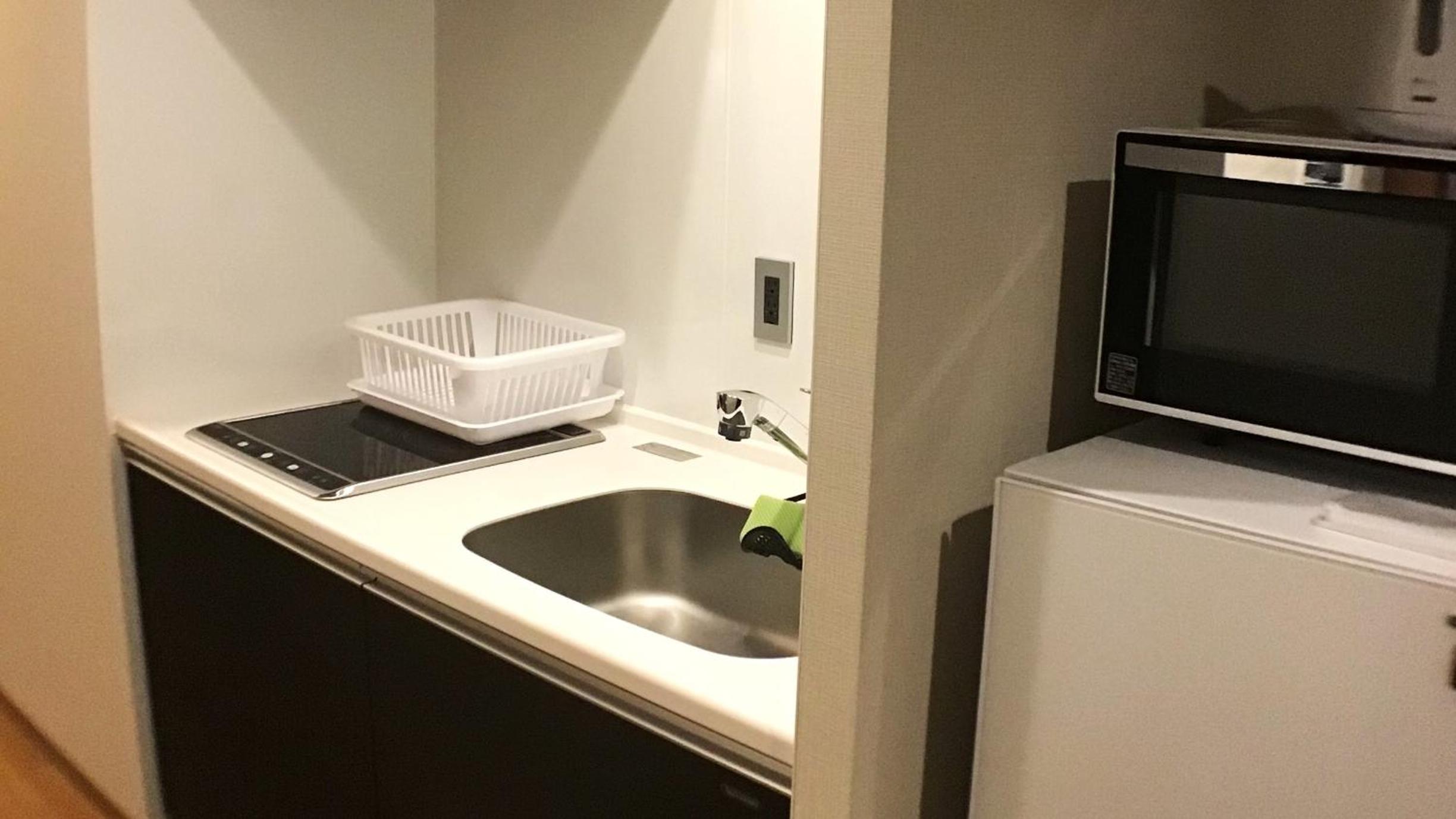 The kitchen is clean with all the basic utensils.